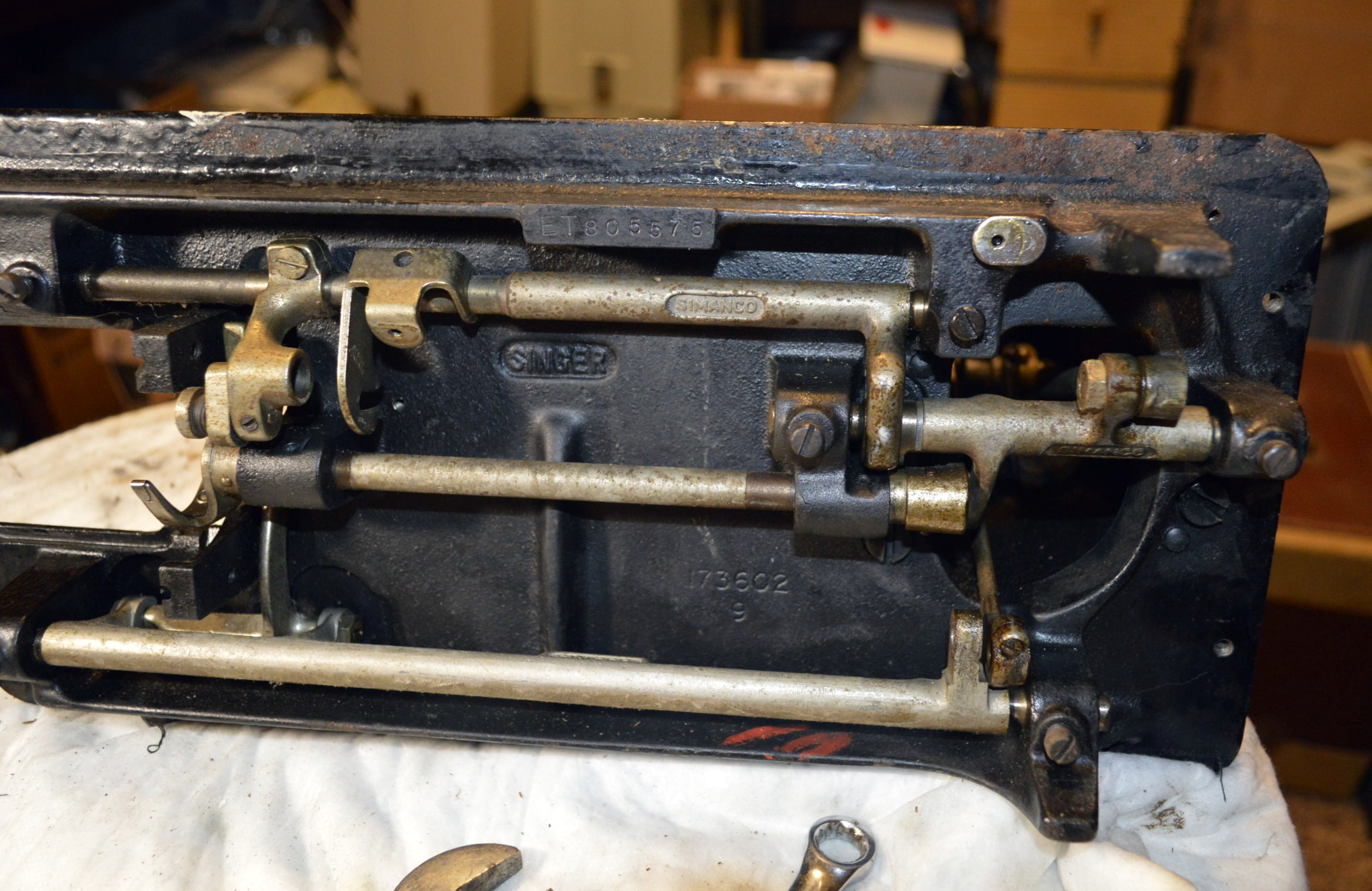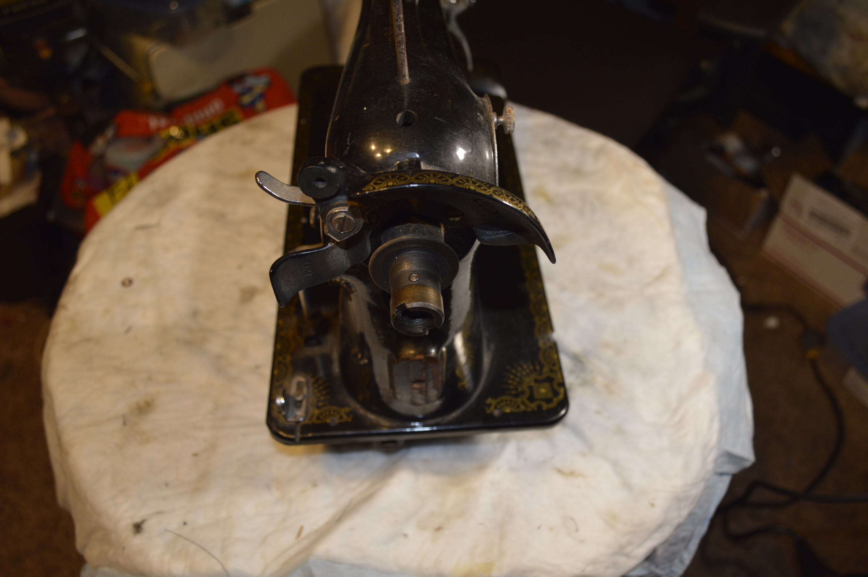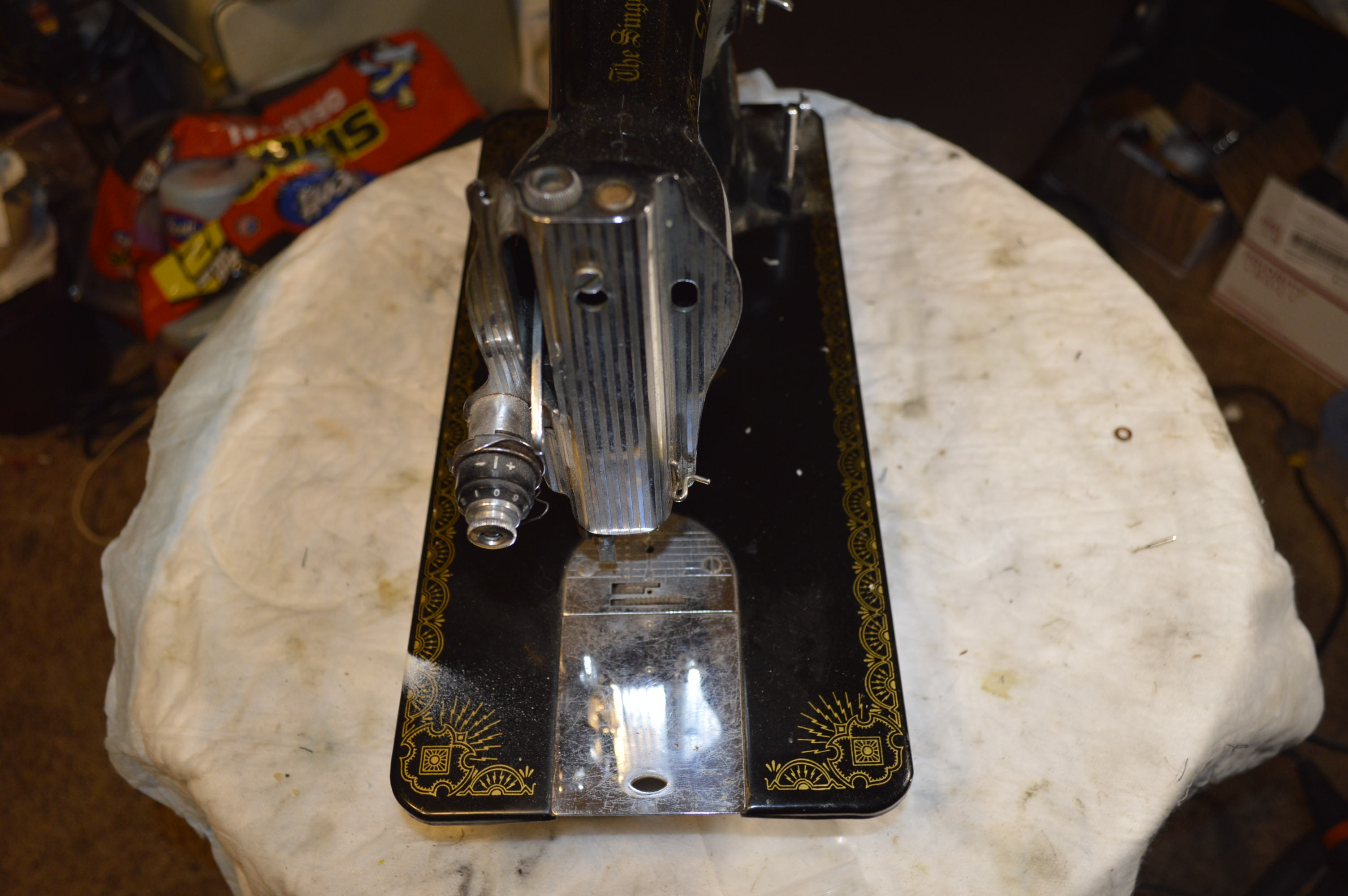 About the machine… Singer began production of the model 15 in the early 1870’s and it was in constant production until the early 1960’s. Essentially it remained the same machine with a few features added in its evolution. The last model produced was the model 15-125. Many are familiar with the Singer model 15-91 because of its gear drive and potted motor, but they were manufactured in different variants. This one is belt driven by an external motor. The Singer machines made in Great Britian and Scotland were designated with a “K” following the model number. This Singer model 15K-110 simply signifies that it is a model 15 made at Singer’s Kilbowie plant in Scotland, and it is the 110 series. No, it is not rare, but it does represent the first model 15 that Singer produced with the feed dog drop mechanism activated by a knob located on the sewing bed, adjacent to the sewing arm pillar. This will be important later. For now, lets just focus on the process.It also has the RAF decal set (yep… Royal Air Force).