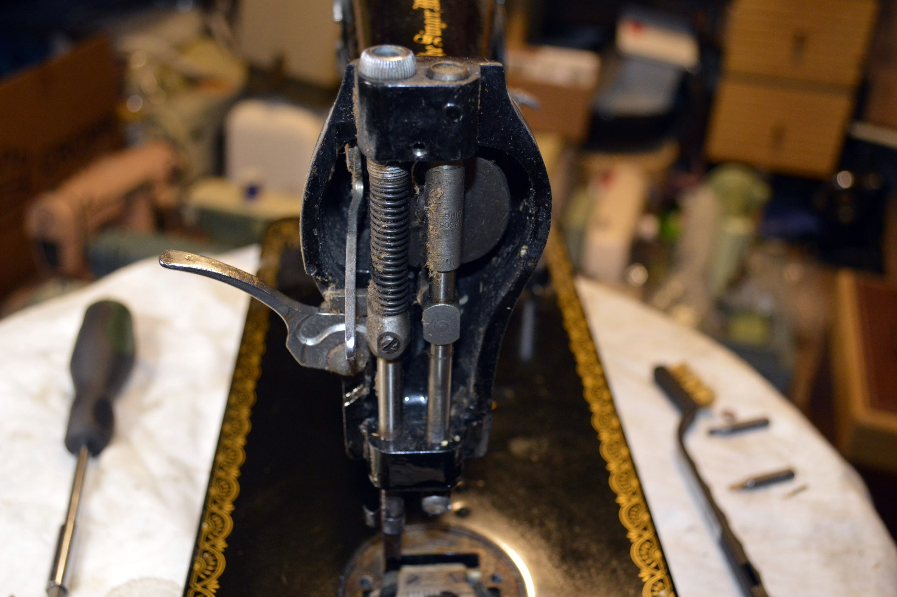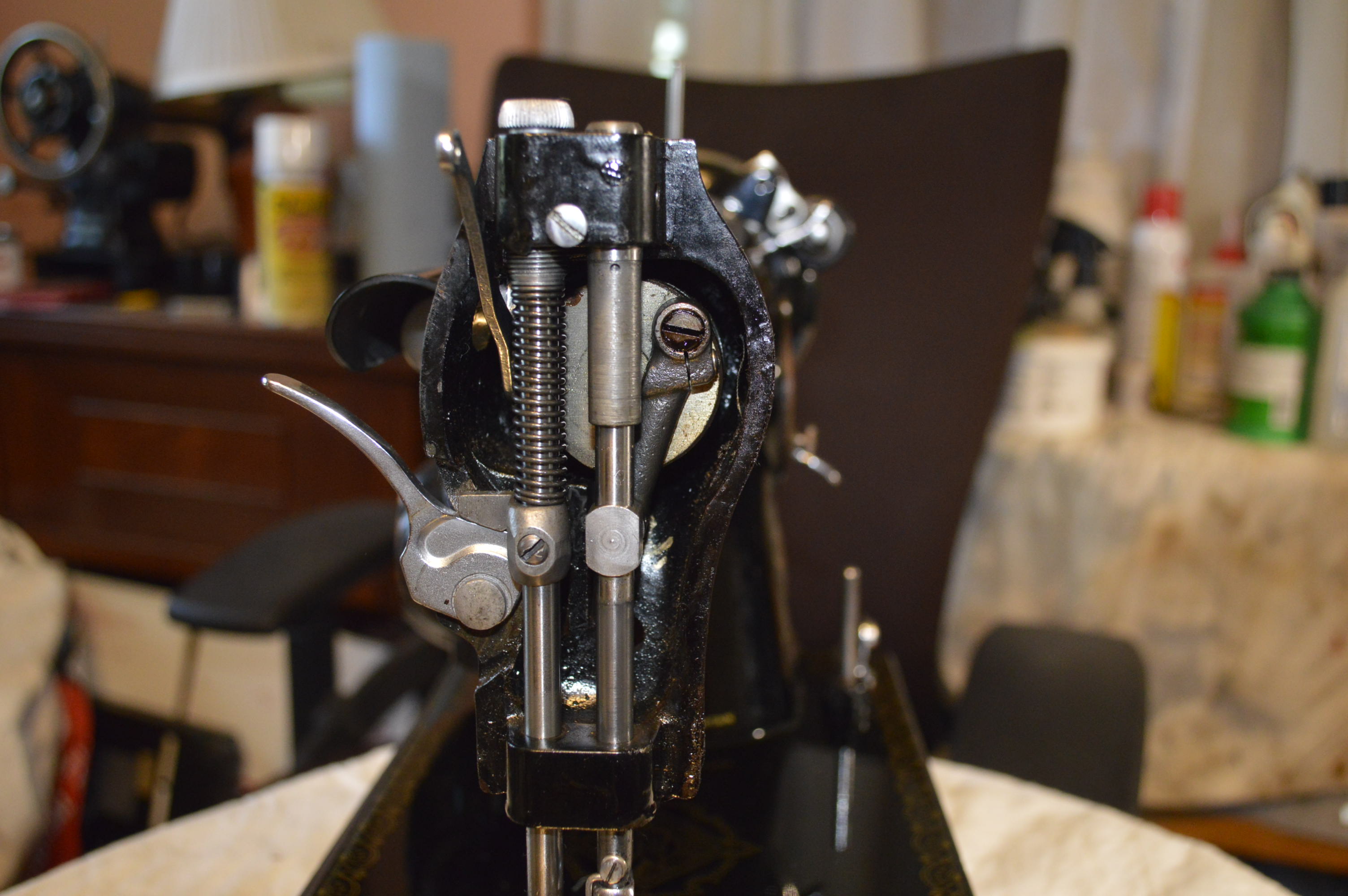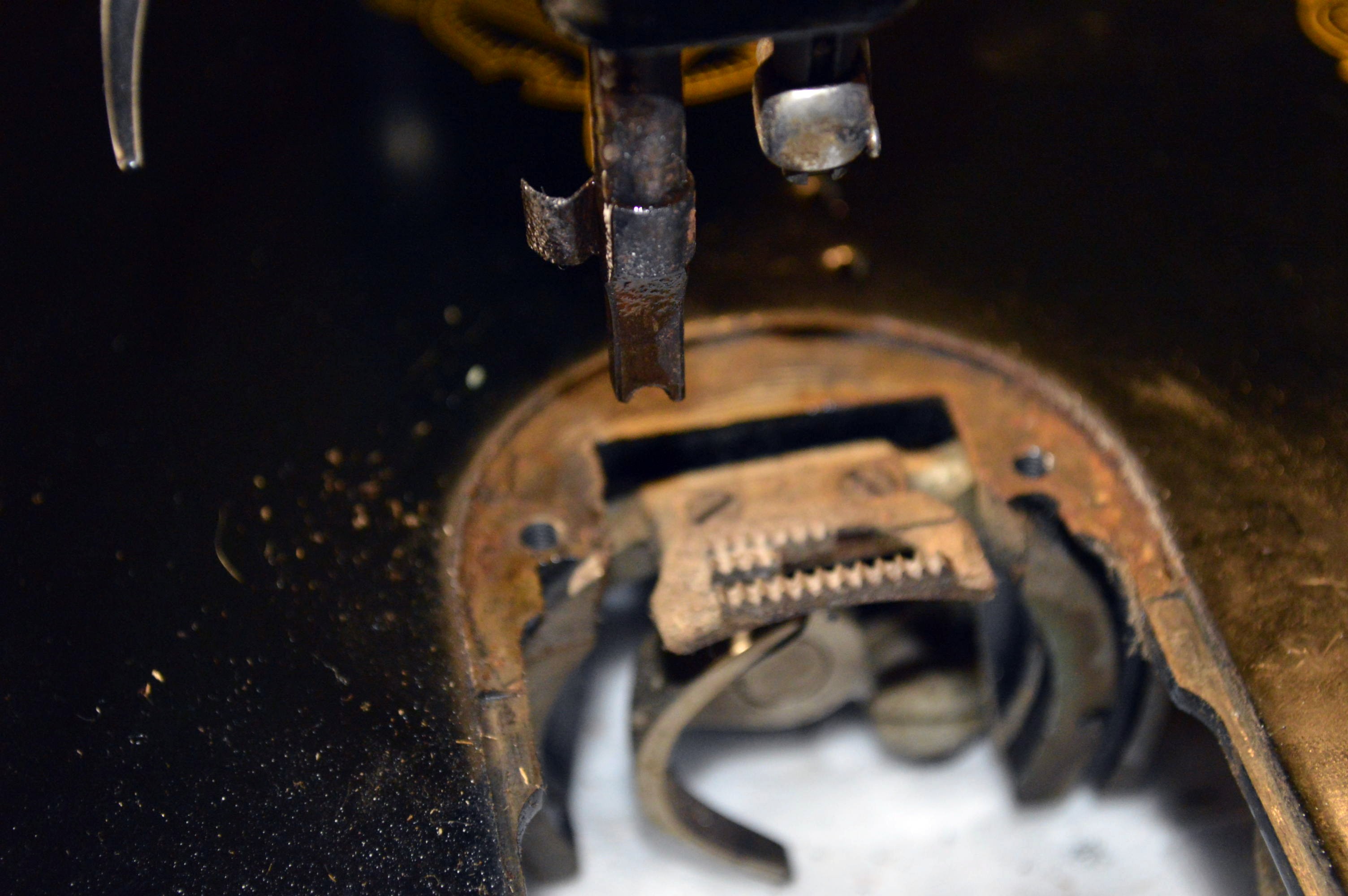 I simply put a bolt in place of the retractable pin it is supposed to have. This means that the feed dog drop is disabled, much like the earlier model 15’s before they had the ability to drop the feed dogs at all. If I ever come across the correct parts, it will be easy to get the mechanism working as it should. That’s it! Not so bad after all.