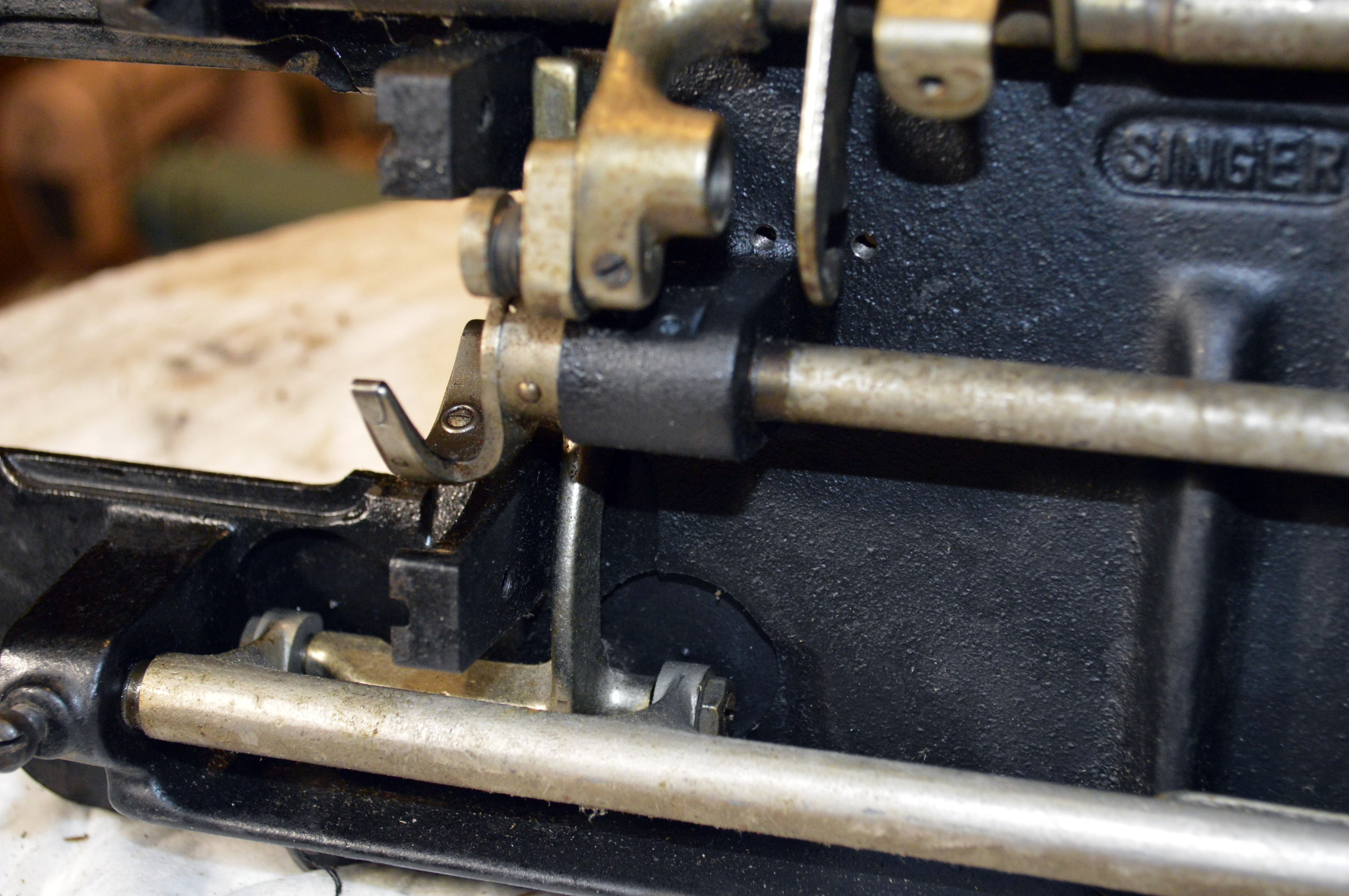 Now, here’s the thing that is different on the 15K110 from other model 15’s,… Remember I mentioned the drop dog feature being located on the bed adjacent to the pillar? Well, it turns out the entire linkage and engagement mechanism is missing. To make things worse, I can’t find a replacement part anywhere. This wouldn’t have affected my buying decision as a donor machine, but it might have if I knew that this was the machine I was going to spend hours on reconditioning. I will have to keep looking for the parts. They may or may not ever be found so I have to make a choice. Either will disable the drop dog function. I can use the same part from the older donor machine, or I can lock the existing mechanism linkage in place with a bolt. The other part that needed to be replaced was the presser foot bar, but fortunately, the donor machine supplied this part.