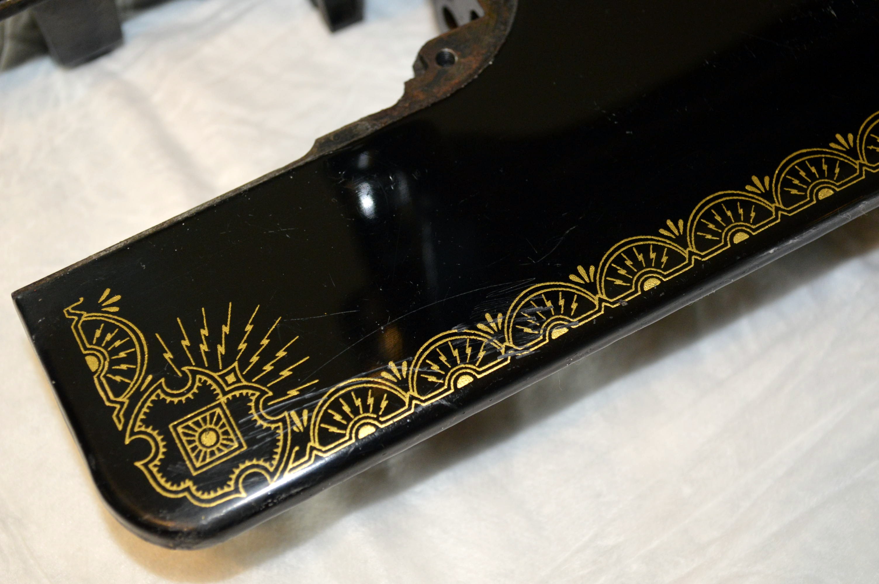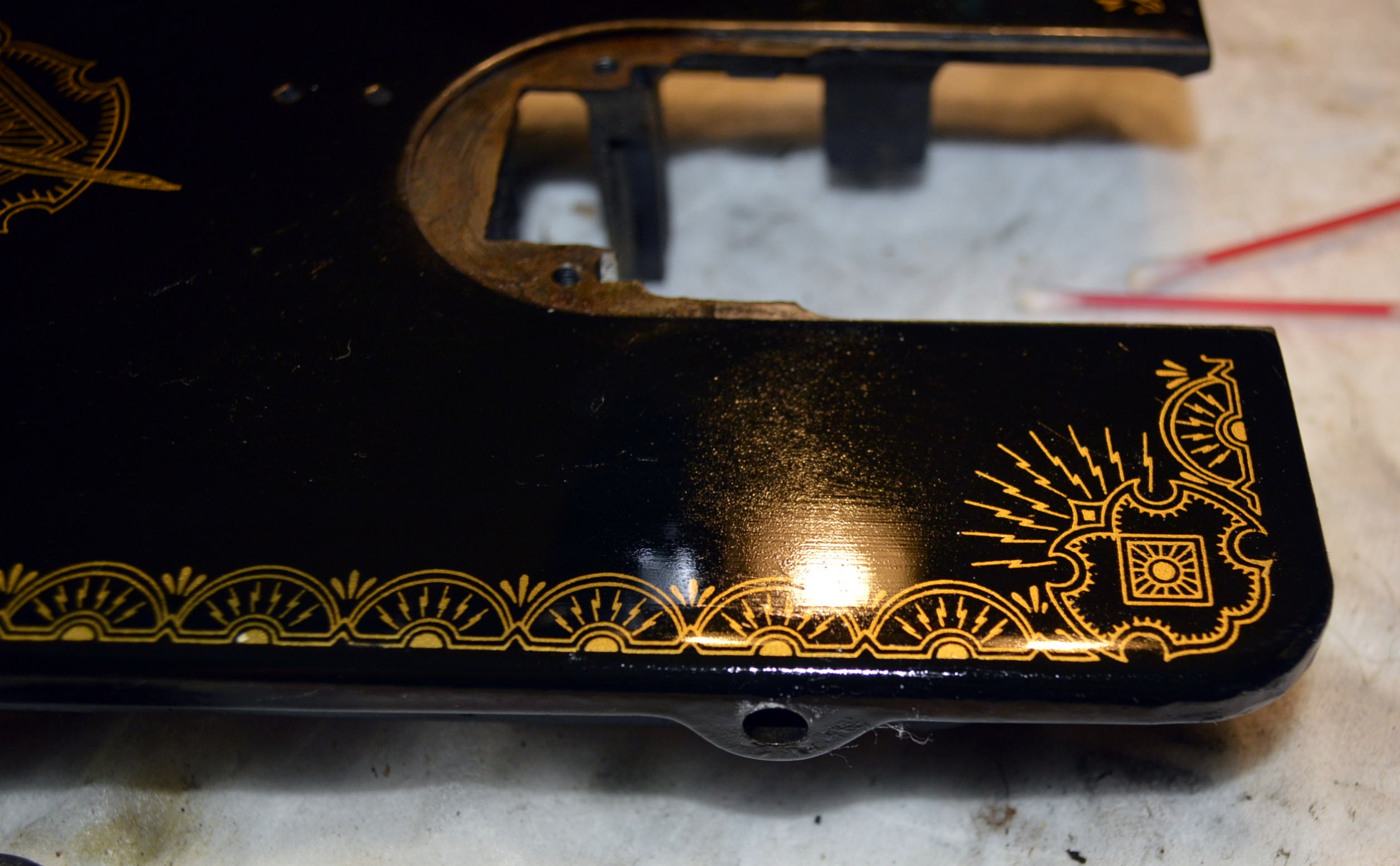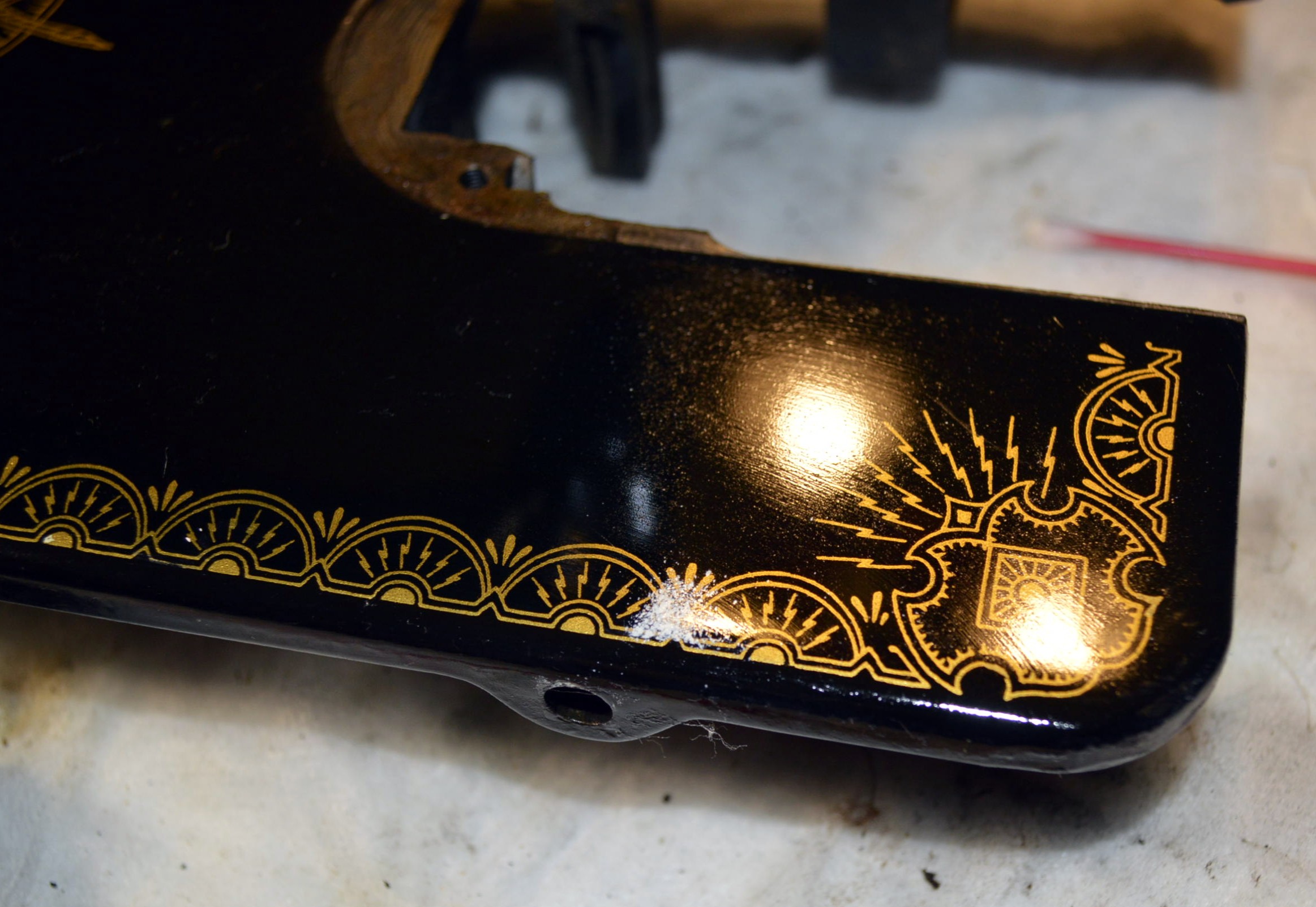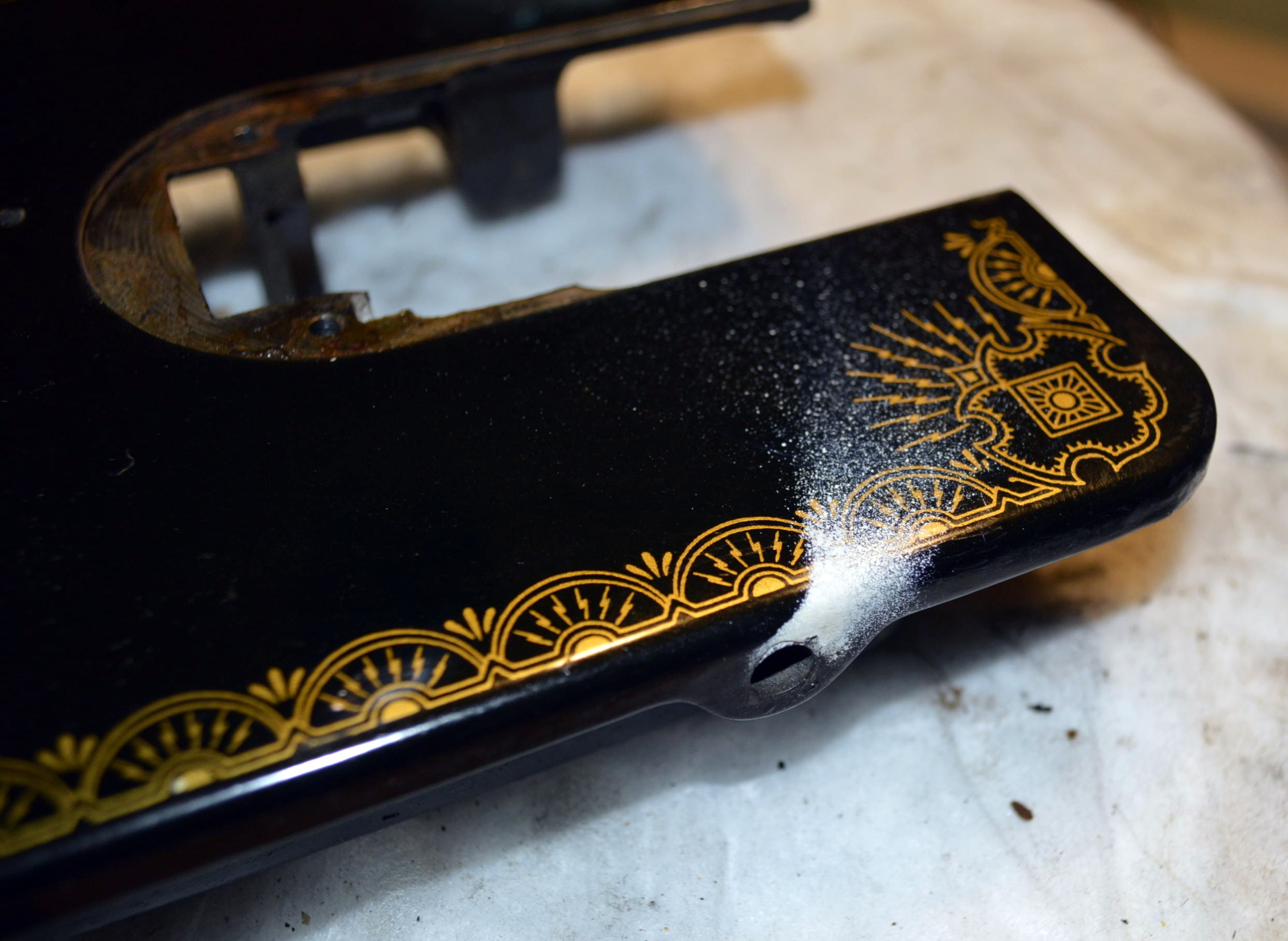 To better assess the condition and coverage of the shellac coating and identify sensitive areas, shine a flashlight close to the machines finish. The shellac coating will appear with a green hue. Often you will see the green hue with patches and areas that are jet black. These black areas are the original black lacquer japanned finish, and the shellac has worn away. Be especially attentive to the decals. If they are covered with the green hue, they are protected and can be effectively cleaned, if not, they are unprotected and must be cleaned gently with nothing but sewing machine oil. Luckily, the shellac coating on this machine was in very good condition.