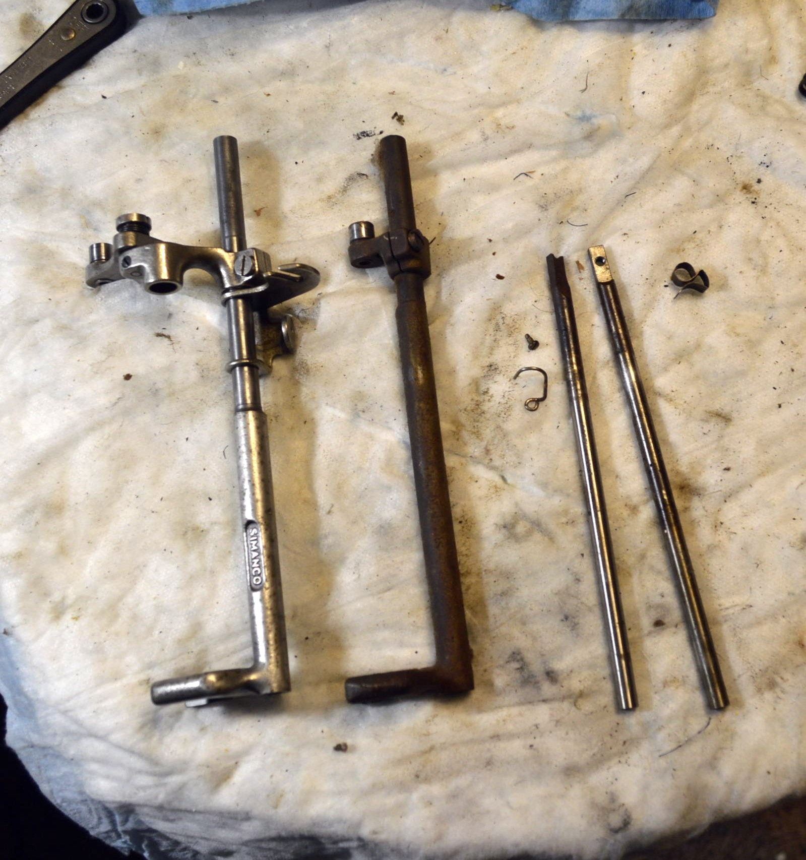 There are two rods that go thru the pillar. The rod on the left has a forked end that engages an eccentric cam for the stitch length control. This fork and the associated stitch length control mechanism will be removed.