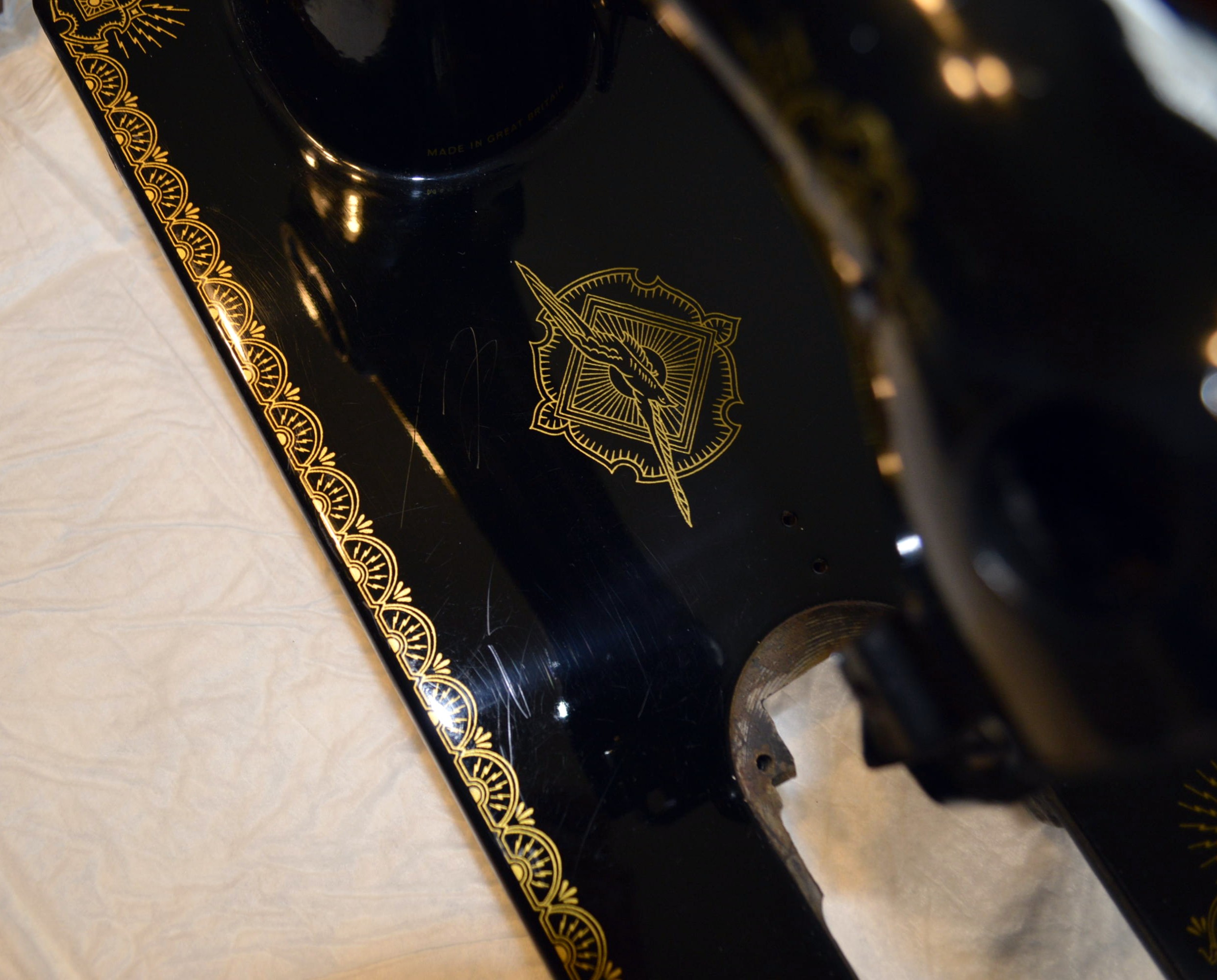 This is the Singer 15K-110 in basically the condition I got her in… except for a little oil I applied to the sewing bed to assess the lacquered finish. Notice the distinctive “RAF” decals?