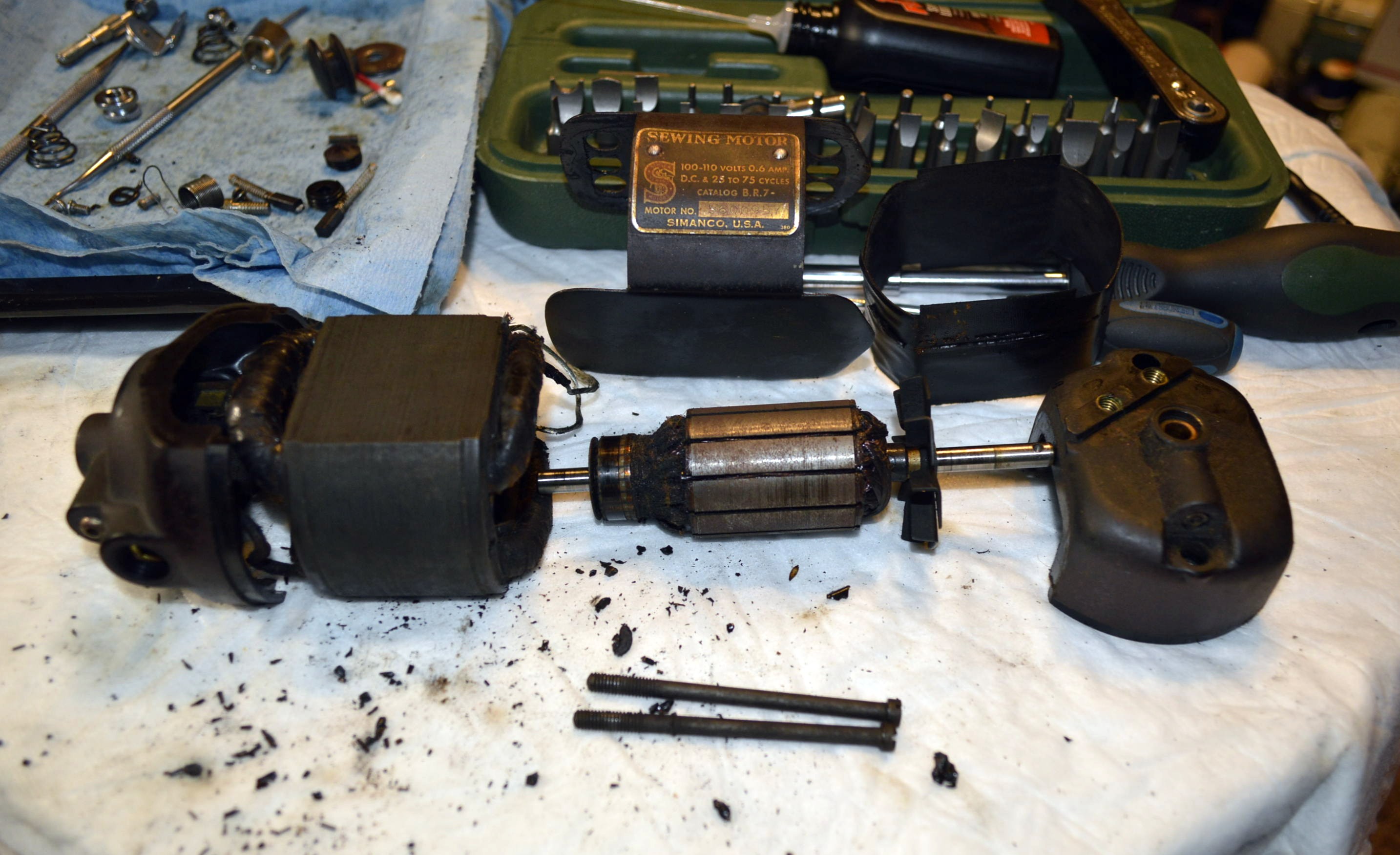 Now on to the motor… One of the most valuable aspects of what sets reconditioning apart from merely servicing a sewing machine is the reconditioning of the motor. The motors that Singer designed and manufactured are fantastic examples of durable construction. Even after 80 or more years, these marvels just keep turning. Imagine the condition of the inside of these motors after all these years! Wait… I have pictures!
