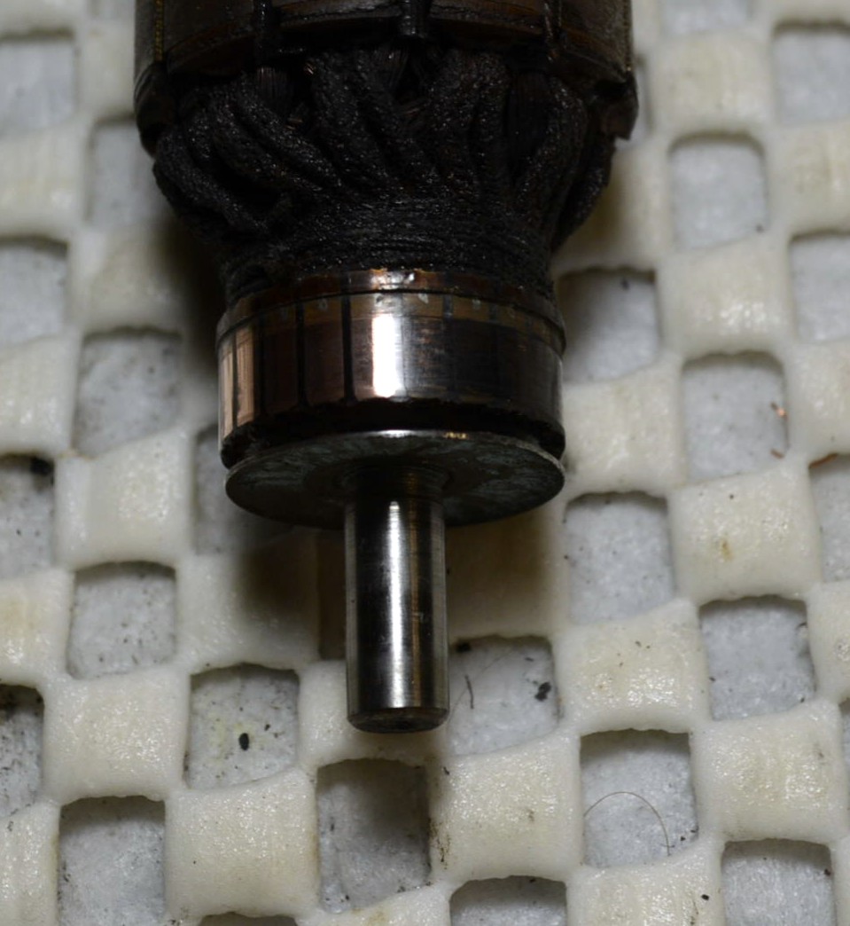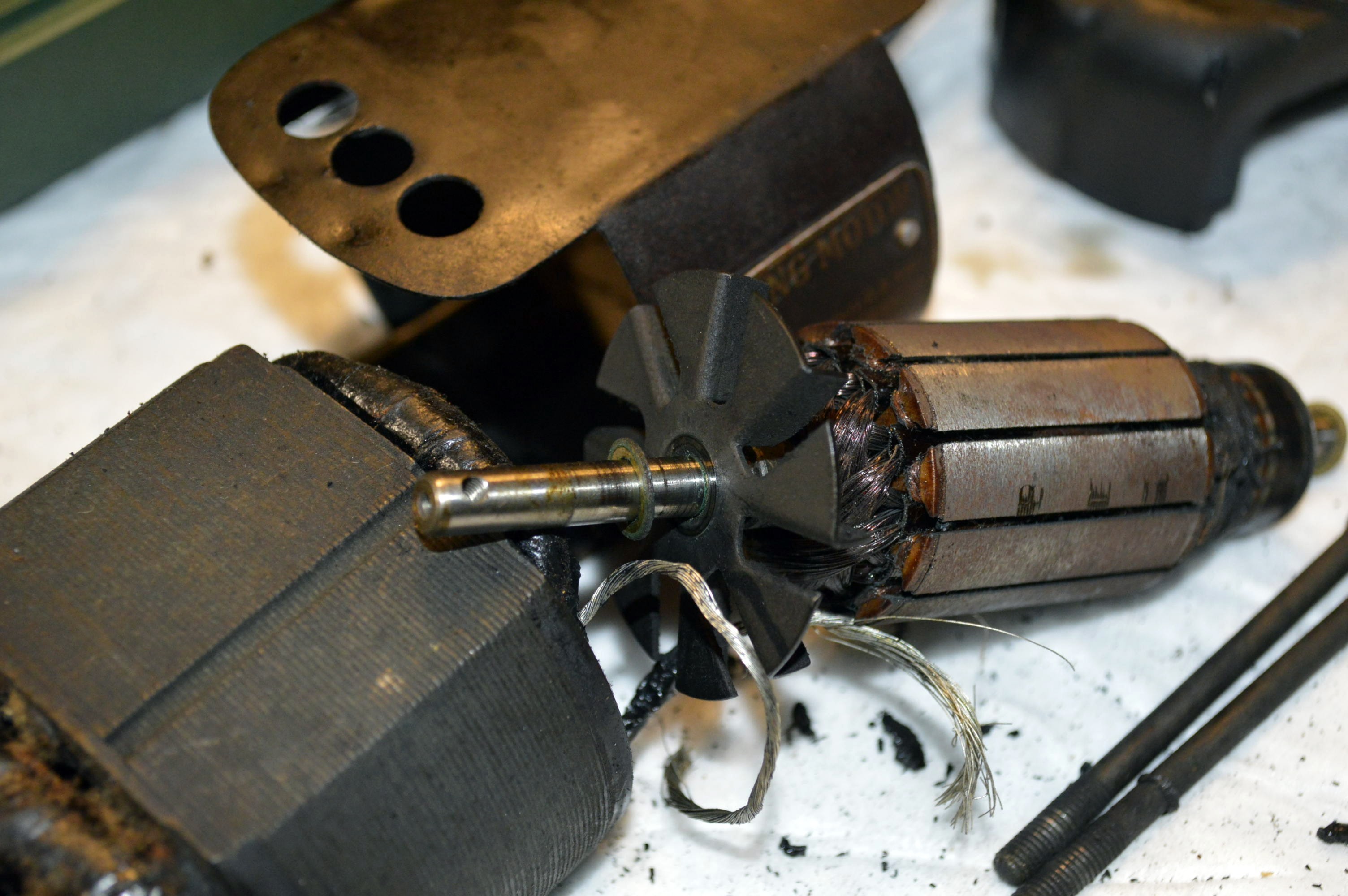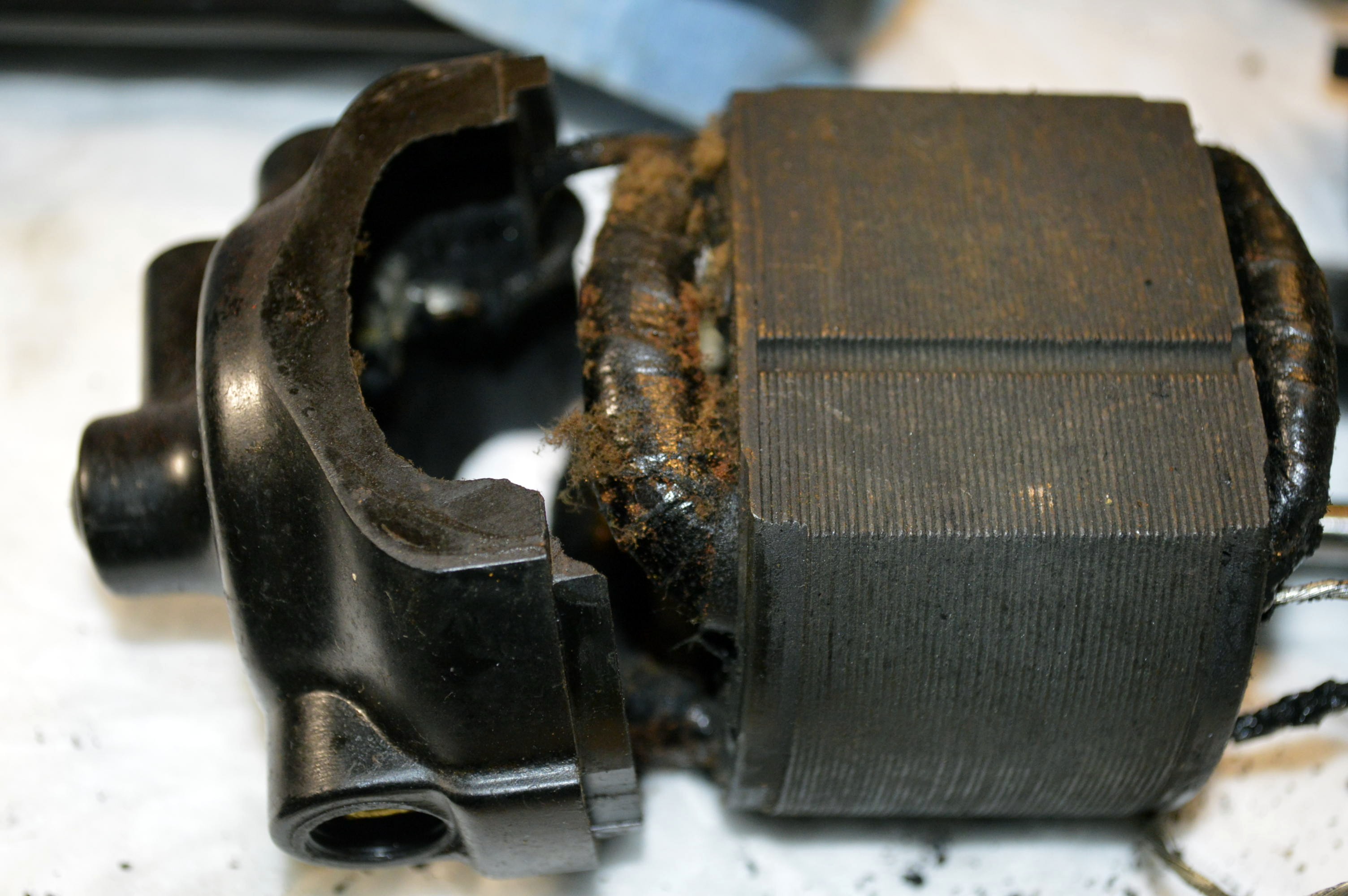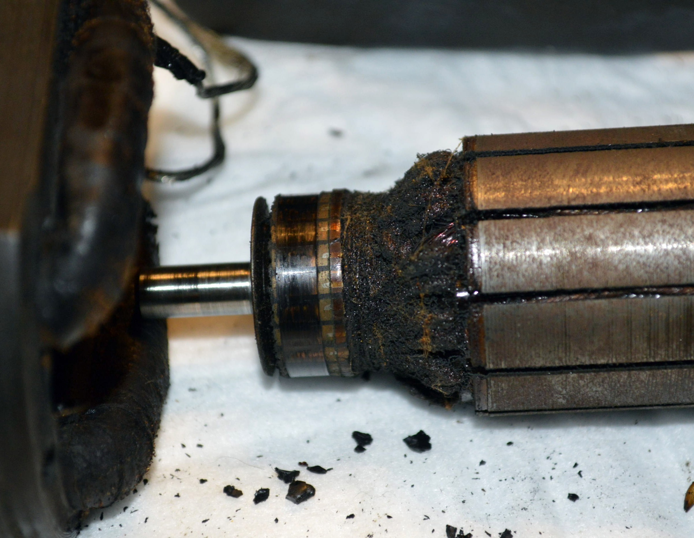 At first glance, and from the bits of dirt, dust, and old wire insulation, it looks pretty bad. The armature is fouled with carbon and the wires are bare up to the stator coil. Actually, this is not unusual and will be fixed. The motor brushes are in good condition and unless there is a break in the armature or stator coil wires, this motor will run again.