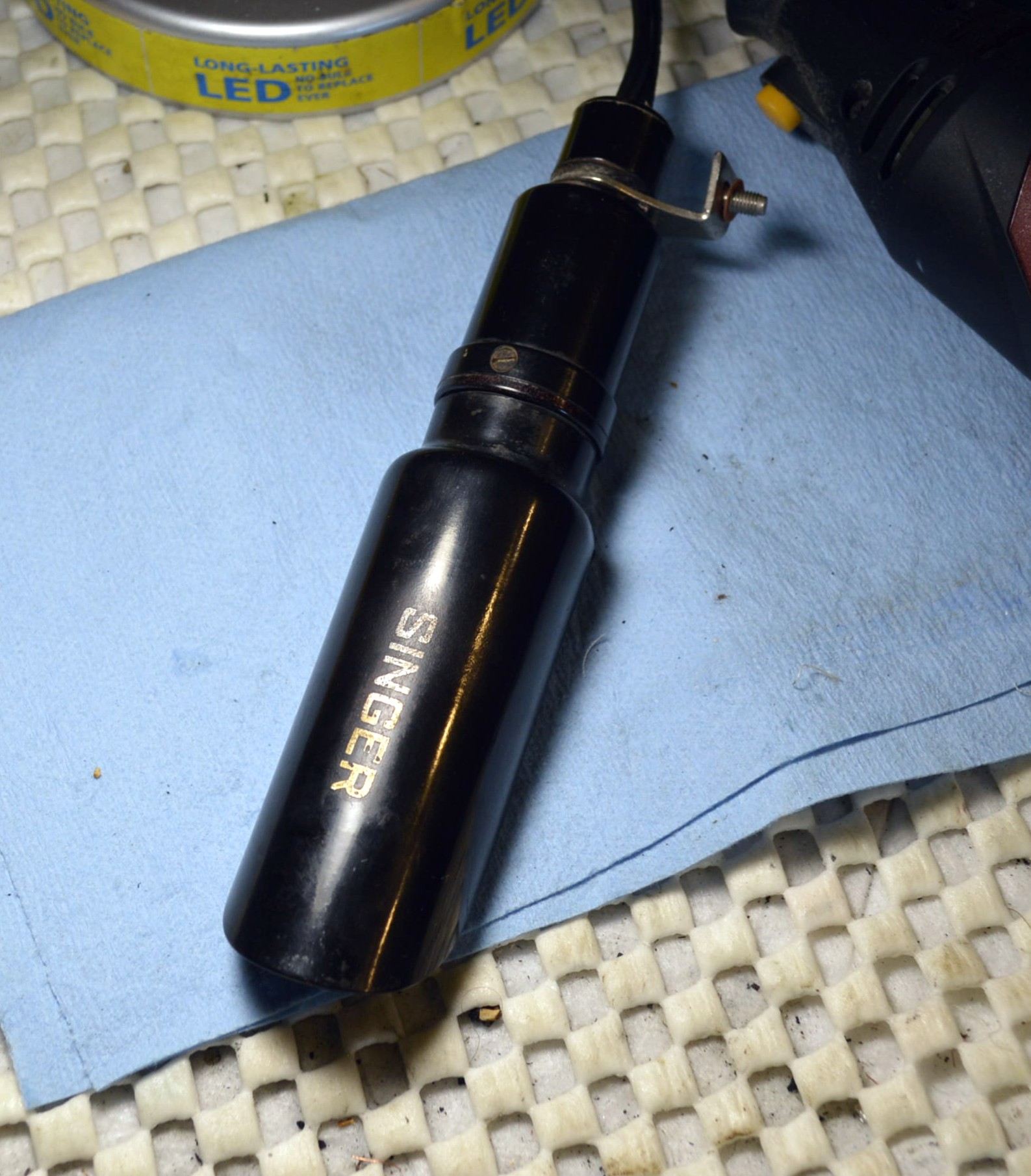 As you can see, the light shroud has some “haze” around the decal. This is actually a rust colored paint over spray from some event in its history. It must have been primer, because it was very difficult to remove. It took several hours and lots of cotton swabs to clean the fixture. Rather than sacrifice the decal, I was satisfied to work to the margins of the decals and leave it alone. Also, the presser foot screw had surface corrosion that went thru the plating. I was satisfied to remove the corrosion and let it be. The Singer badge has damage from corrosion and paint loss. Except for cleaning, I decided to leave this alone. Anything I did would have removed more paint and result in more damage. The stitch length cover was similarly affected with corrosion and lack of paint in places. Here I opted to paint match the area and leave it alone. I felt that any attempt to blend in the repaired area would create more damage. Sometimes it better to leave well enough alone, and tell people these defects and marks of wear adds “character” and are “reminiscent of her veiled and storied past experiences”.