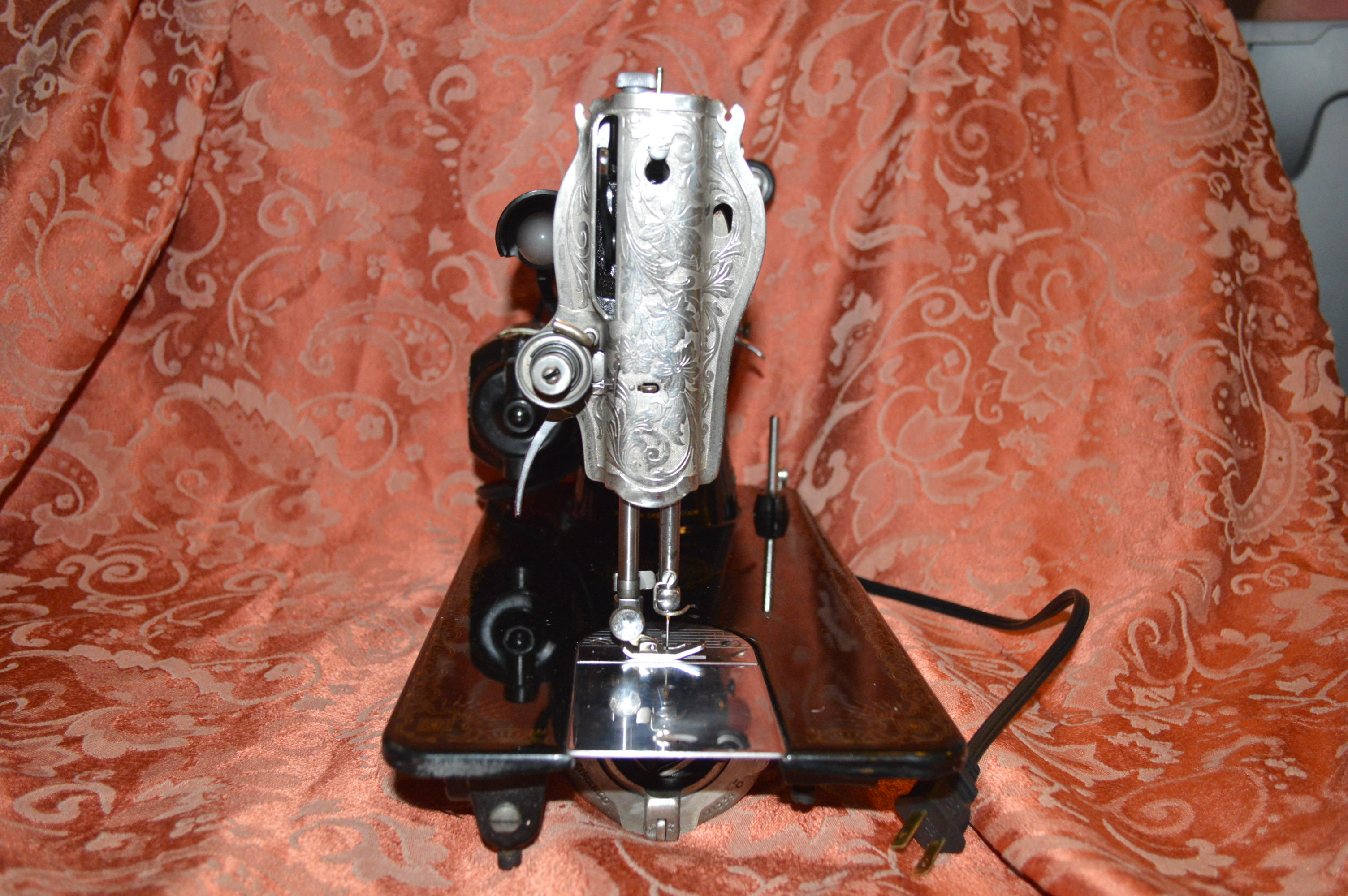 After everything was reassembled and adjusted, the machine was put thru her paces and she sewed very well! Keep in mind… she started out as a donor machine . In fact the roles are reversed. I did use some of the hardware from the 1938 model 15. You may notice the face plate and back cover plate have been taken from the 1938 model 15. I just liked the look of the fancy scroll pattern more than the straight striated covers she came with. I also used the presser bar, motor, light, balance wheel, and tension control from the 1938 machine.