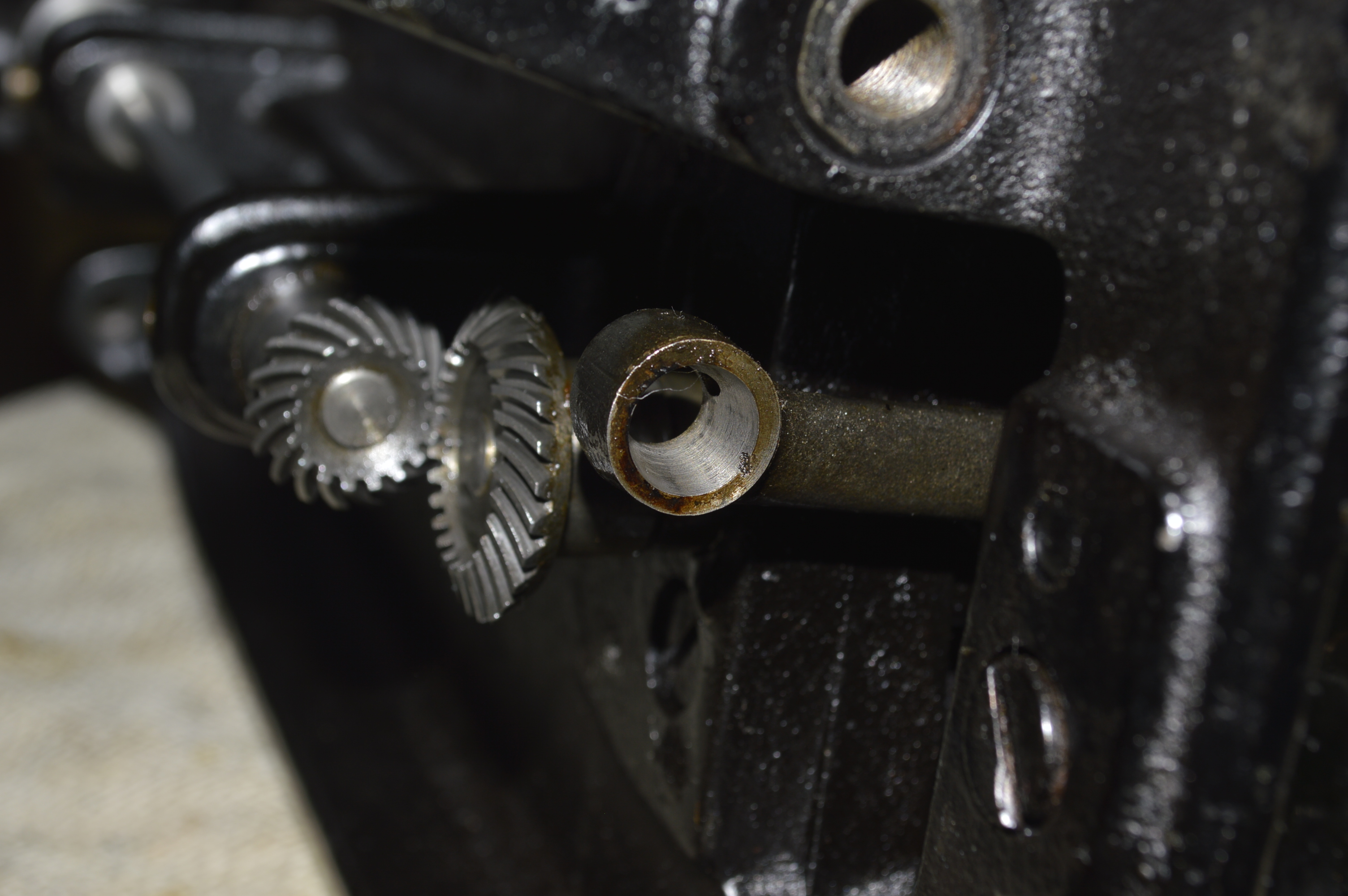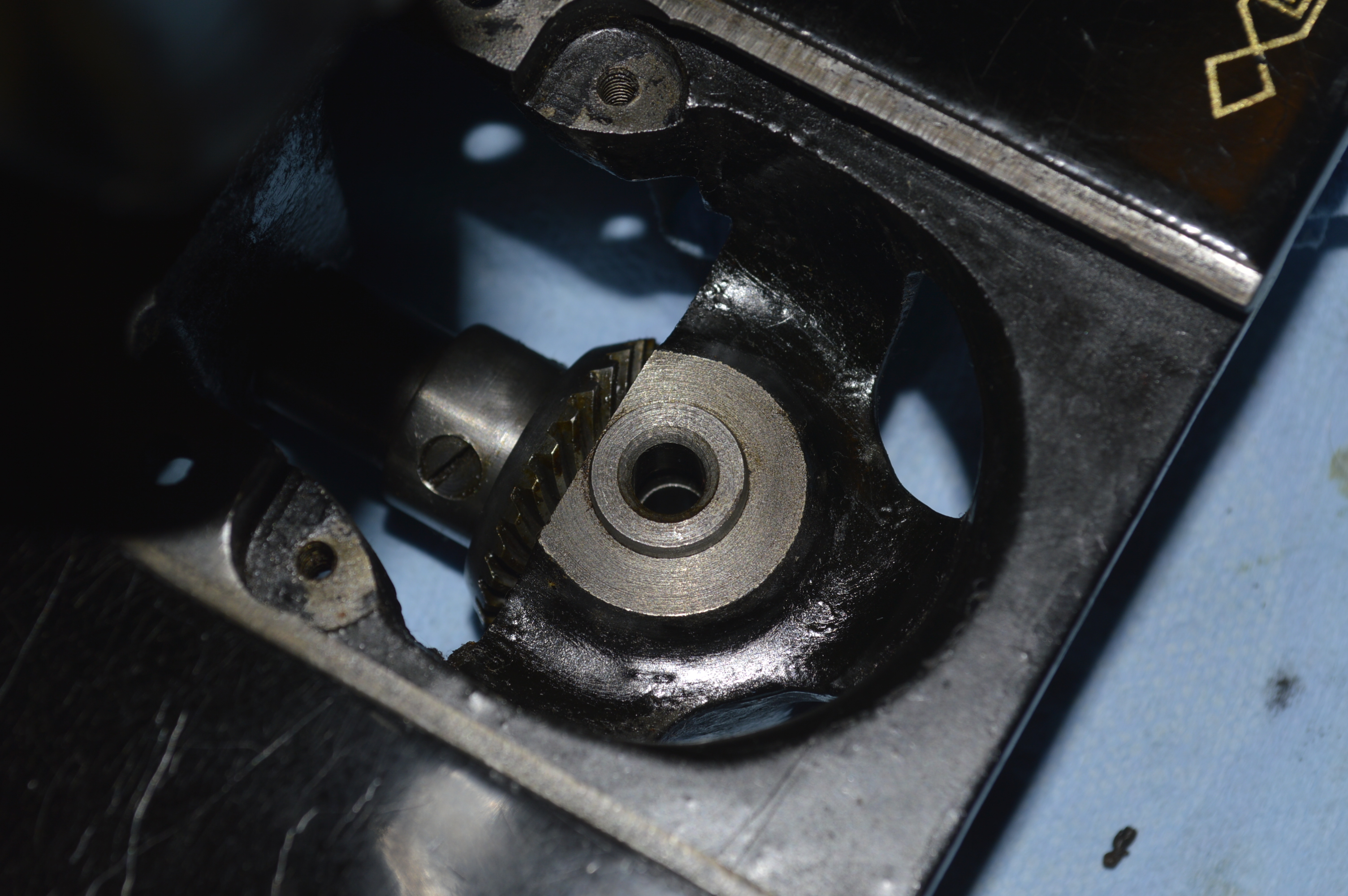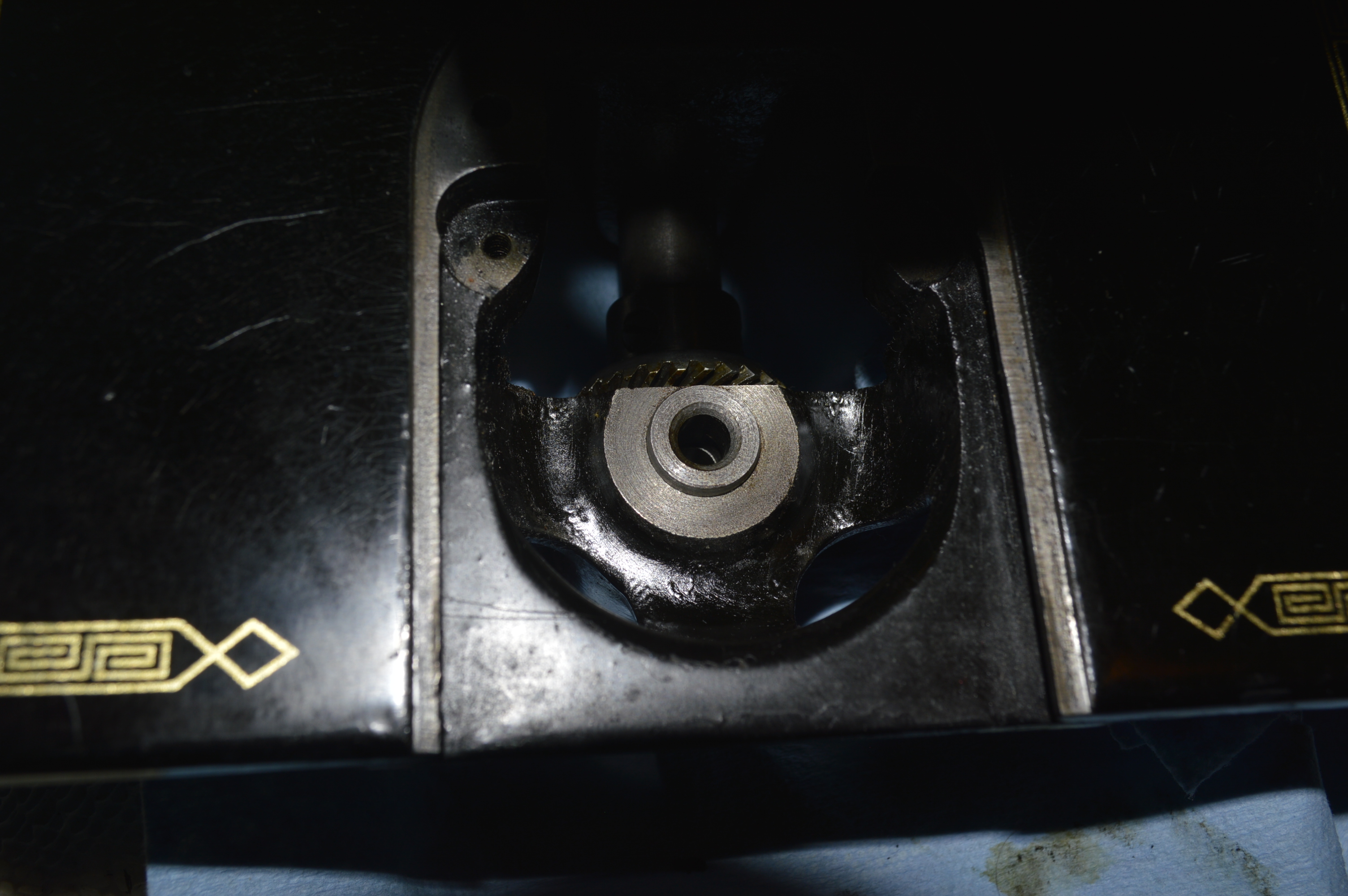 The bobbin hook case shaft is cleaned and polished. This is driven by the gear that needed to be removed to get this shaft off. The gear was etched at adjacent teeth to ensure it was reassembled in the same orientation.