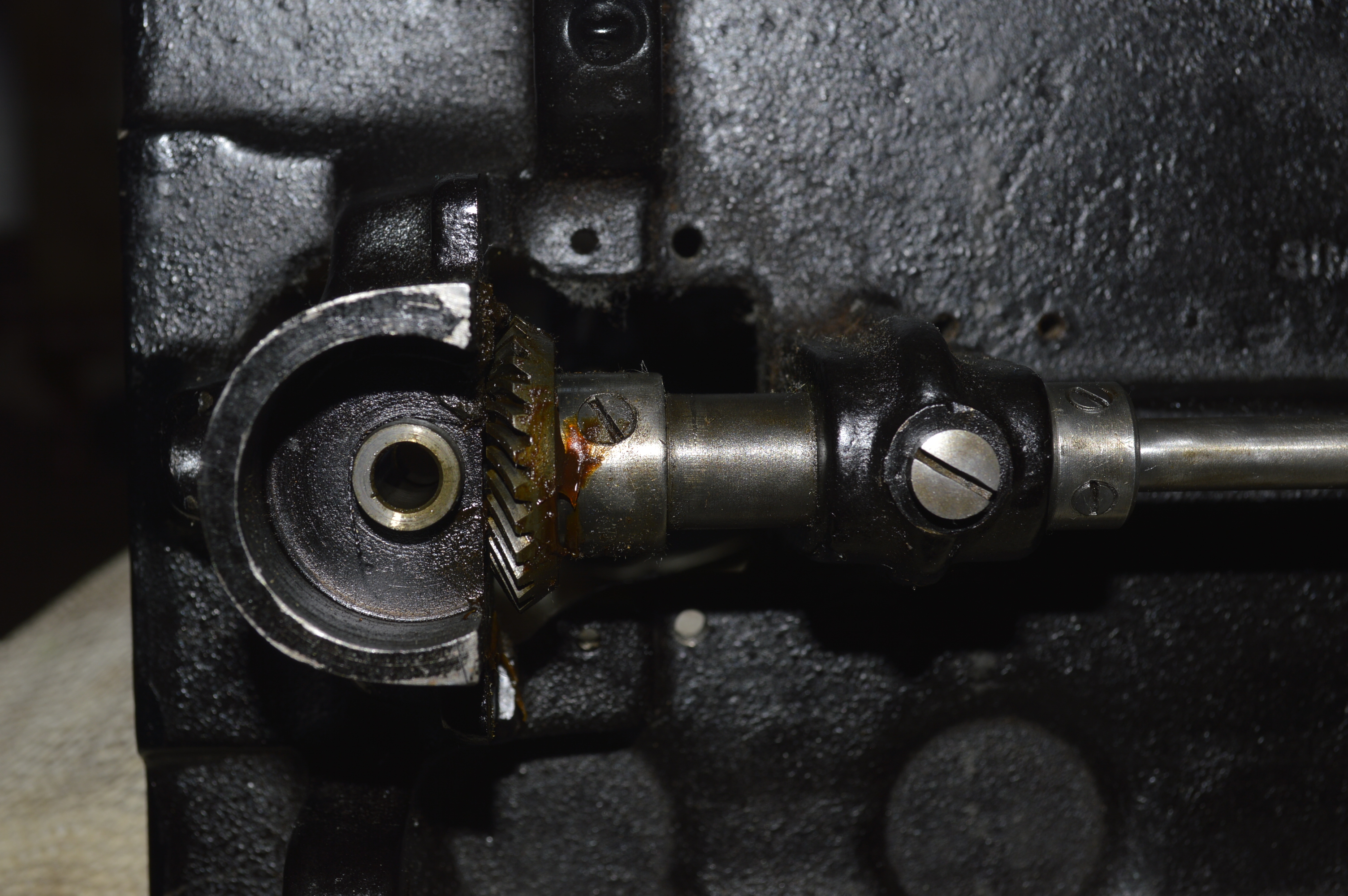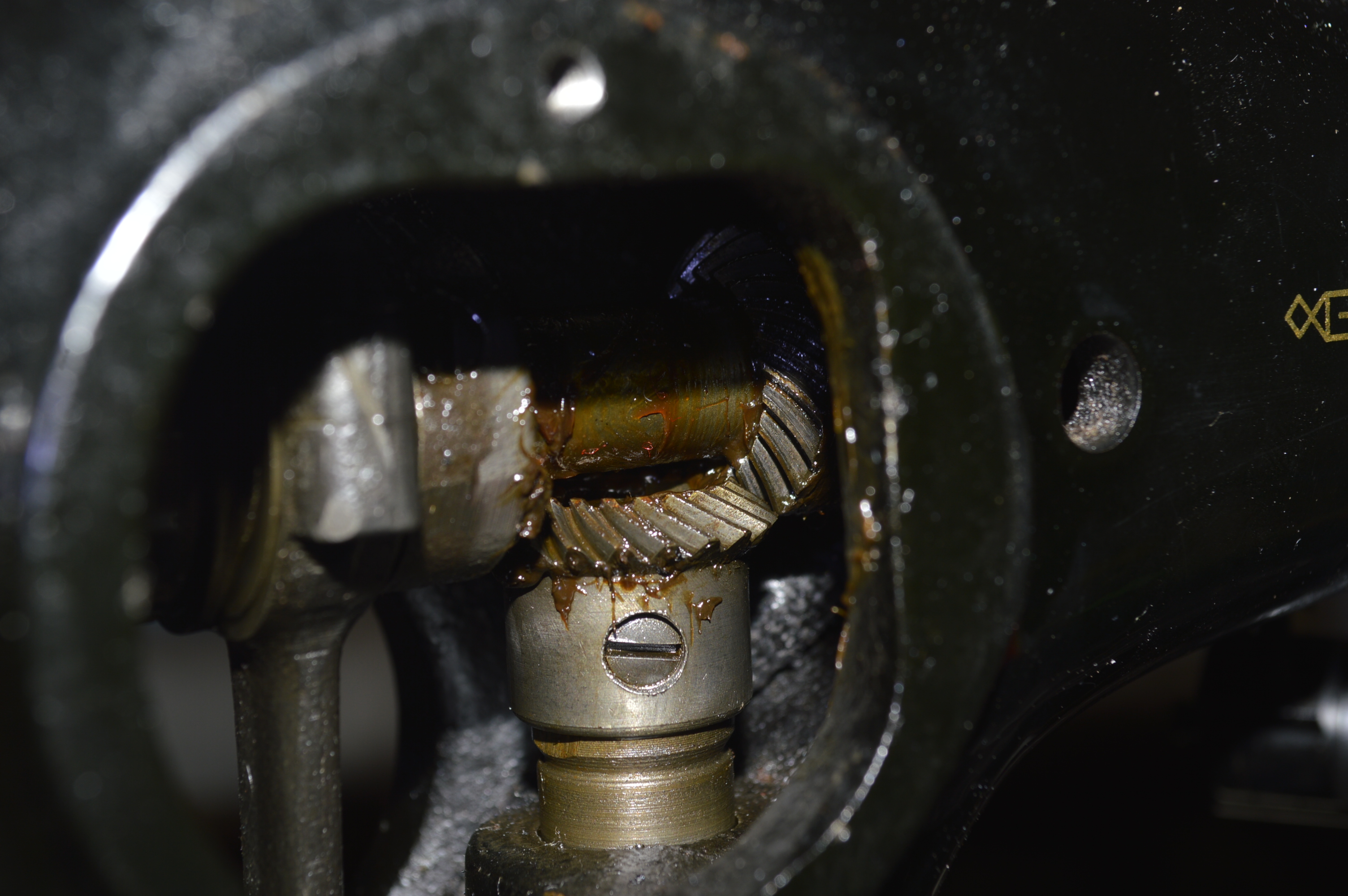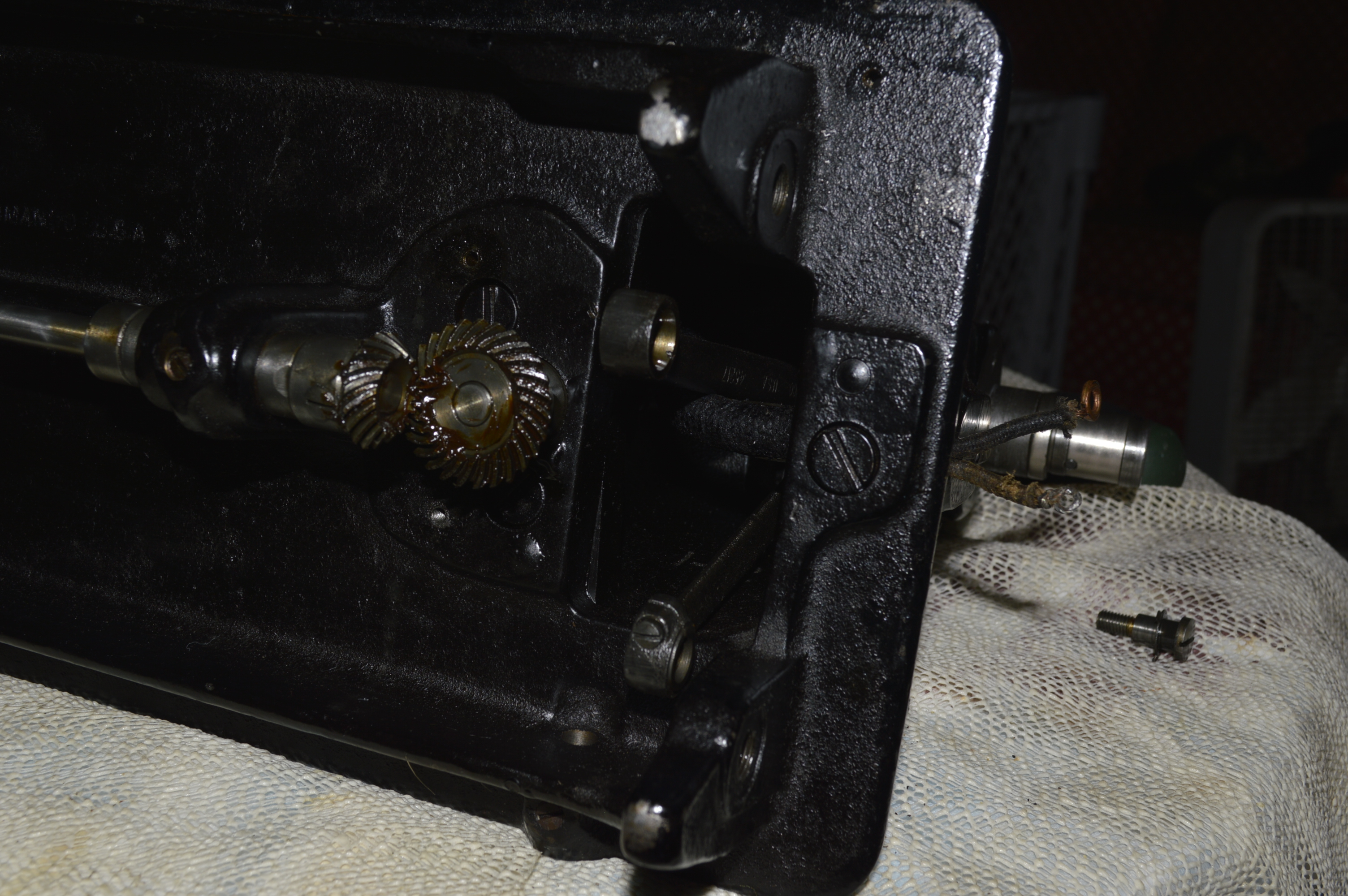 The bobbin hook case shaft is cleaned and polished. This is driven by the gear that needed to be removed to get this shaft off. The gear was etched at adjacent teeth to ensure it was reassembled in the same orientation.