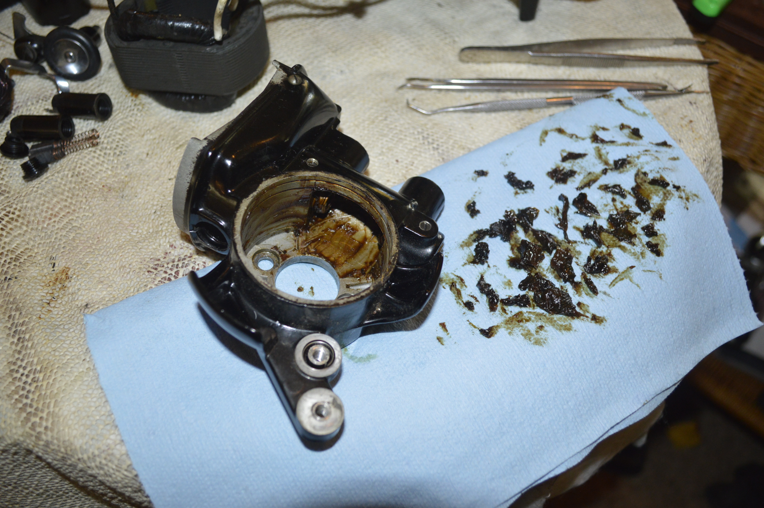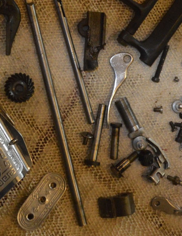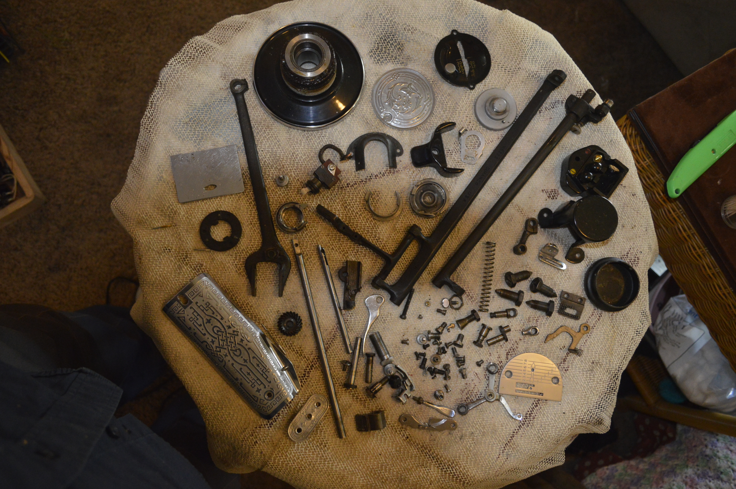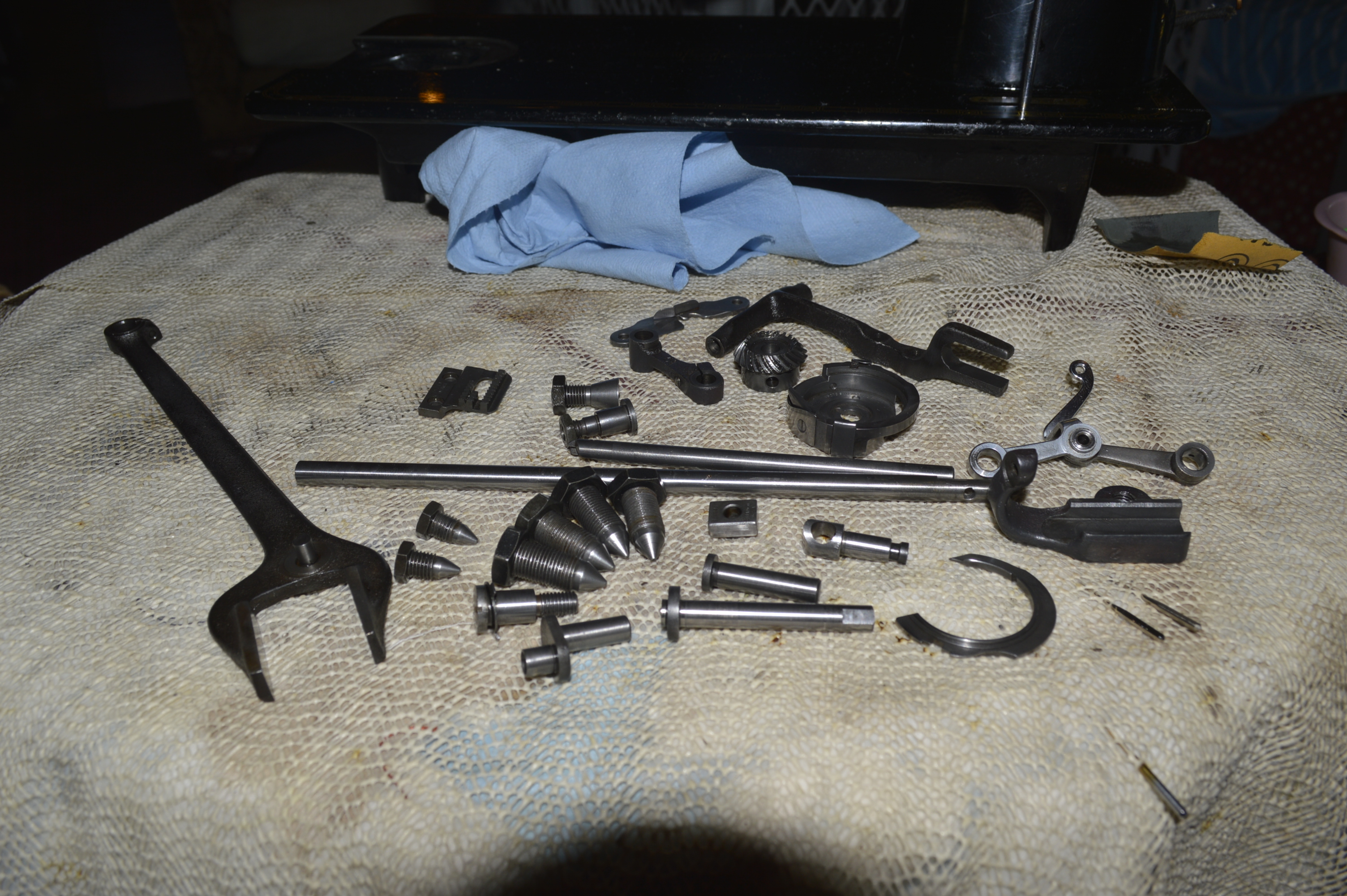 The stitch length fork and associated assembly is also removed. The parts are laid out for cleaning…