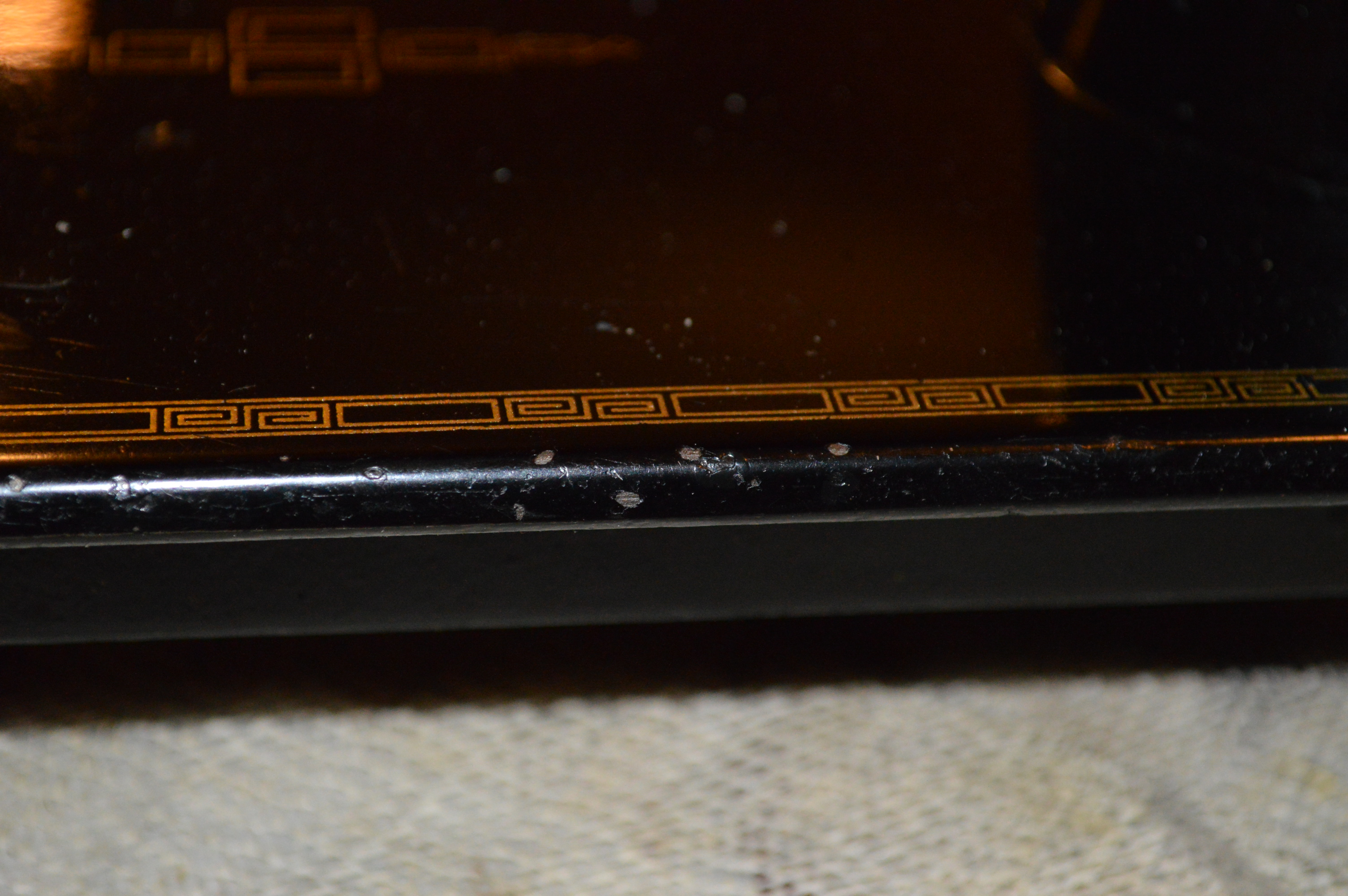 I will try to show the “after” pictures. The camera has a difficult time focusing on the glossy black surface. The process of chip repair for this restoration will take at least 5 days. After the chip is filled with paint, it will be allowed to dry for at least 24 hours before the edges are smoothed. The first coat leaves a small crater in the center. This is filled again and allowed to dry for at least 24 hours. As before, the chip is smoothed out. A third application of paint, and another 24 hours to dry, and the chip is smoothed to its final contour. The chip is then coated with shellac and allowed to dry for 48 hours before it is smooth polished to match the gloss and smoothness the adjacent original paint. This frees up some time for me to focus on other stuff… There is no rush and details matter, so patience here pays off.