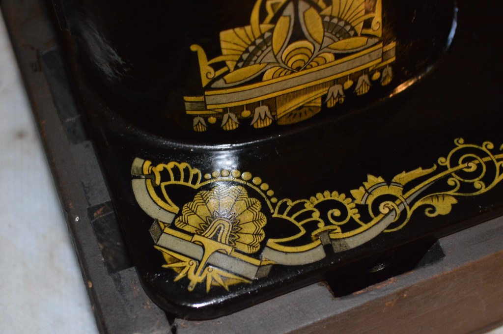 Its dirty… and even though the decals show through and don’t look too bad, the real beauty… shades of rich colors and fine details lie underneath this dirt. You will find many machines in this condition, or even worse. So, if you find one, and the decals look even in reasonably good condition, you can find a beautiful sewing machine underneath.