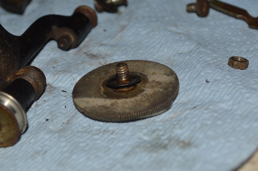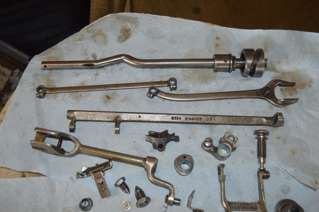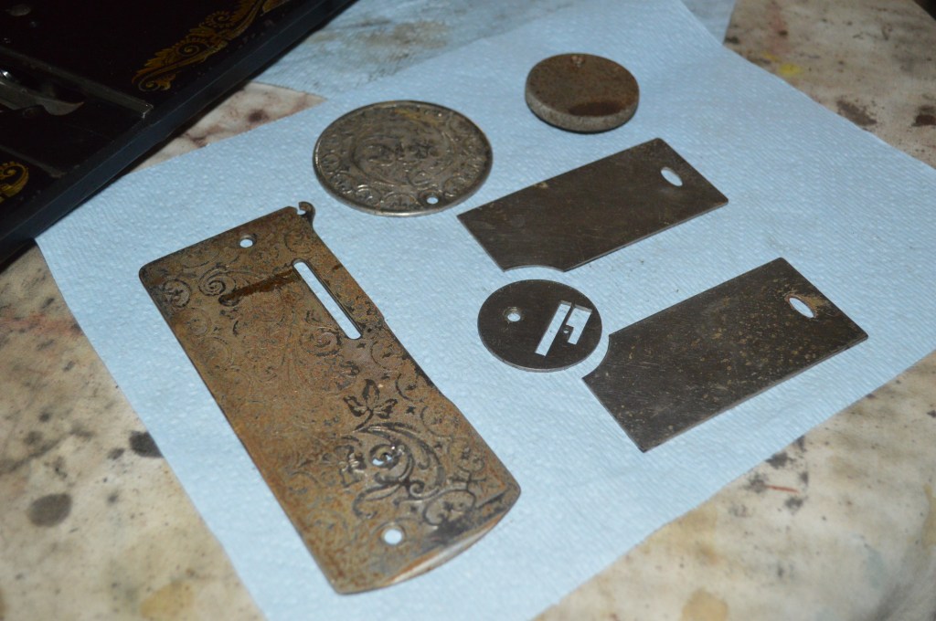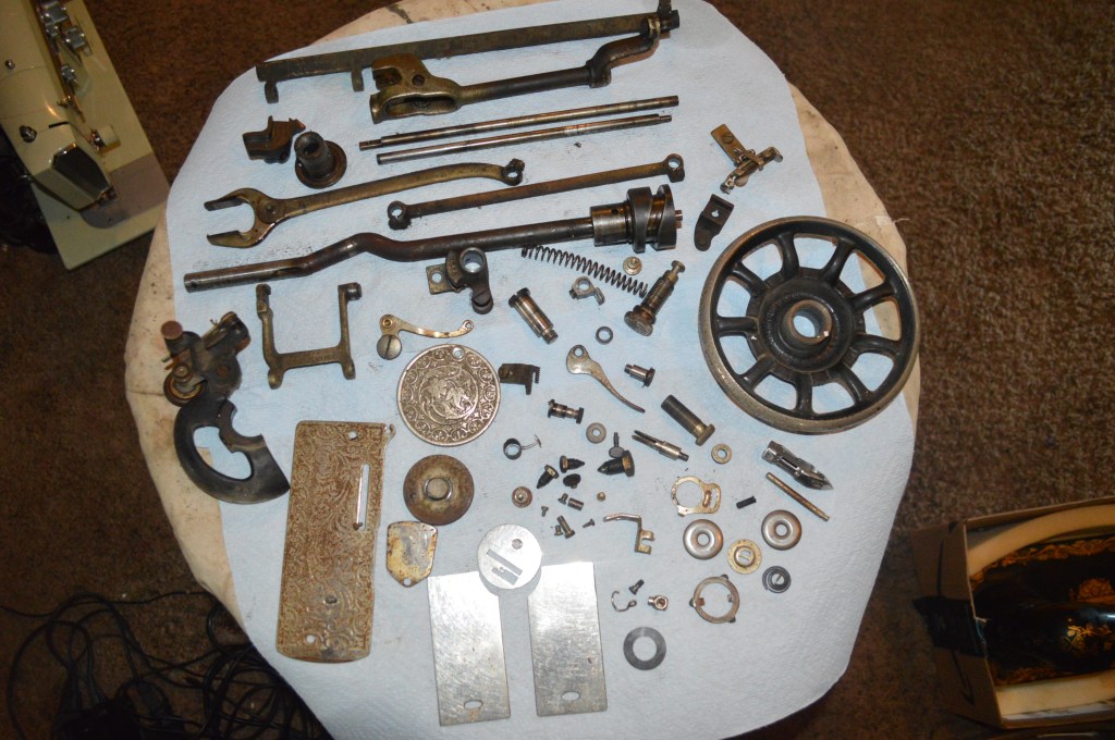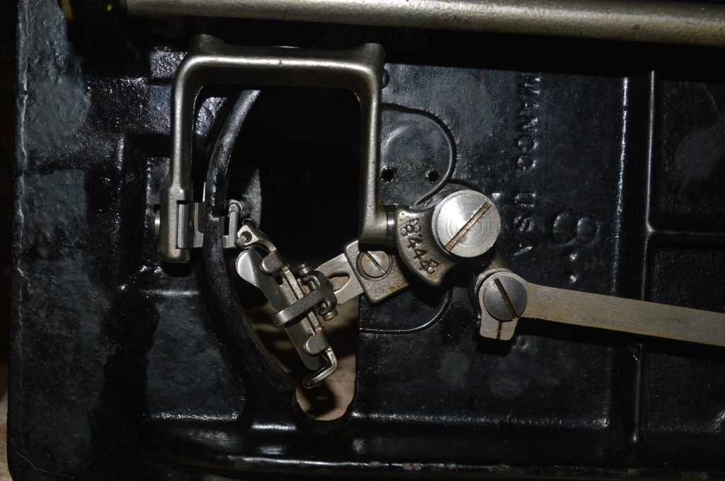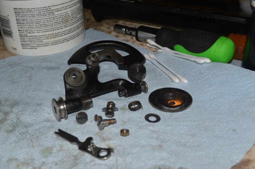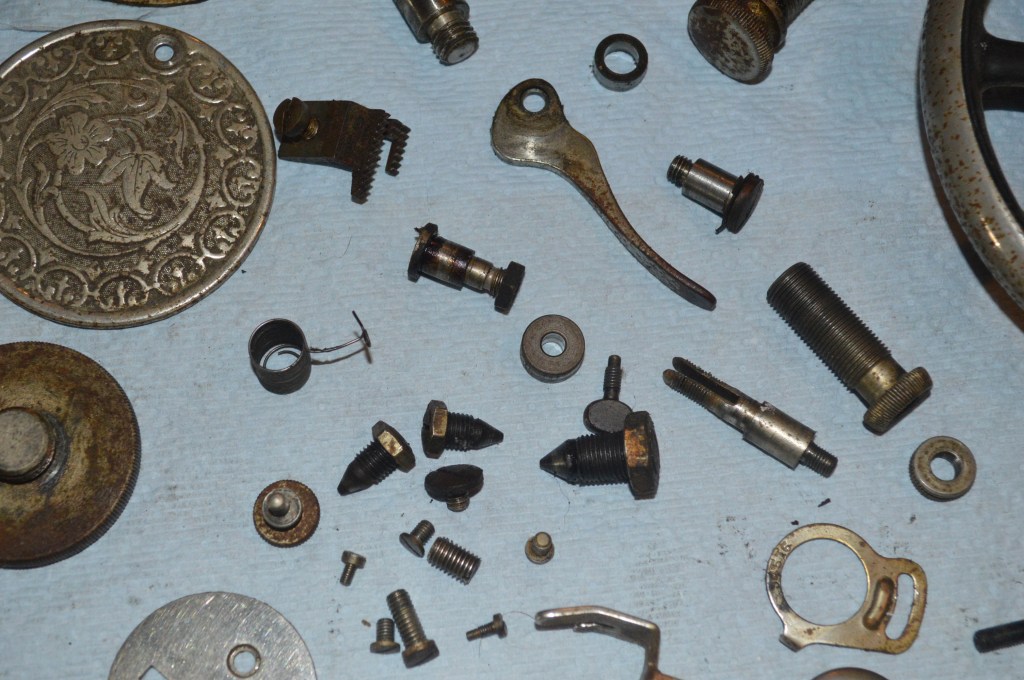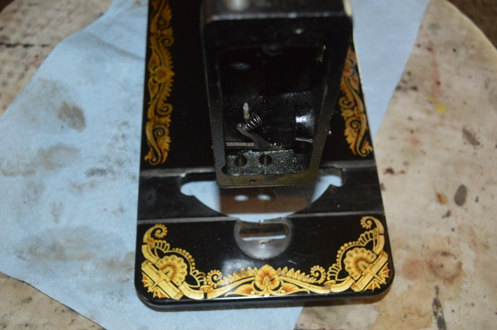 Restoration of the bobbin winder assembly is a “mini-restoration” in itself. The bobbin winder is disassembled, cleaned, the plated parts polished, and reassembled for reinstalling it on the machine. For now, the finished assembly is set aside.