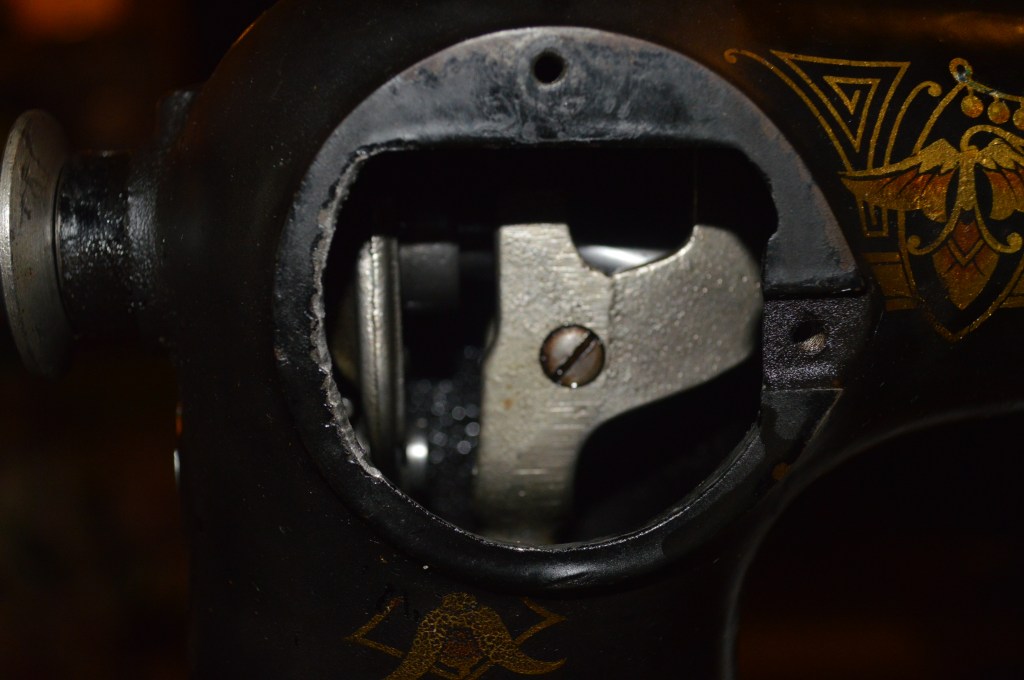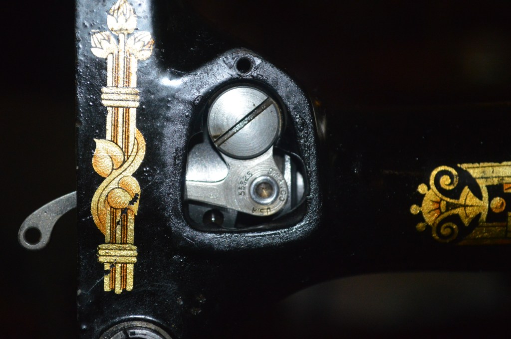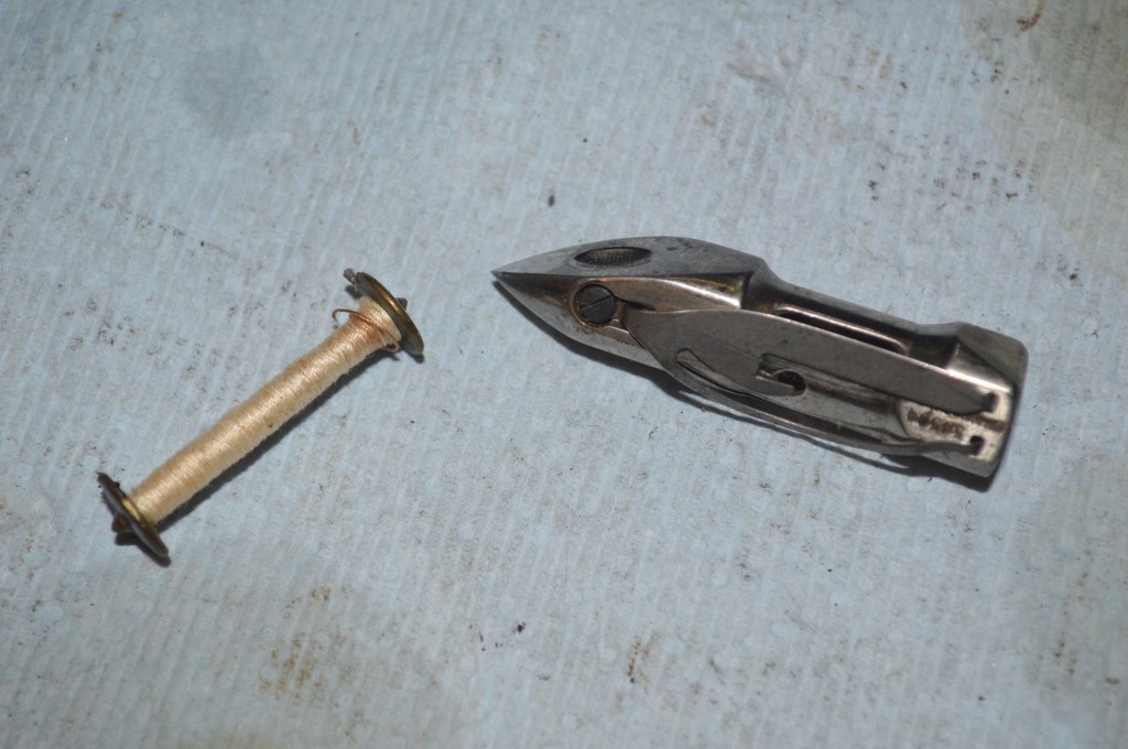 The machine is dirty, and the sewing mechanism is devoid of oil and coated with oil varnish… But look at the decals! Perfect for restoration. Before worrying too much about the look of the machine, I start with completely disassembling the machine. What makes this restoration so interesting to me is the fact that the 127 is a vibrating shuttle machine. This is a completely different bobbin style than must folks are familiar with. Instead of a round bobbin where the thread is caught by a rotating hook, you find a pointed shuttle bobbin (shaped like a boat or a bullet) where a shuttle carrier swings in a sideways arc to catch the thread. In action, the bobbin case is also the hook! Believe it or not, these vibrating shuttle machines make a beautiful straight stitch and will do so regardless of the fabric used.