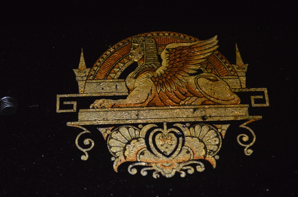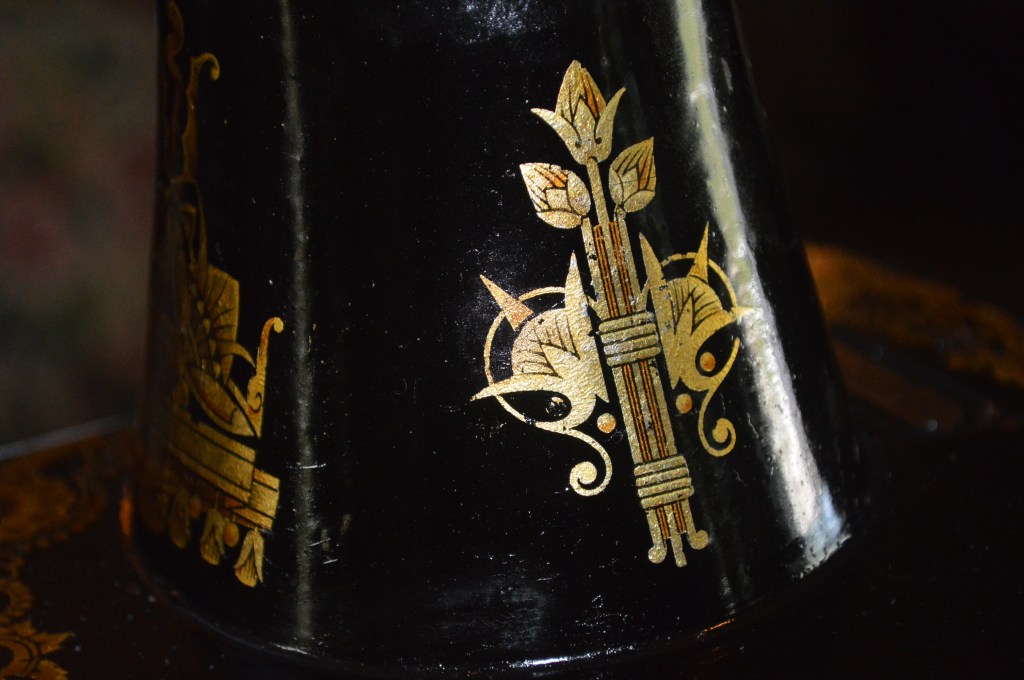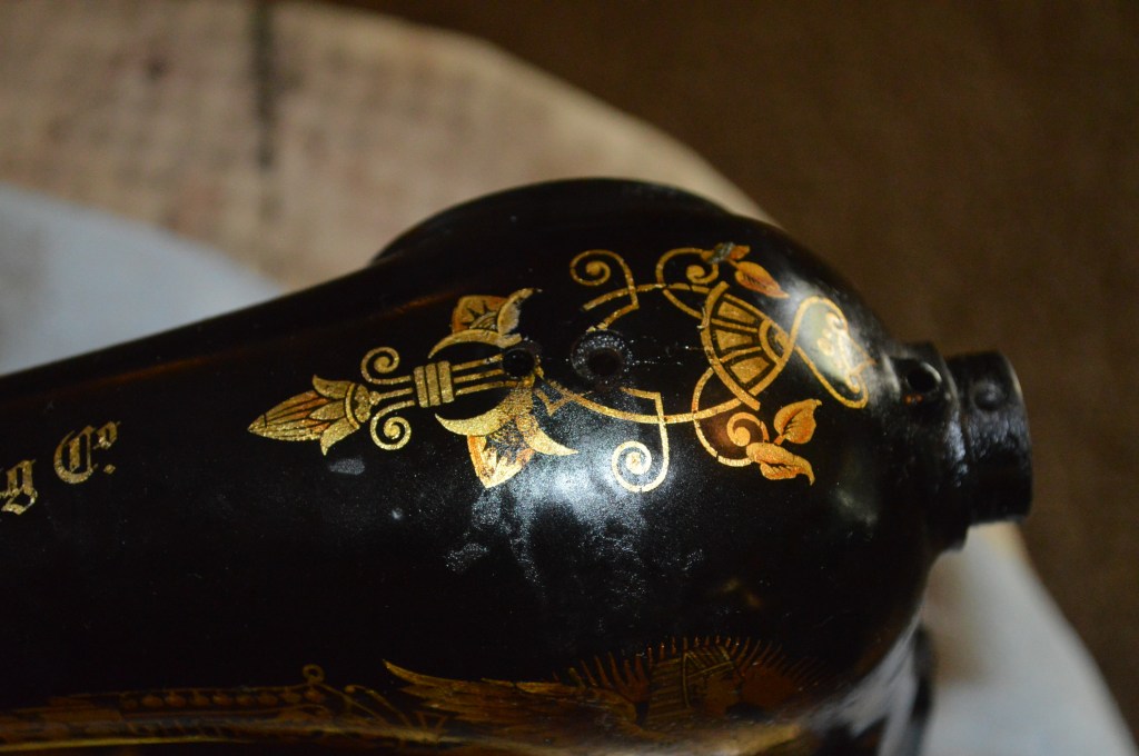 The cosmetic restoration is focused on bringing out the maximum amount of detail in the decals. The paint is in overall great condition. These decals have a beautiful deep gold that sparkle with depth. Cleaning is the first step. I use GoJo. For this machine, I opted to do the majority of cleaning with my finger instead of cotton balls. I have found that on machines like this, I can feel the surface… and the dirt. Aside from the benefits of a clean finger, I know where the decals are vulnerable and I can prevent damaging them by rubbing too hard with a cotton ball. Cotton swabs do the detail work where deeper cleaning can bring out the detail. Following the cleaning, the body of the machine is coated with linseed oil and left overnight to absorb the oil and help nourish the shellac that has dried out and help to rejuvenate the finish. The following pictures show what is possible by simply taking your time and focusing on details.