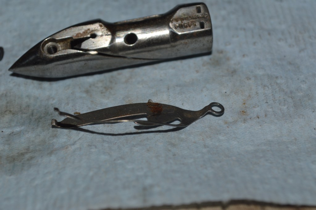Now is a good time to see what gunk has worked itself into the shuttle case. It is easily disassembled and cleaned. As you can see, there is gunk beneath the tension spring and because this is in direct contact with thread, it affects the tension and often causes tension problems.
