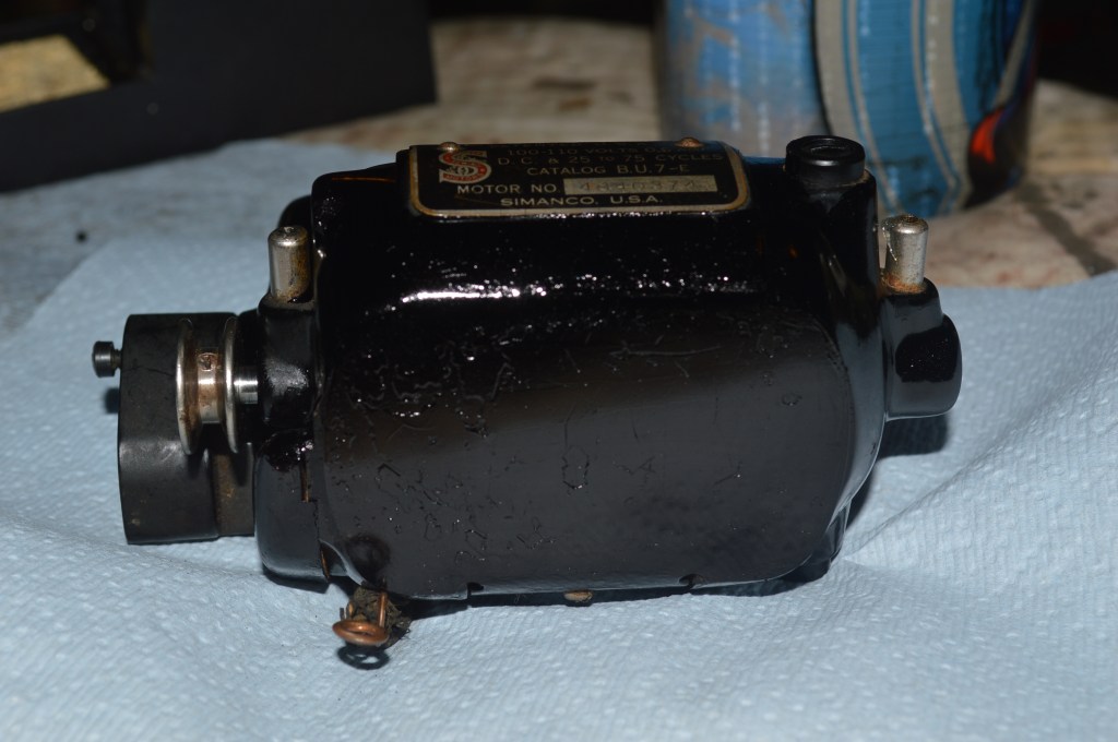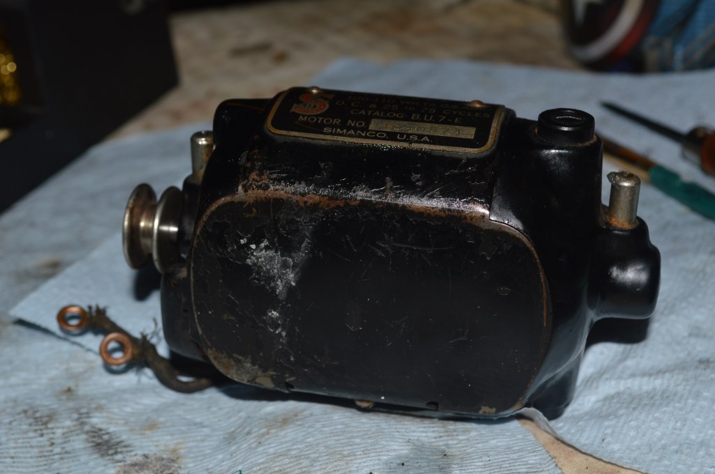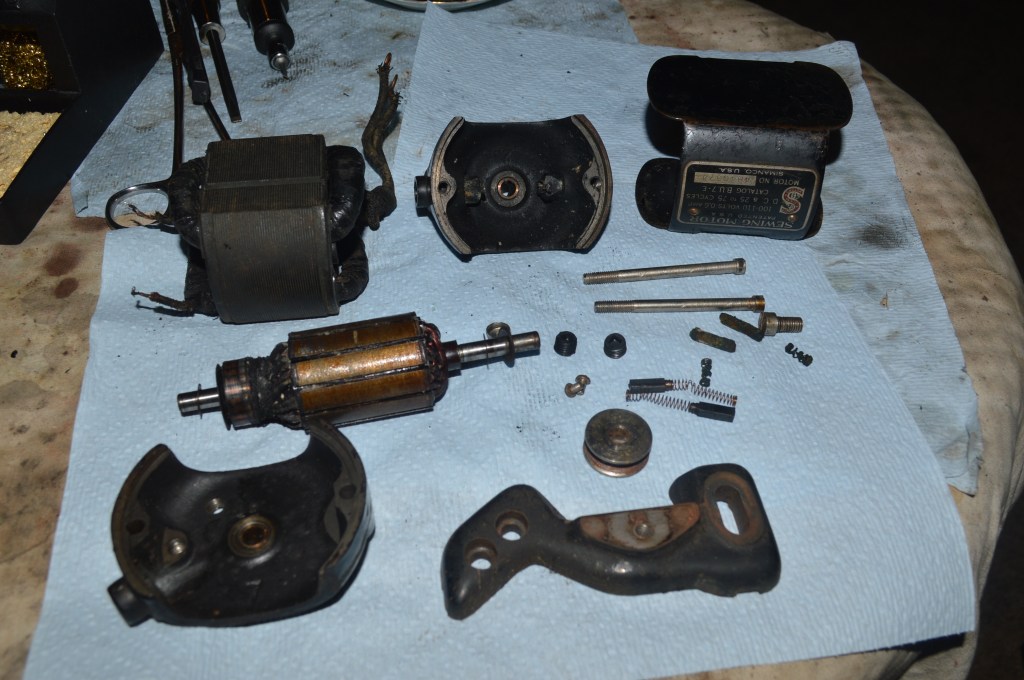 First, the motor… For the motor, I chose a Singer B.U.7 0.6 amp motor. This is a good motor for this machine and will provide plenty of speed and power. The motor was bought with the caution “runs good”. Well, we’ll see. It looks like it fell off the bed of a truck. It is about as dirty as a sewing machine motor can get. The shafts are coated with oil varnish, the wicks are frozen in the grease tubes, and the inside of the case has a lot of carbon buildup. Surprisingly, the main wires are in good condition. Sounds bad huh? Well, I will continue the restoration with the knowledge that these Singer motors are durable and very well built. I am going to bet that it will run great! I know that I will need to replace the grease wicks and recondition the brushes. The shafts and commutator are polished for smooth running.