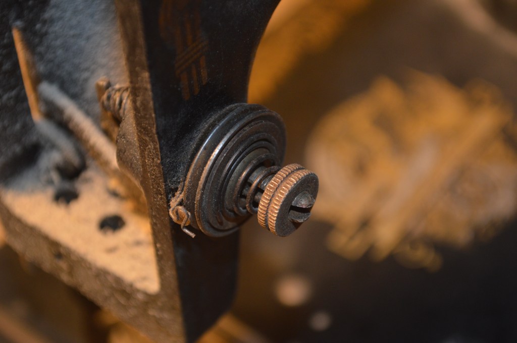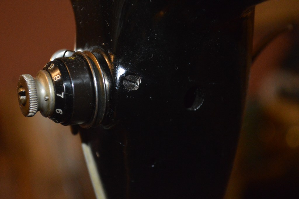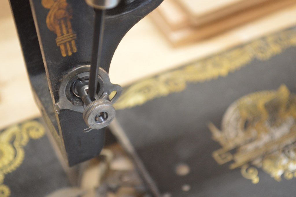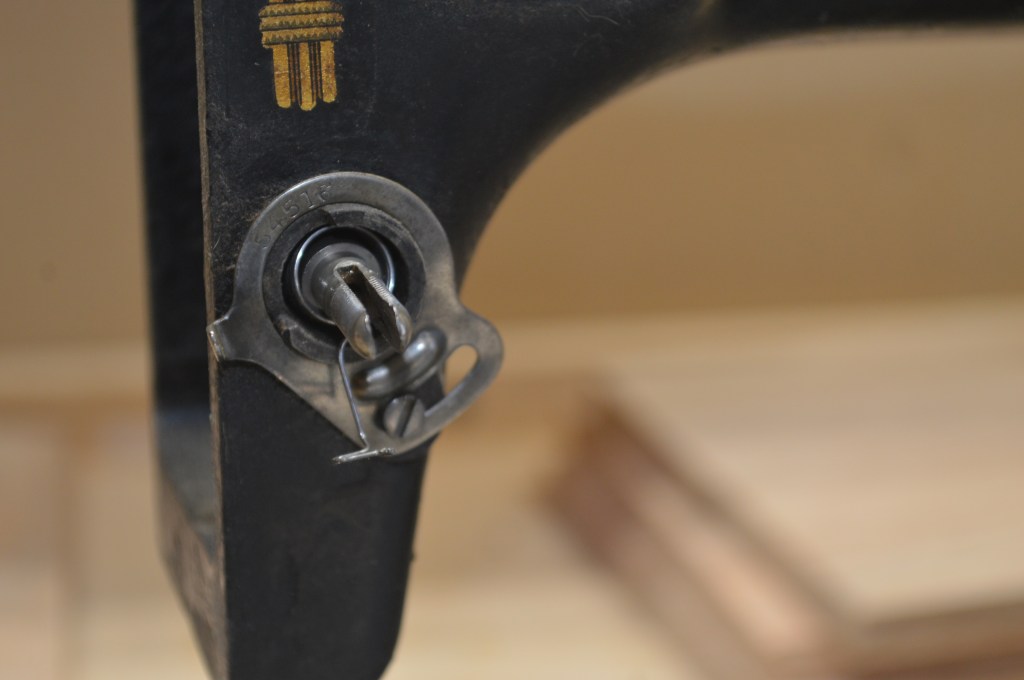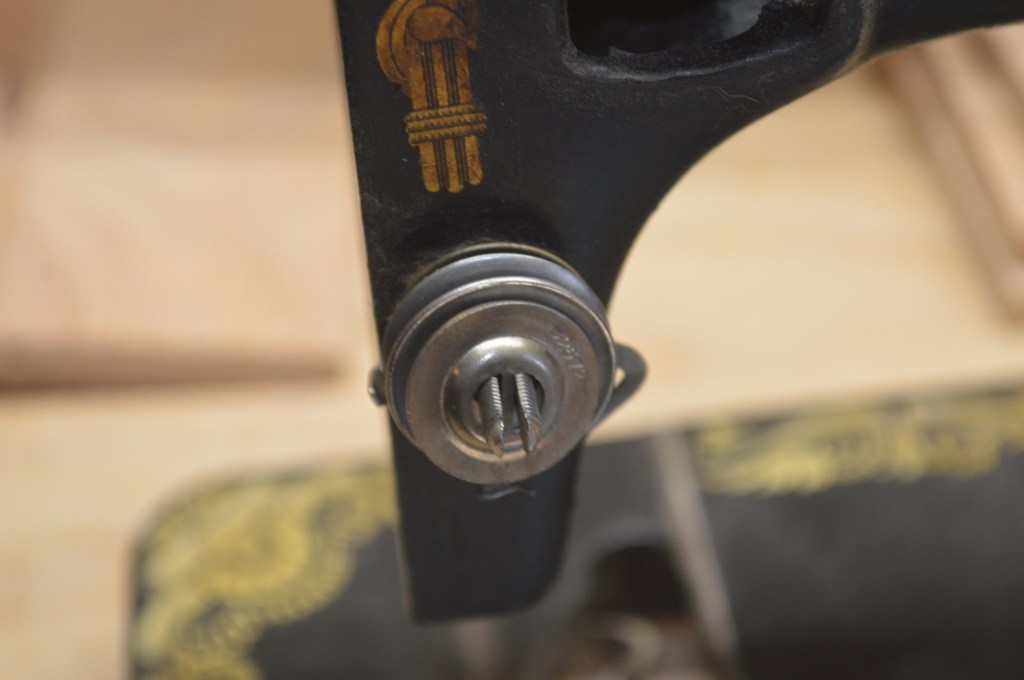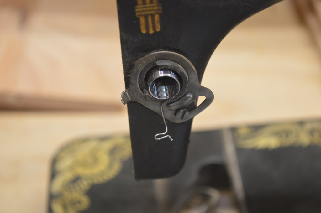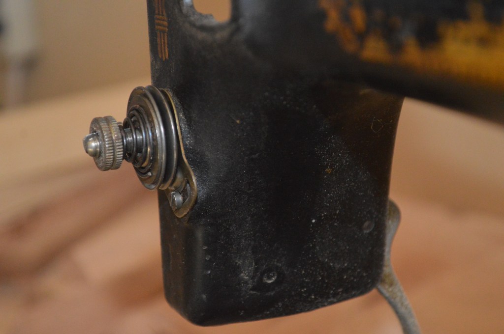 How the tension assembly is fixed to the machine can be different from machine to machine. On some antique machines, the steel post threads directly into the body of the machine. In others, the tension assembly is held into the machine by a set screw. Depending on how it is fixed to the machine will determine how to remove and disassemble it. How do you tell? the next two pictures show if your machine has a set screw or if the post screws in.