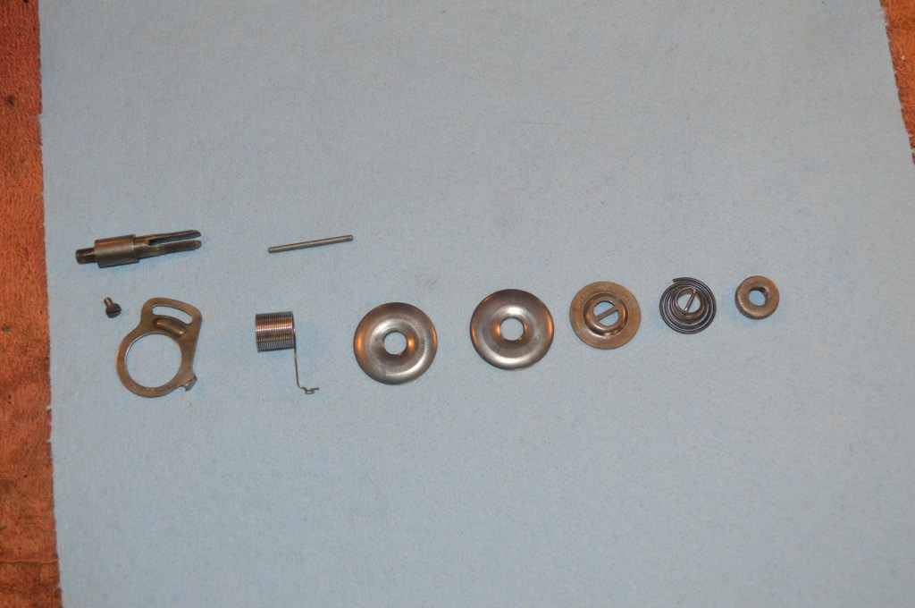 In their basic form, all tension assemblies work the same. Two convex steel discs on a round steel post are pressed together by a coil spring and the tension is achieved by compressing the spring against the discs with a nut. A light thread take-up spring keeps slack out of the thread as the machine forms a stitch.