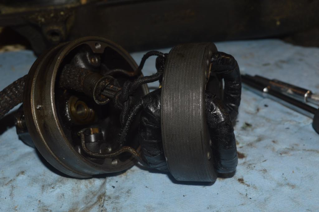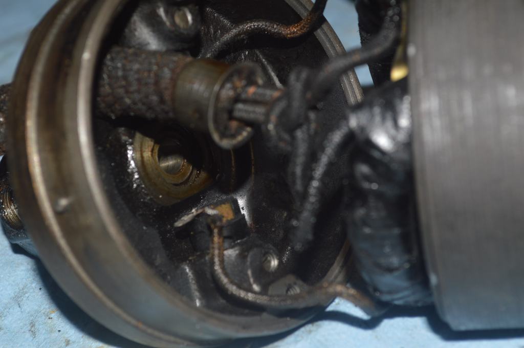 The armature shaft is polished by chucking the shaft up to the flatted slot in an electric drill and wrapping the oiled sandpaper in a 180 arc around the shaft. As you turn the shaft rapidly with the drill, slowly move the sandpaper up and down the shaft until it is bright. Then wipe the oil from the shaft. The bit of shaft that was chucked in the drill is polished with the oiled sandpaper by hand.