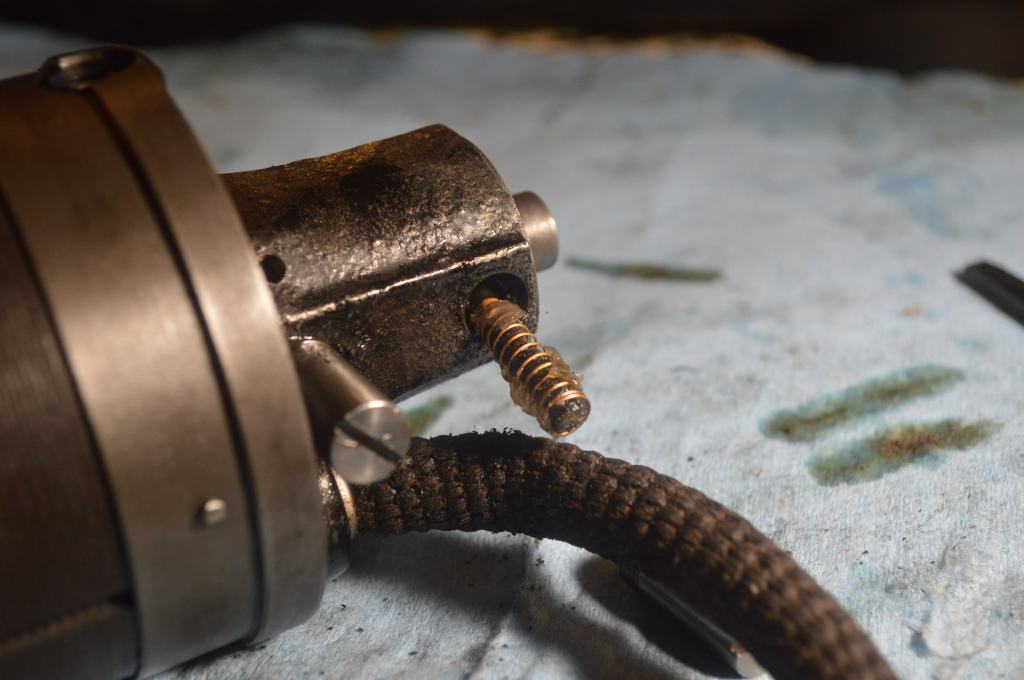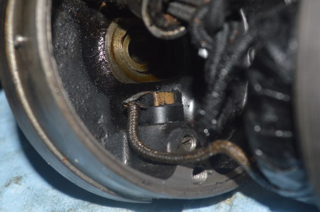 Now the brush tubes can be removed. Bend the solder terminal 90 degrees so it is in line with the tube. Looking at the picture below you see two set screws. These set screws tighten against the brush tube. Loosen the set screws and remove the brush tubes by pressing them out from the inside.