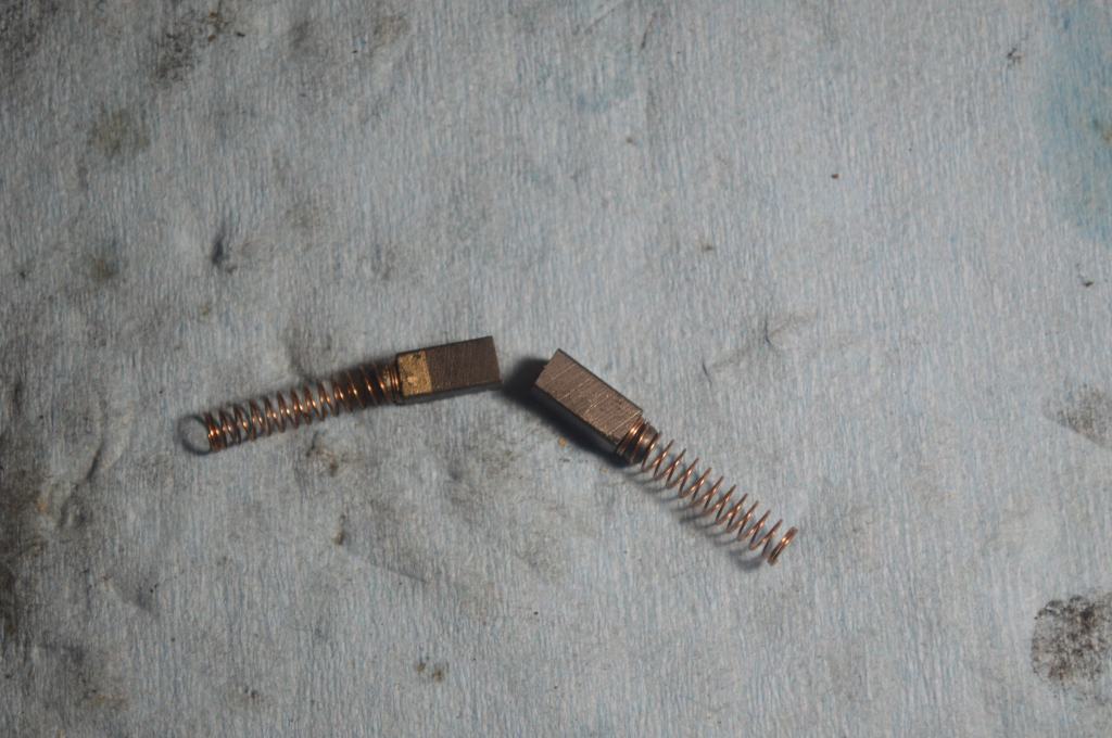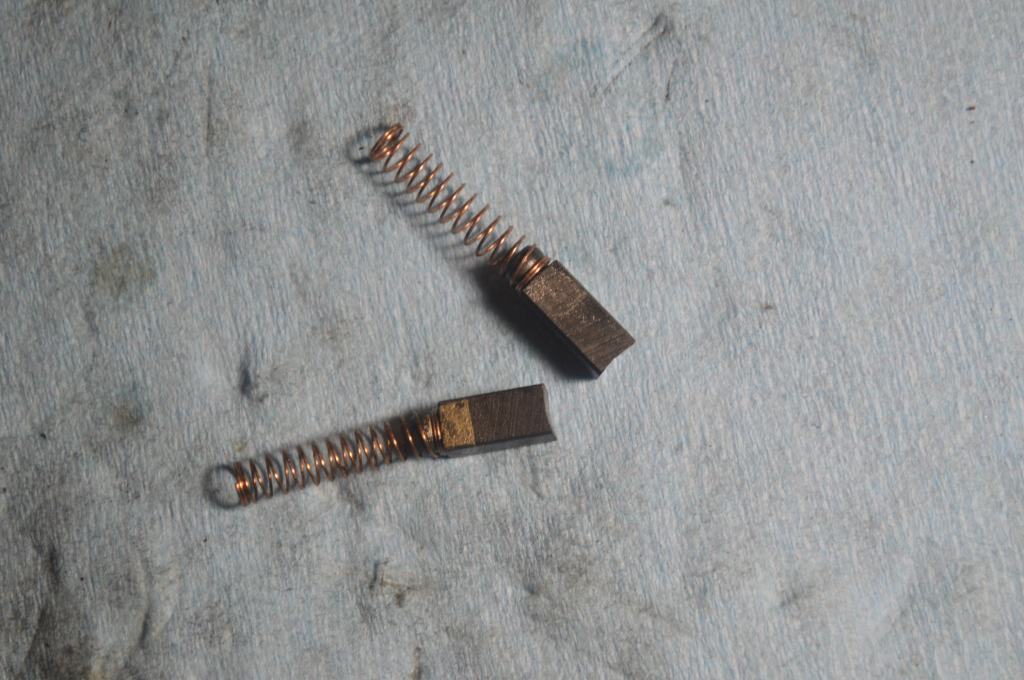 Now, before the armature is removed, the motor brushes must be removed. Spoiler alert: They are spring loaded and retained under threaded caps, so be careful when removing the caps so neither the cap or the brush goes flying across the room beginning an hour long search for it wherever it landed and hid itself.