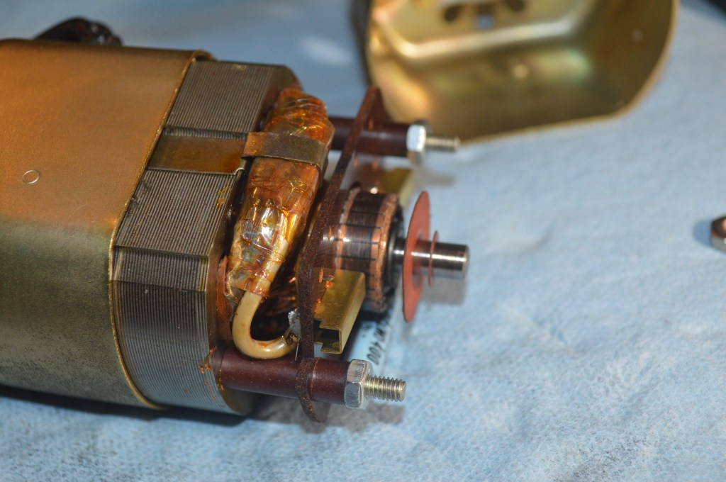 On the shaft side of the motor cap there are two nuts. Remove the nuts and washers. Similar to the brush cap removal, wiggle the shaft end of the motor case and gently remove it. Push the wire thru the hole as the motor cap is removed and don’t let the wire get tight but keep slack in it as the cap is removed.