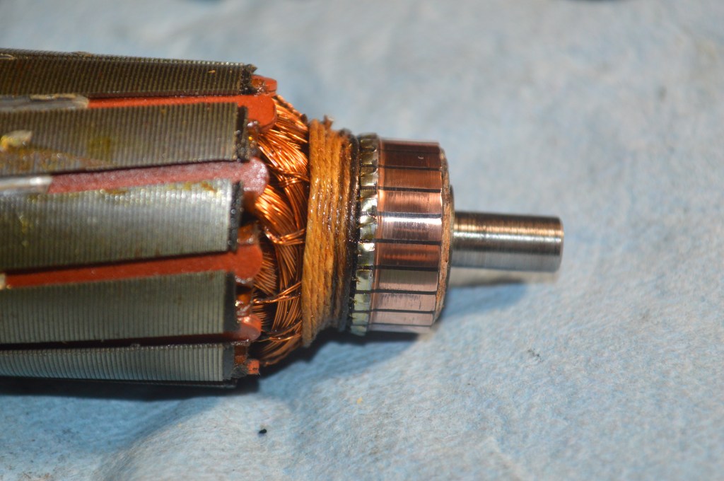 I use a dremel tool with a small buffing wheel and red jeweler’s rouge to polish the commutator. To polish the shafts, I chuck each end in an electric drill. Using a piece of 2500 grit sandpaper wetted with a drop sewing machine oil, wrap the oiled sandpaper around the shaft and turn the shaft in the drill. Moving the sandpaper up and down the shaft it is soon polished bright and smooth. Do the same to the other shaft end. If you don’t have a dremel to polish the commutator, you can use a piece of DRY (no oil) 2500 grit sandpaper… don’t let any oil get on the commutator. Chuck the long end of the shaft in the drill and again spin the shaft while lightly holding the sandpaper against the commutator until it is bright. Do not apply much pressure and stop when it is bright… in this case, less is more.
