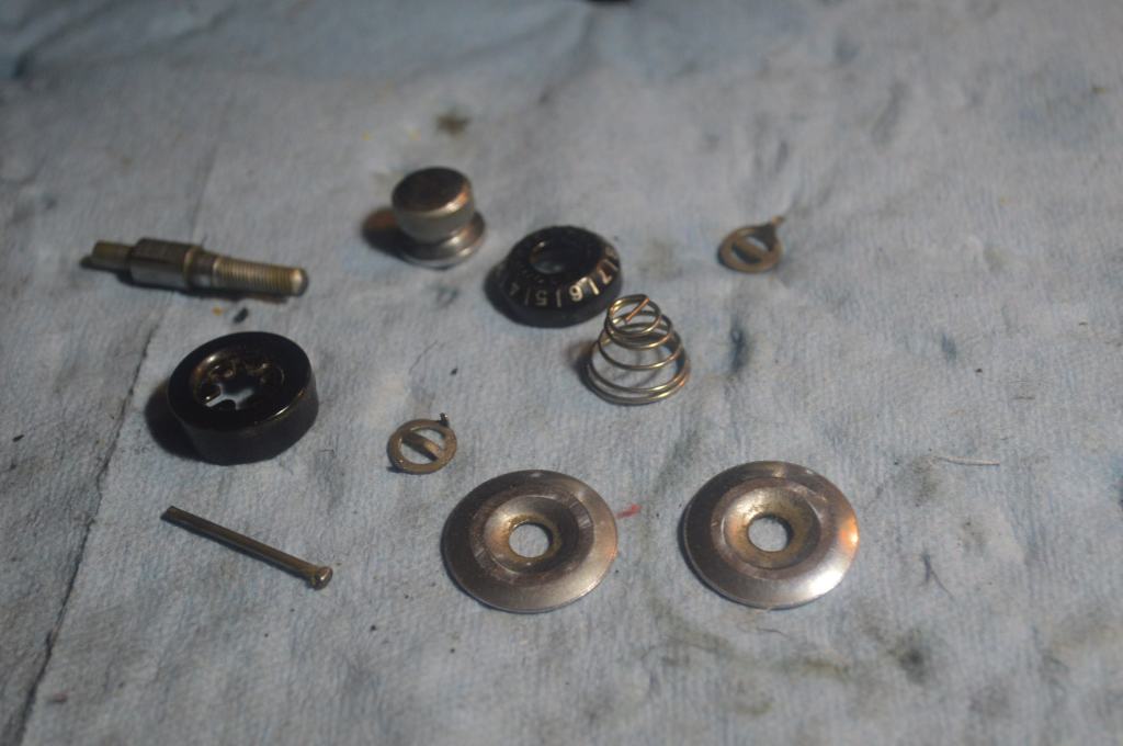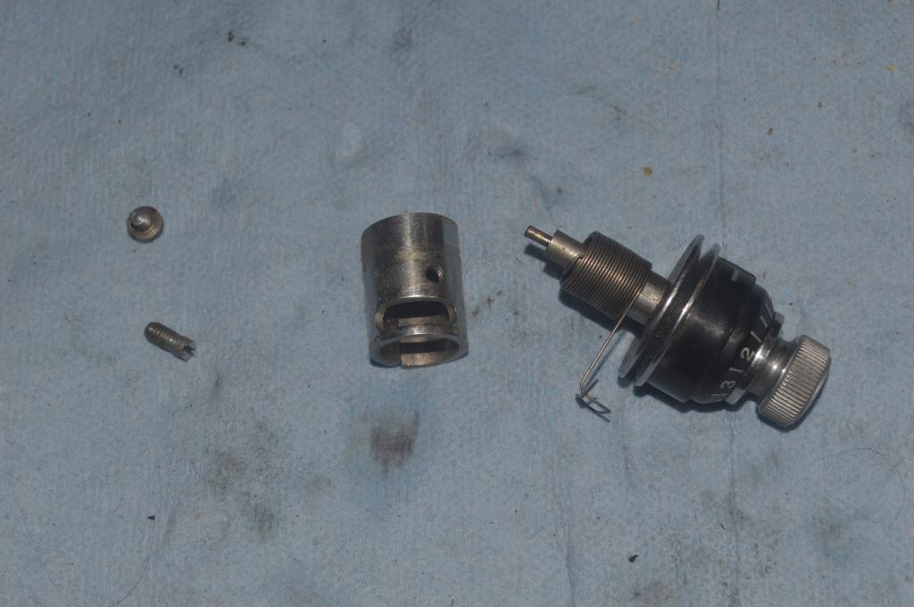 Next is the top tension control restoration. The tension discs and the tension disc shaft are polished. Everything else is cleaned. This will assure a smooth thread path and even thread tension.