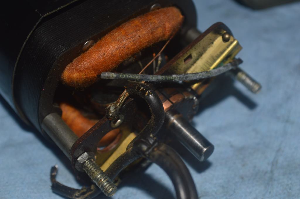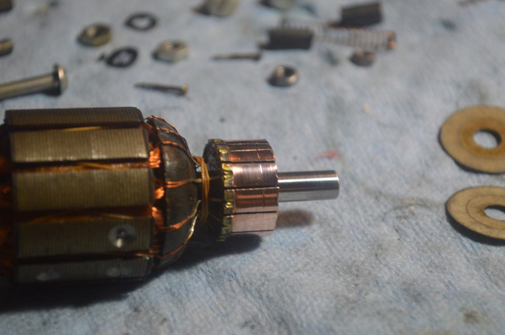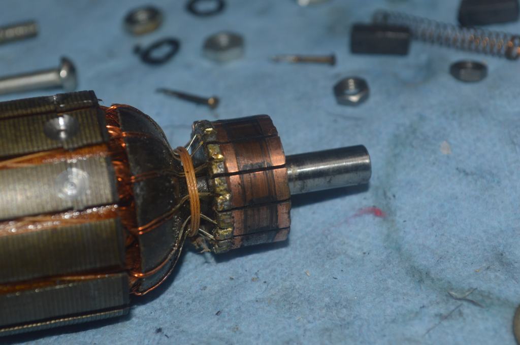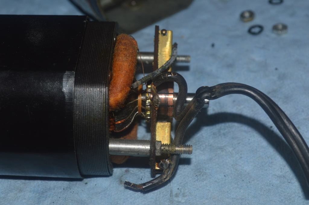 Before reassembly, the brushes are removed and cleaned, the armature and shafts are polished, the motor housings are cleaned on the inside and the oil wicks are recharged. The main wires are attached and soldered to the brush tubes. After reassembly, paint chips on the motor housing are corrected with paint match paint.