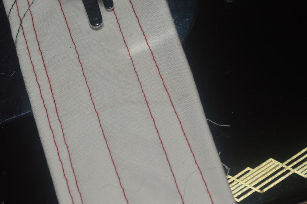 At this point, the machine is threaded, tensions are set, and the machine is tested to see how she sews! After noodling with the needle depth, top and bottom tensions, and presser foot pressure, I’d say it lays down a very nice stitch. I didn’t clock the machine speed, but I would guess it is 1000 spm or better. The machine has a very solid sound and the motor is very strong. I’m very happy with the outcome!