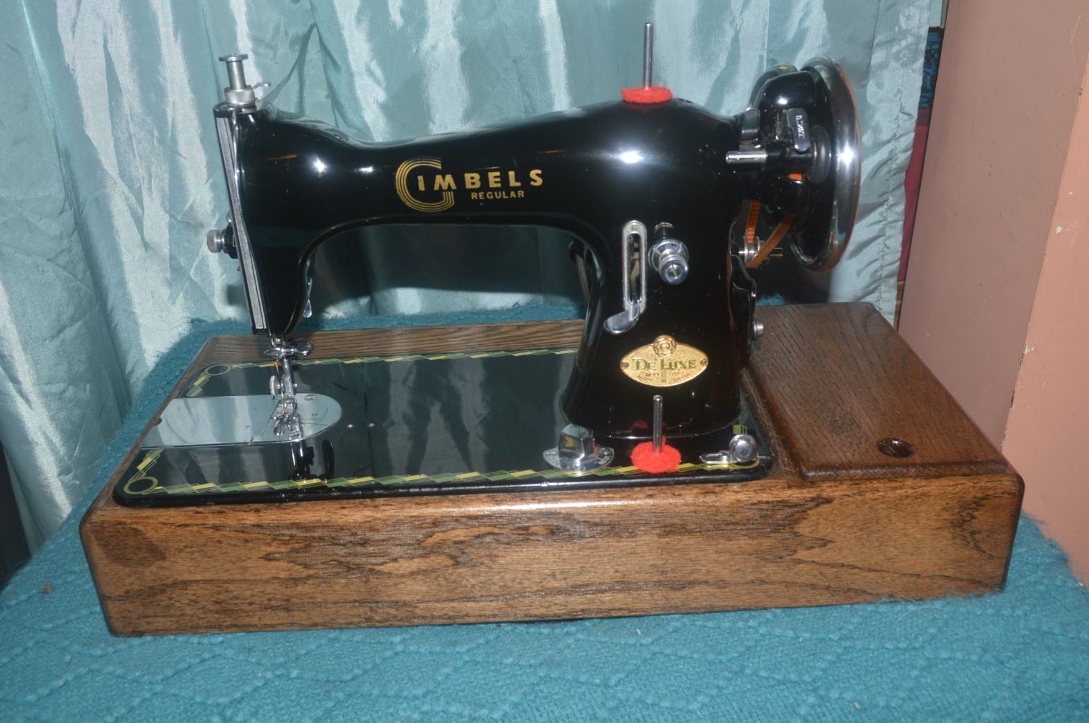 So, that’s it! The paint repairs turned out very nicely, and are hardly noticeable unless you know where to look. The machine turns smoothly and there is no perceptable slip or play in the assemblies. The parts are completely clean and the adjustments are just right for this machine. Finally, the pictures below show the final outcome. The customer ordered a custom made base in a Mocha stain, and this is base the machine is set into. All in all I think it is a very nice package, and I hope the customer is not only pleased, but uses her “new” Gimbels “Regular” machine for many years to come!