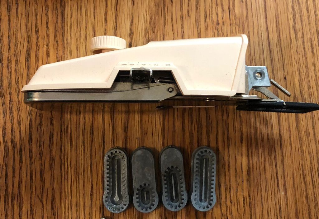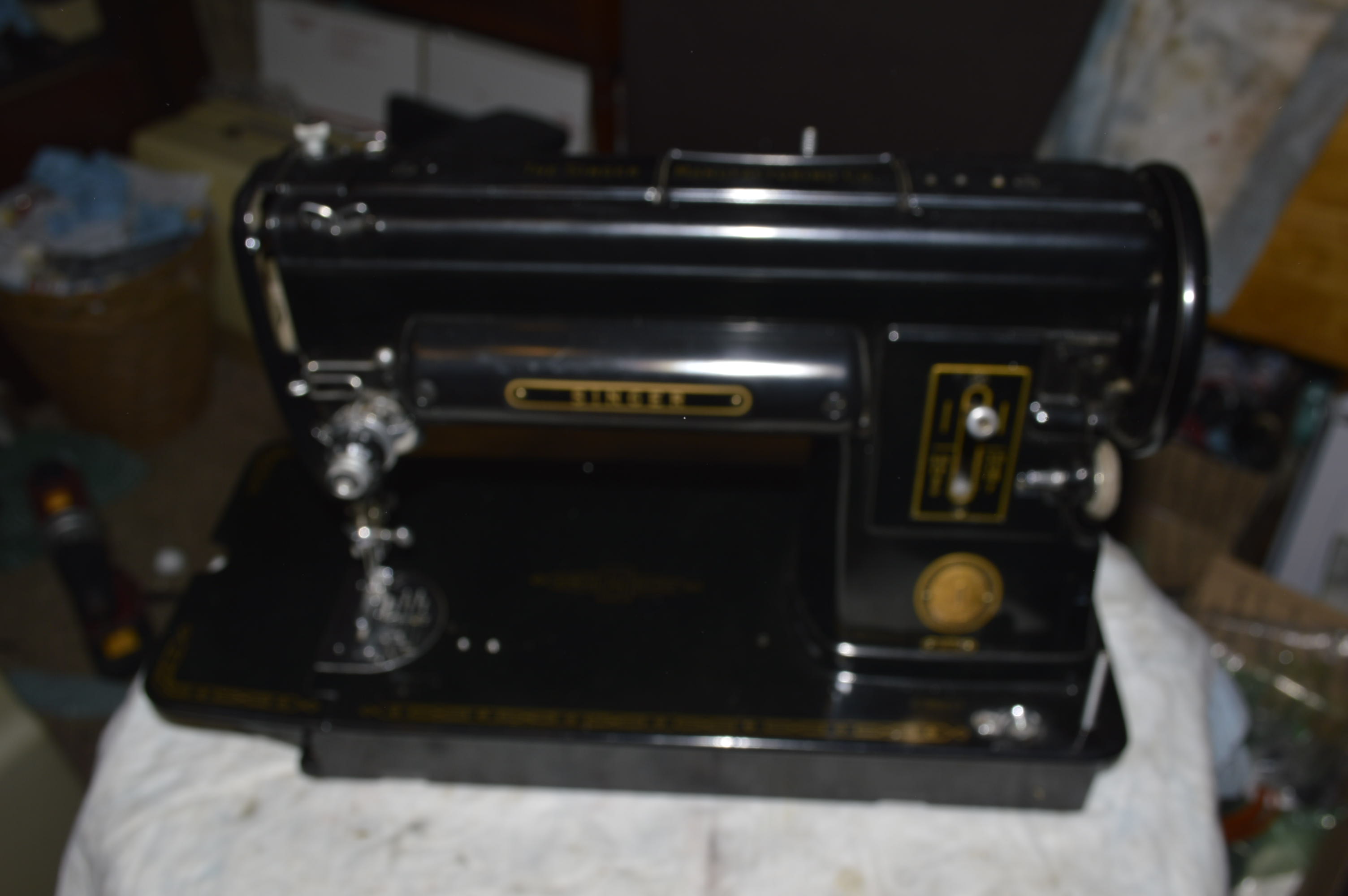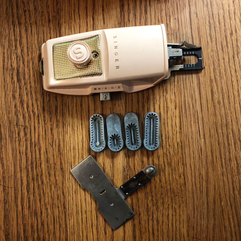 The model 1953 is a straight stitch machine. There are no identifying marks cast into the machine that give any clue clue to who manufactured the machine or when. The model 1953 might suggest that it was first introduced in 1953, but I couldn’t say with any certainty thats the year it was made. The motor on the machine is a Morse motor, and it may be an indication of the machine being manufactured by Morse. The stitch length controls and the top tension knob look similar to controls I have seen on Morse machines, but thats not enough to claim Morse was the manufacturer. The motor may have been replaced at some point in time and the controls also appear similar to machines Brother manufactured in the early 60’s. Unfortunately, I cannot conclusively provide a date or manufacturer for this machine., but If pressed for an answer, I would say it is likely made by Morse for Gimbels.