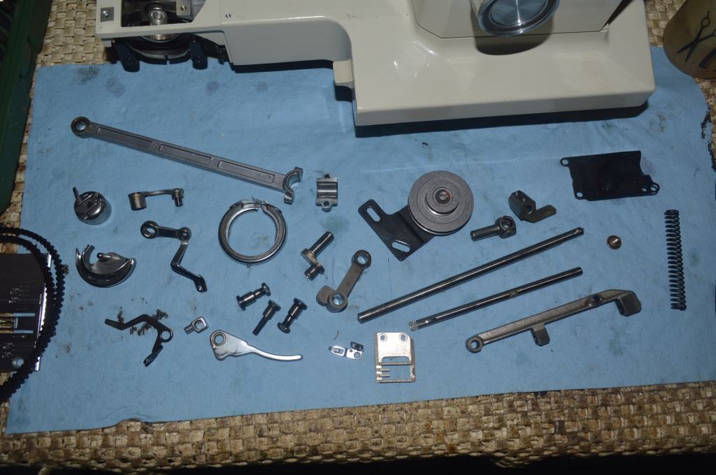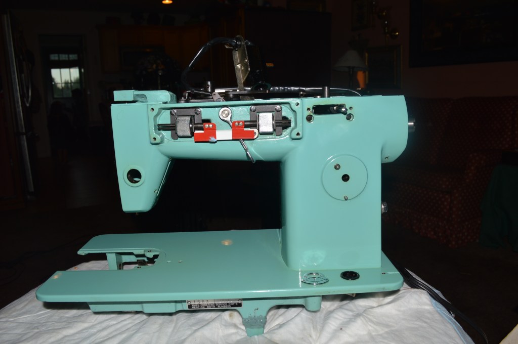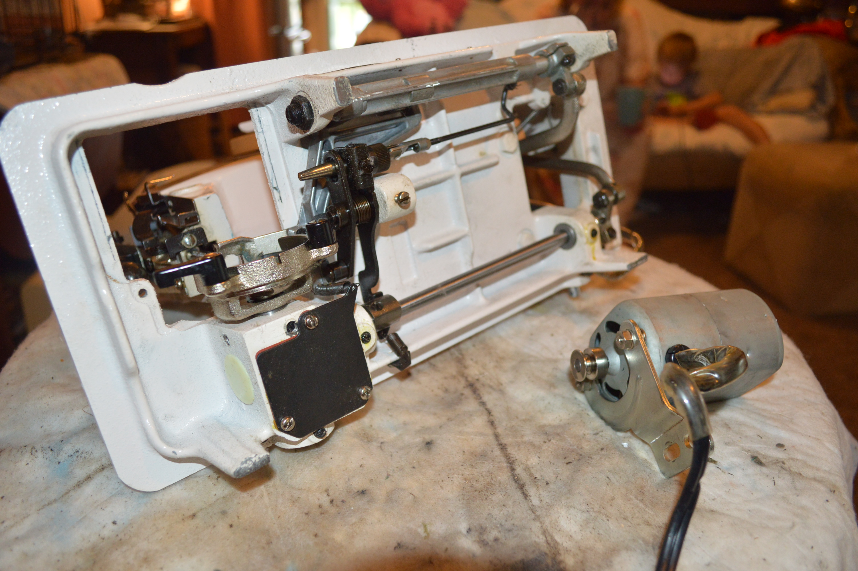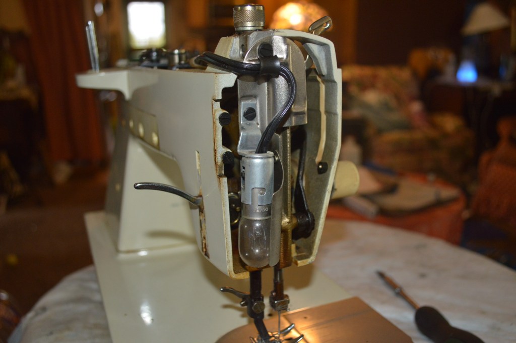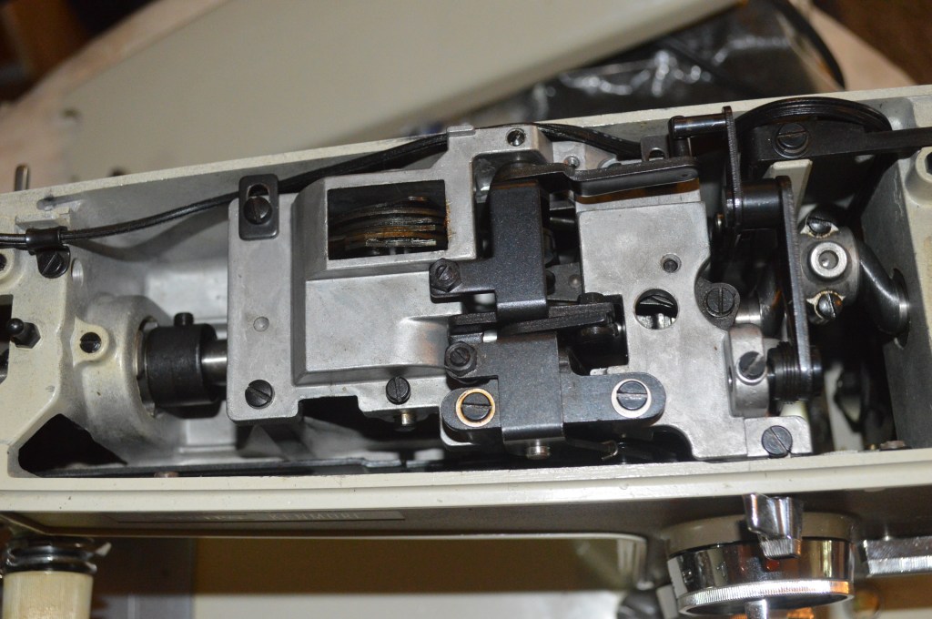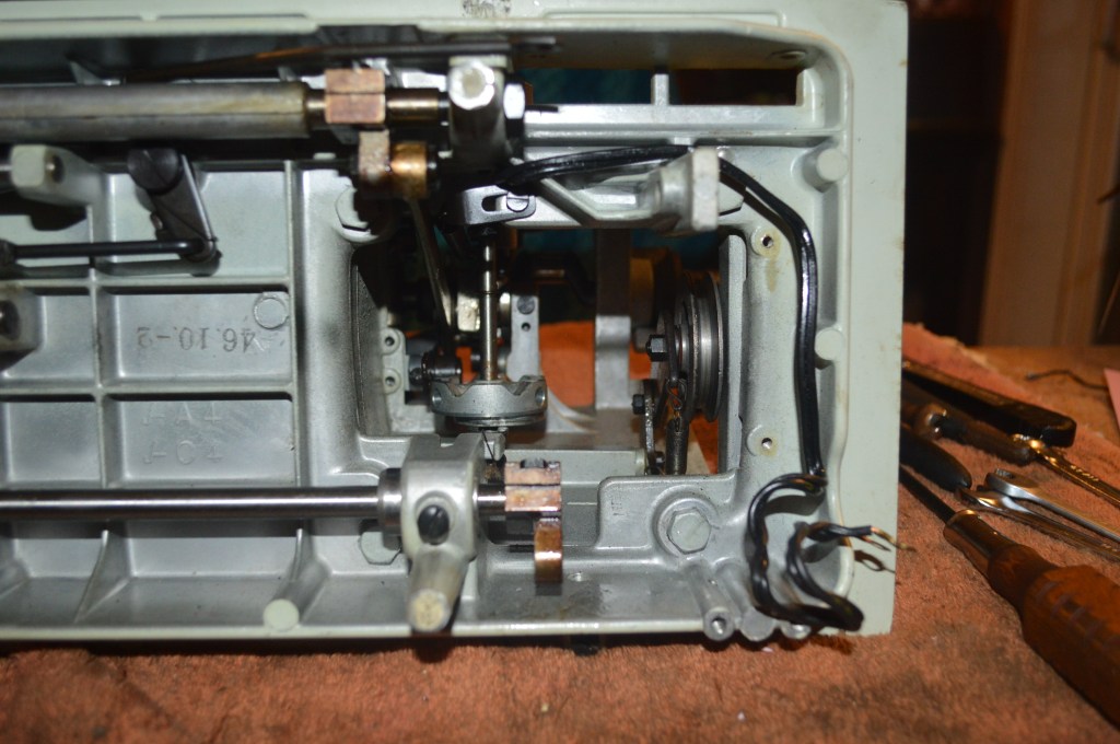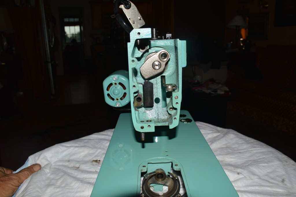 The machine’s sewing mechanisms are reassembled and rough adjustments are made. It is then hooked up to an external electric motor and run for 5 minutes at 1400 rpm. This mates all of the moving parts together and makes the machine incredibly smooth. After this exercise, fine adjustments are made and the motor, light, and all of the bits and pieces are reassembled to the machine.