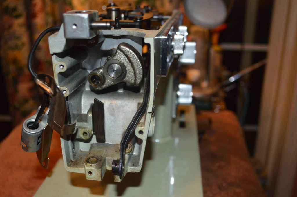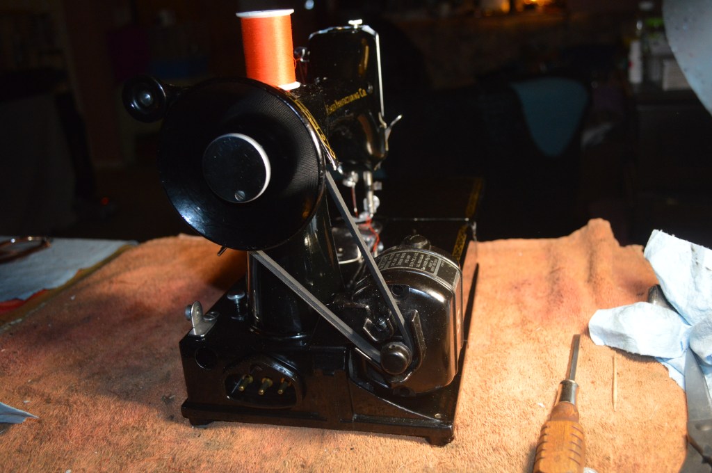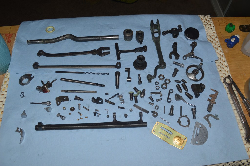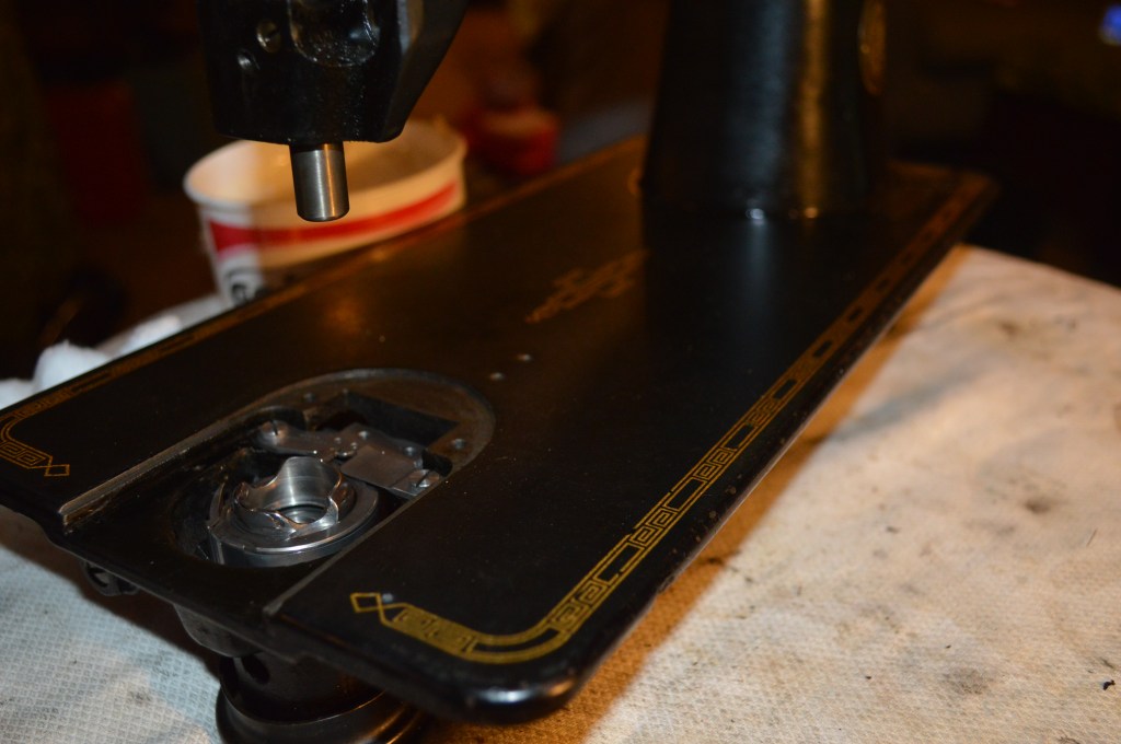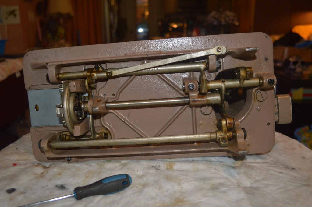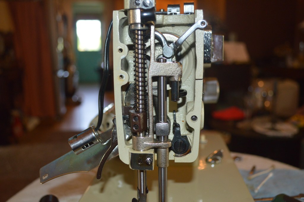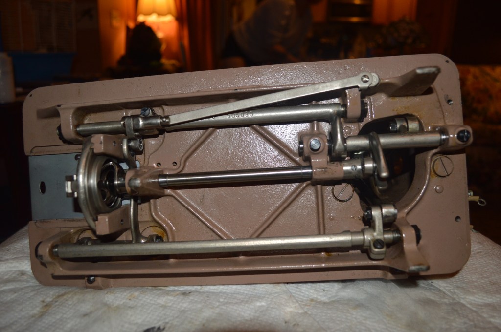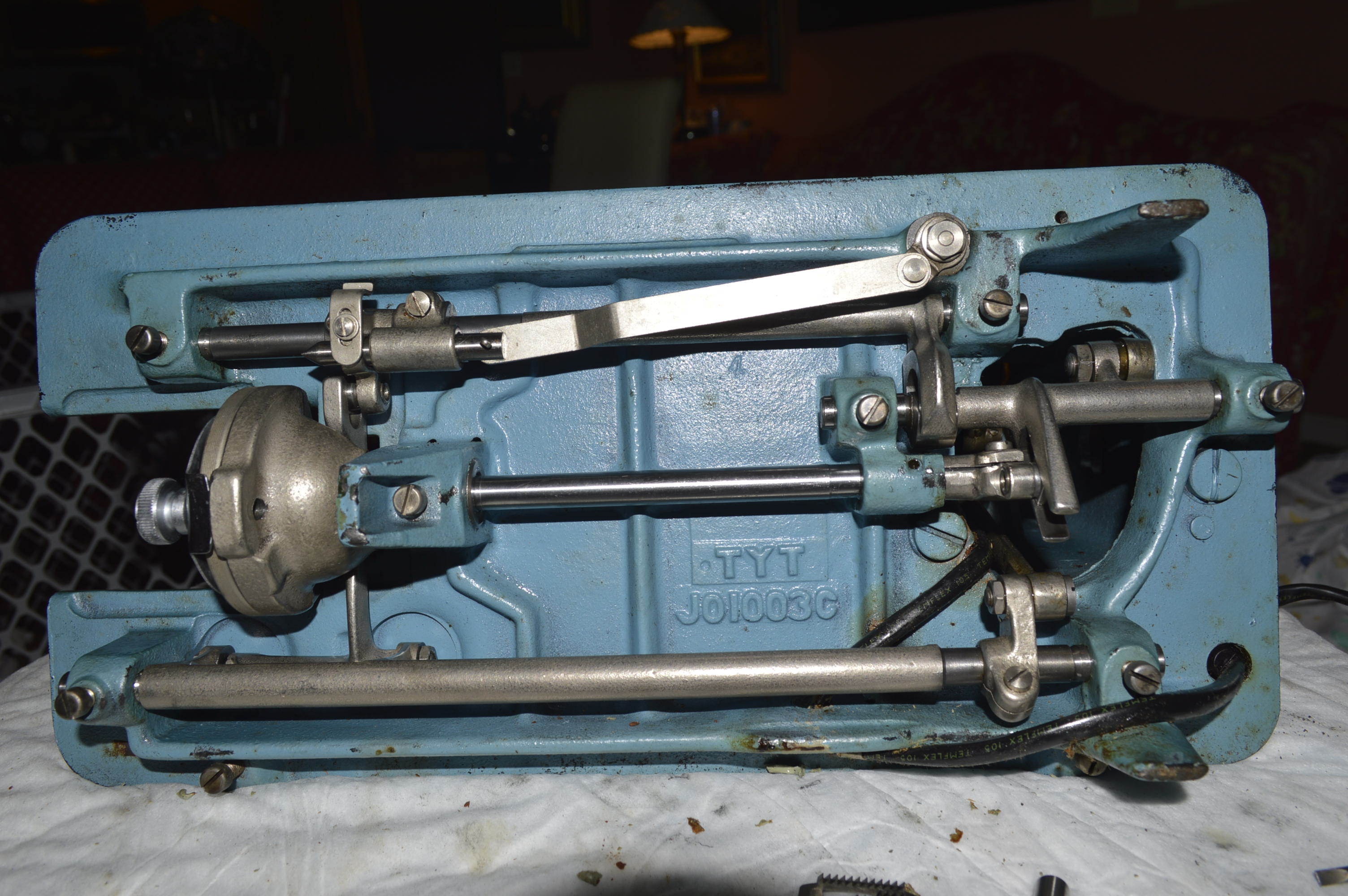 The machine’s sewing mechanisms are reassembled and rough adjustments are made. It is then hooked up to an external electric motor and run for 5 minutes at 1400 rpm. This mates all of the moving parts together and makes the machine incredibly smooth. After this exercise, fine adjustments are made and the motor, light, and all of the bits and pieces are reassembled to the machine.