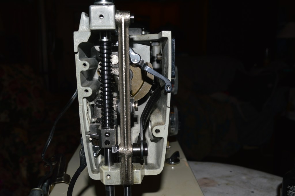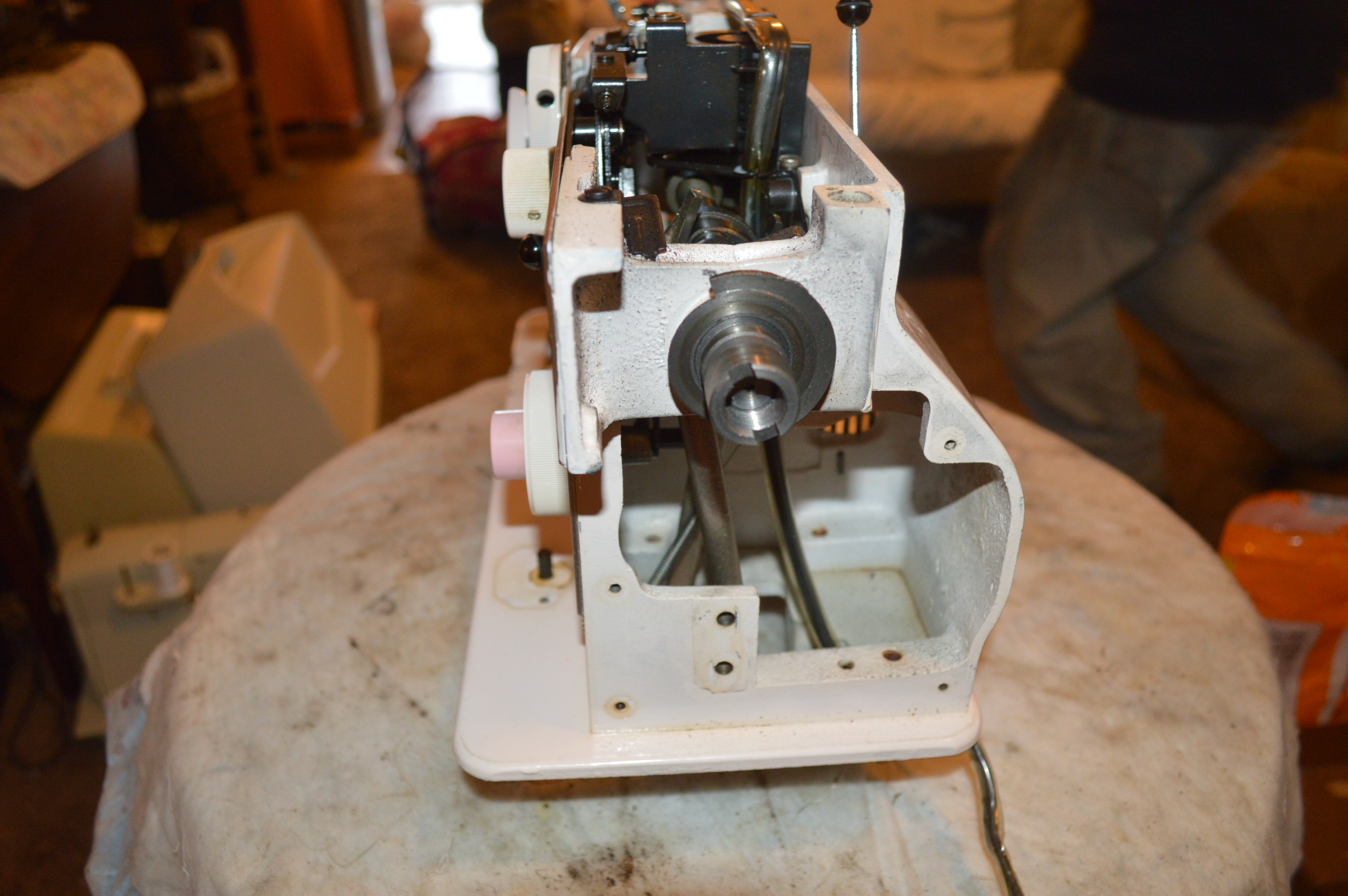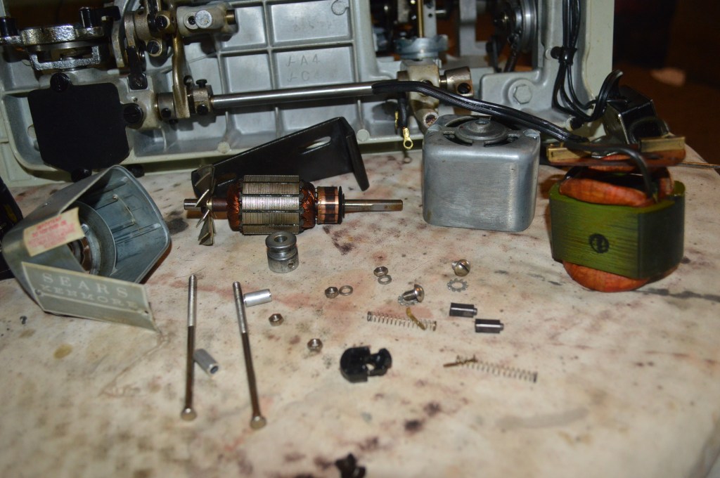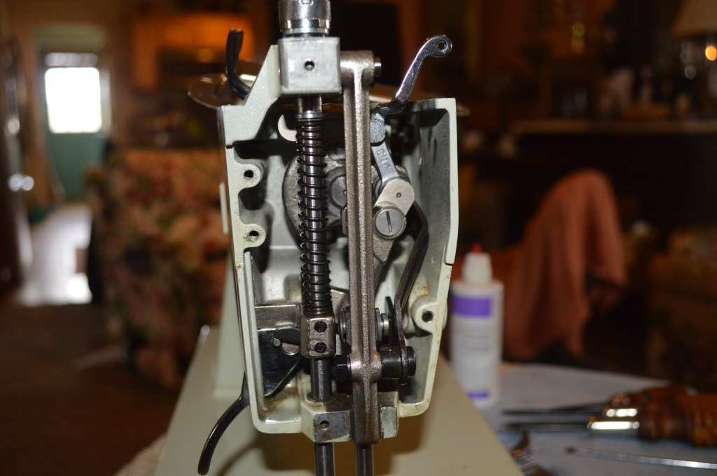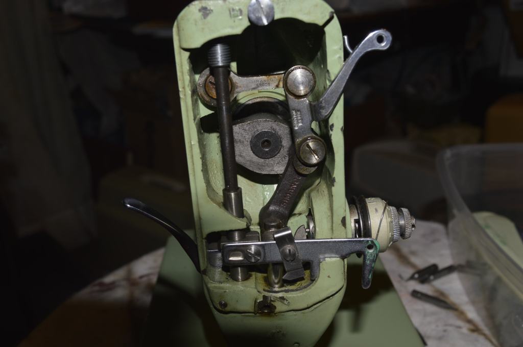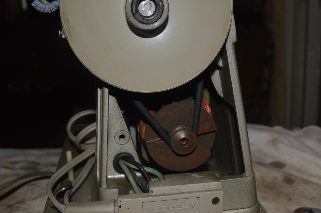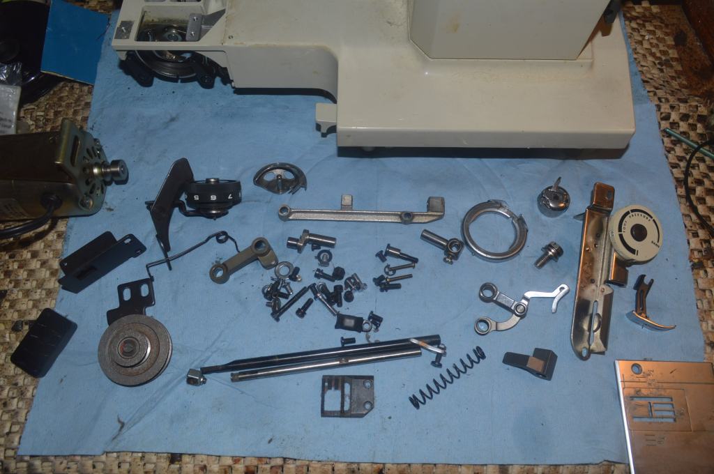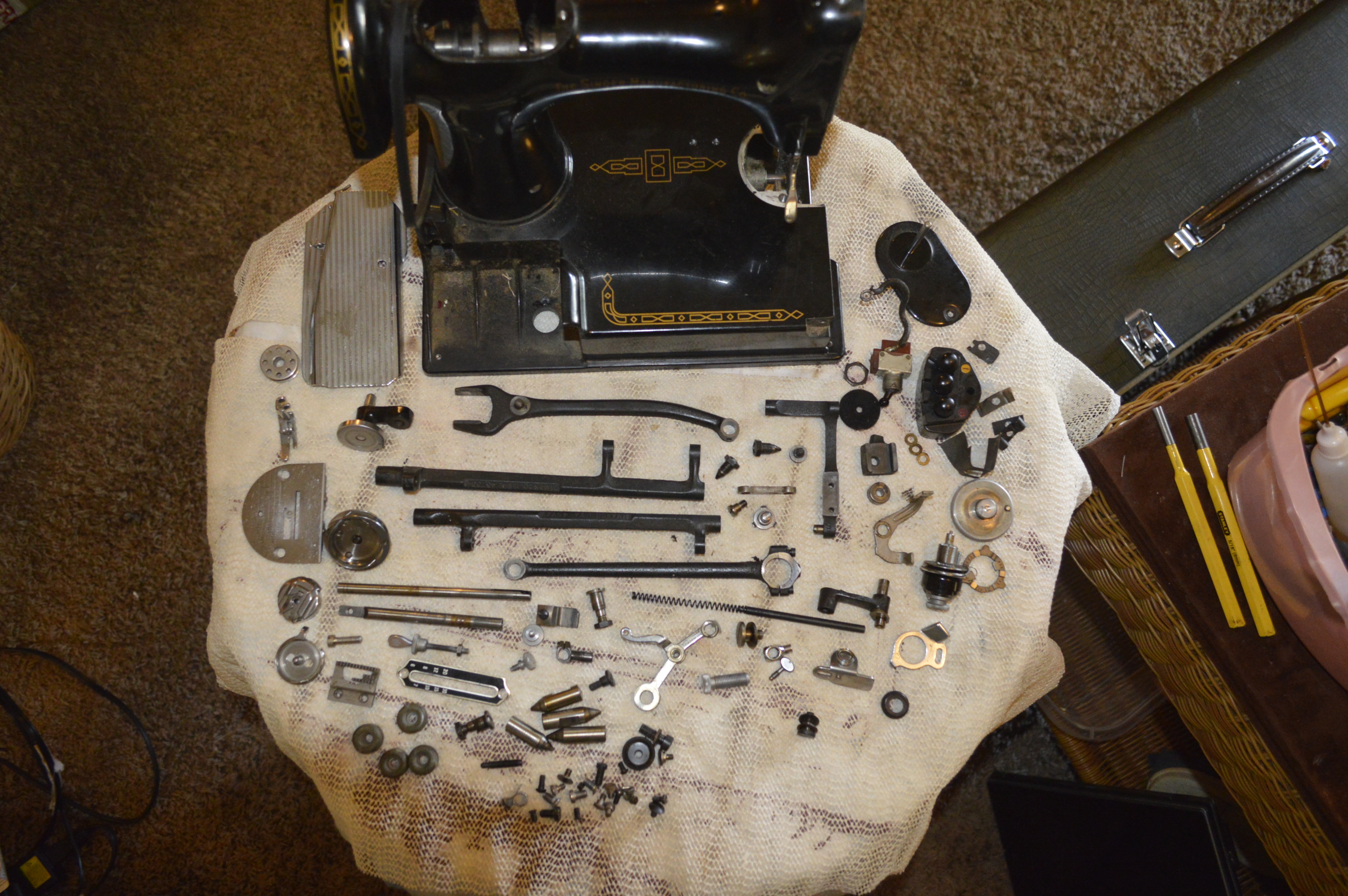 The machine’s sewing mechanisms are reassembled and rough adjustments are made. It is then hooked up to an external electric motor and run for 5 minutes at 1400 rpm. This mates all of the moving parts together and makes the machine incredibly smooth. After this exercise, fine adjustments are made and the motor, light, and all of the bits and pieces are reassembled to the machine.