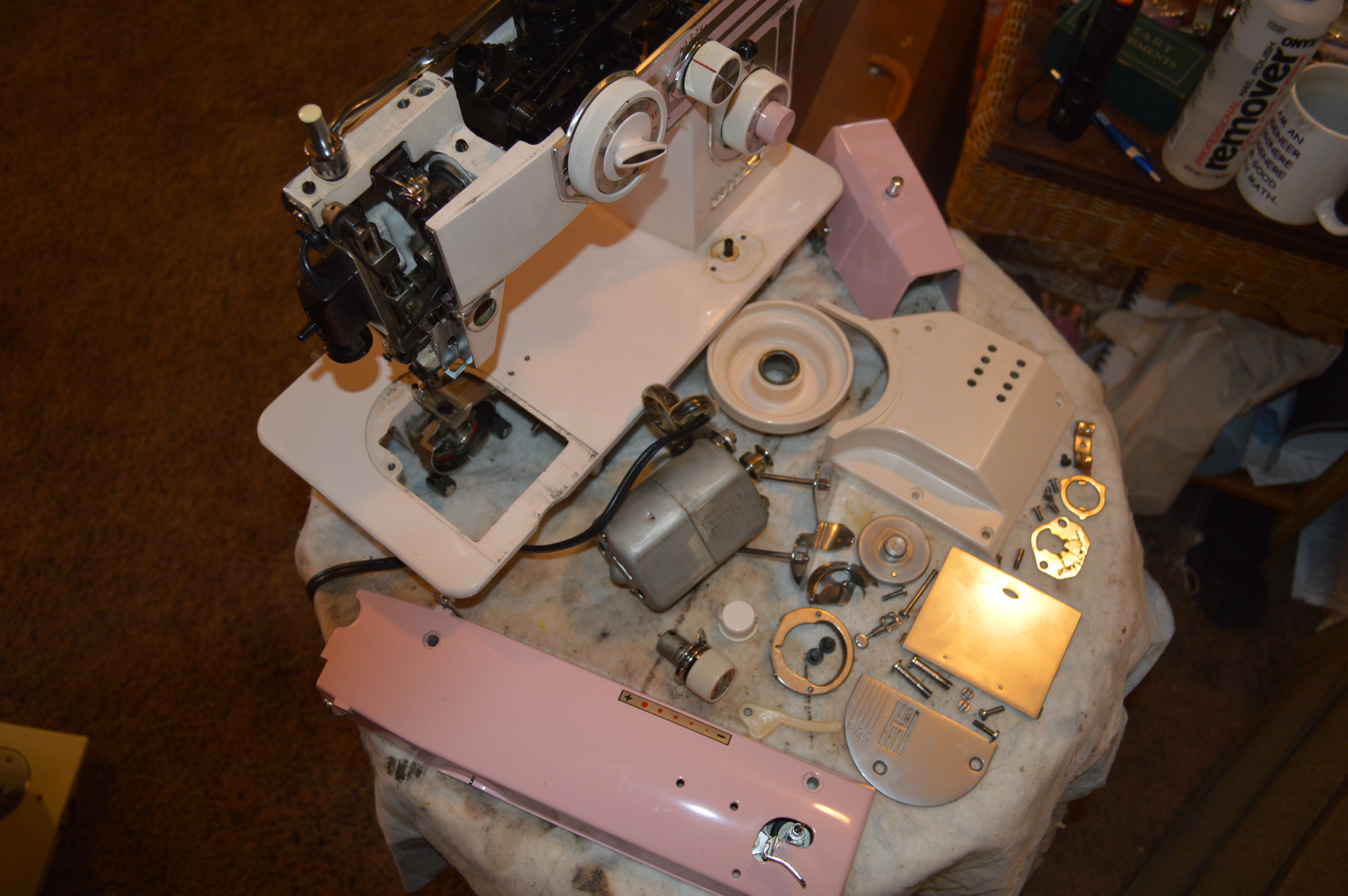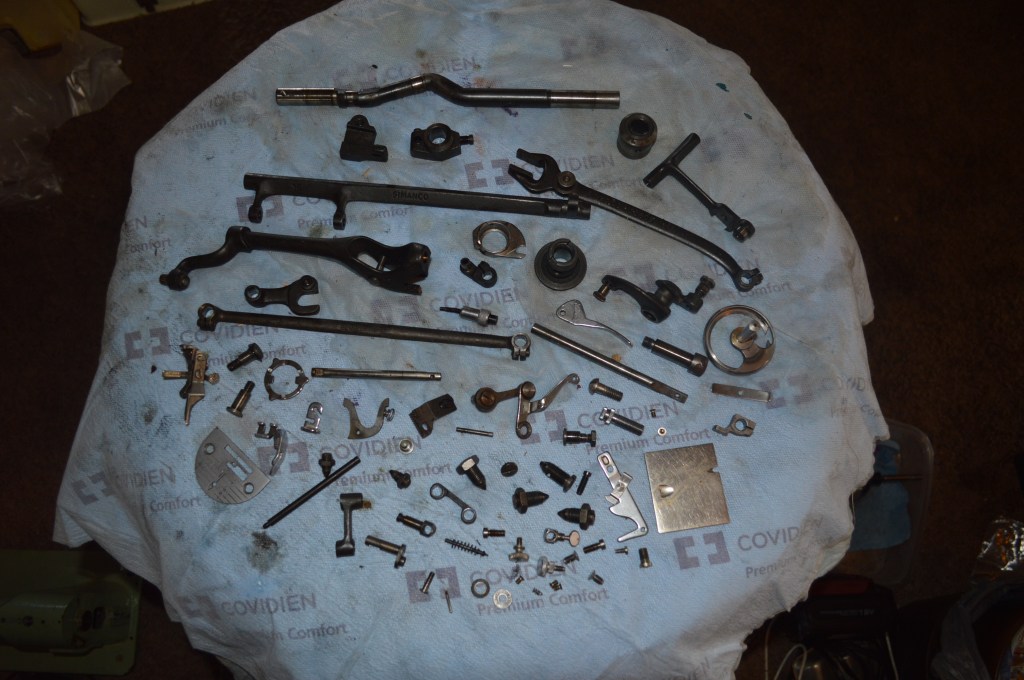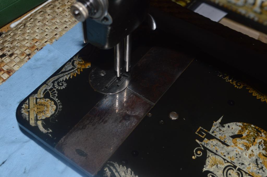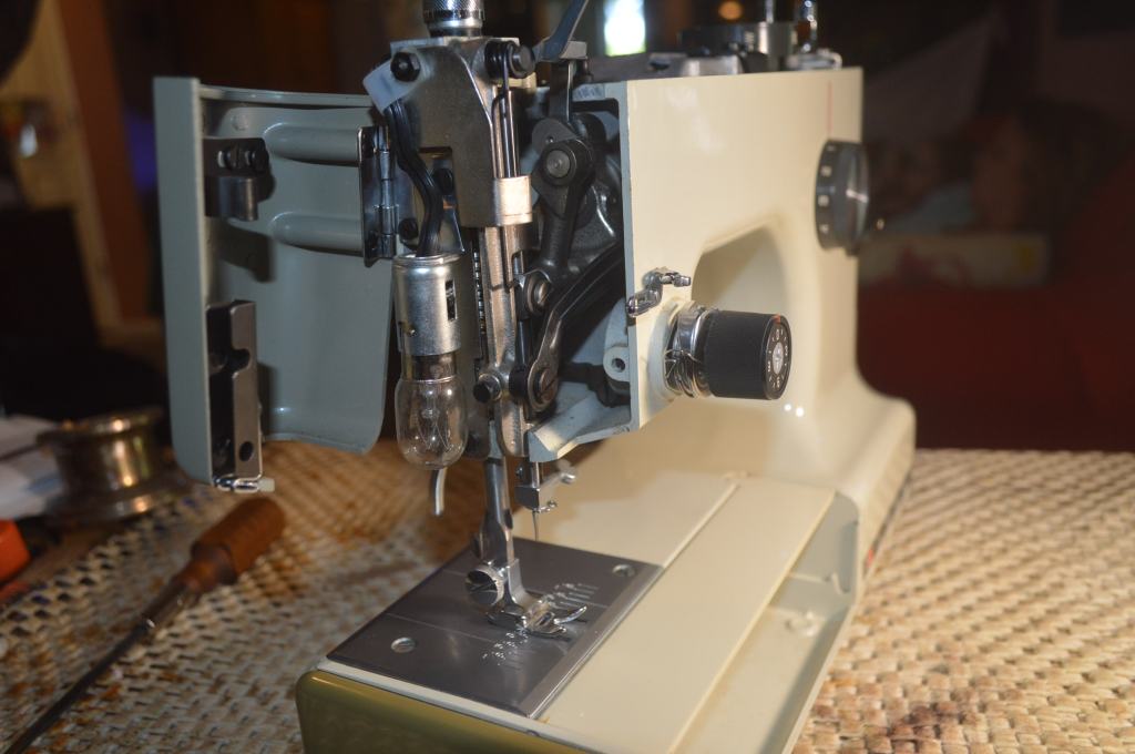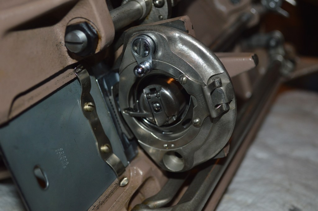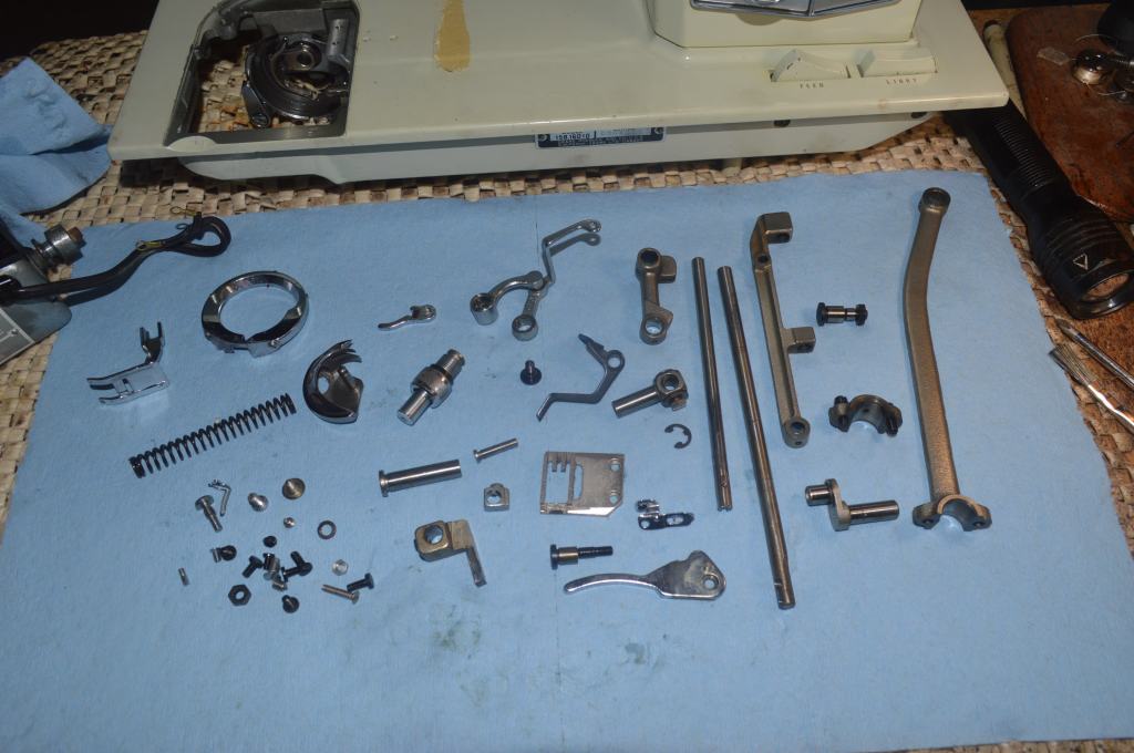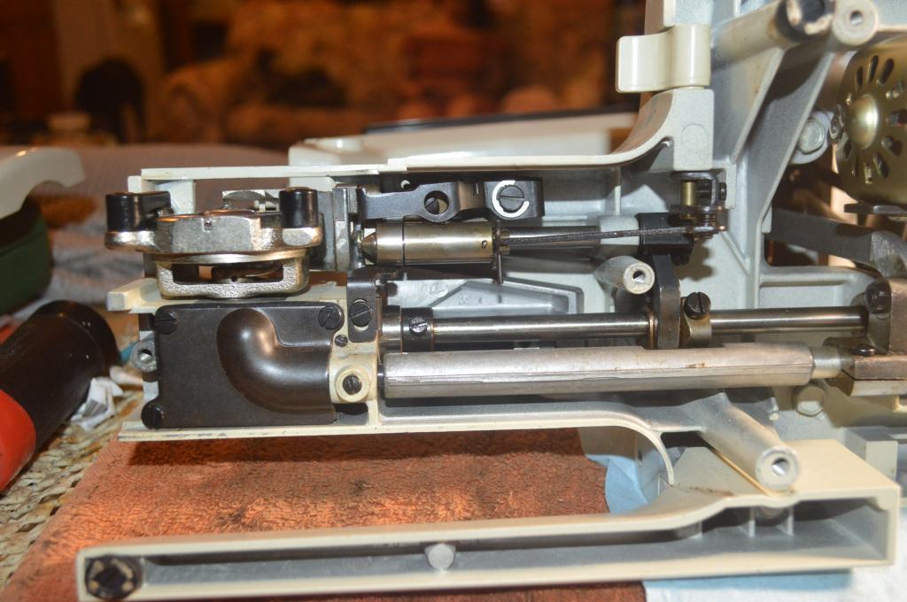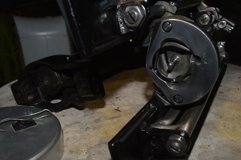 The machine’s sewing mechanisms are reassembled and rough adjustments are made. It is then hooked up to an external electric motor and run for 5 minutes at 1400 rpm. This mates all of the moving parts together and makes the machine incredibly smooth. After this exercise, fine adjustments are made and the motor, light, and all of the bits and pieces are reassembled to the machine.