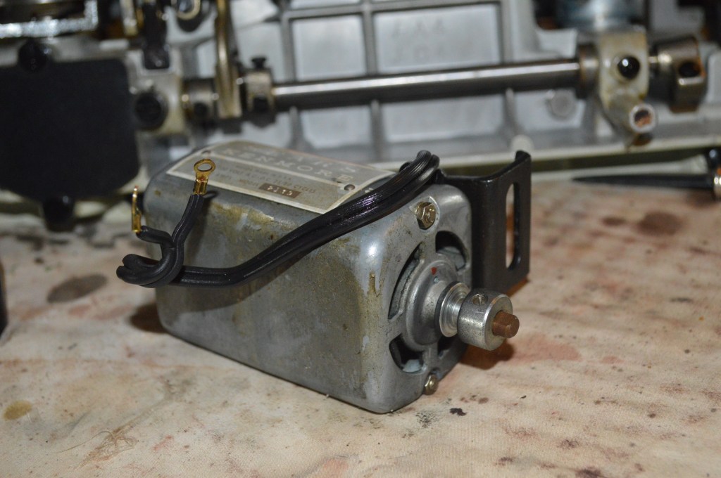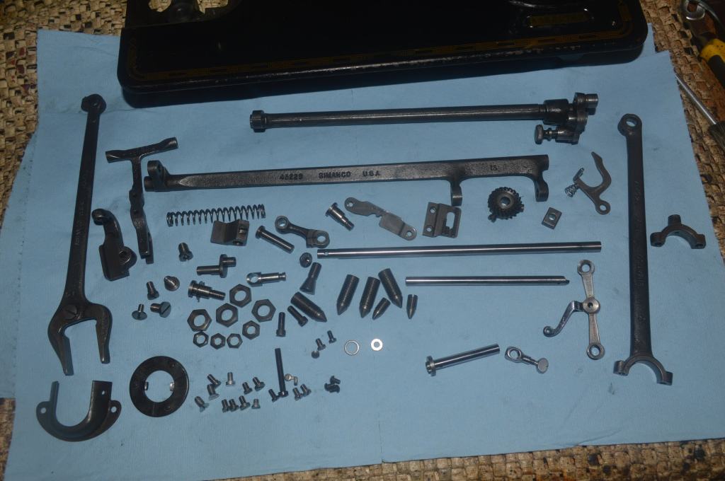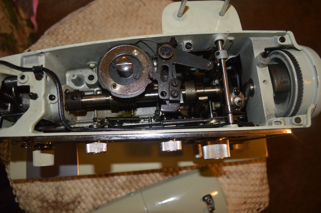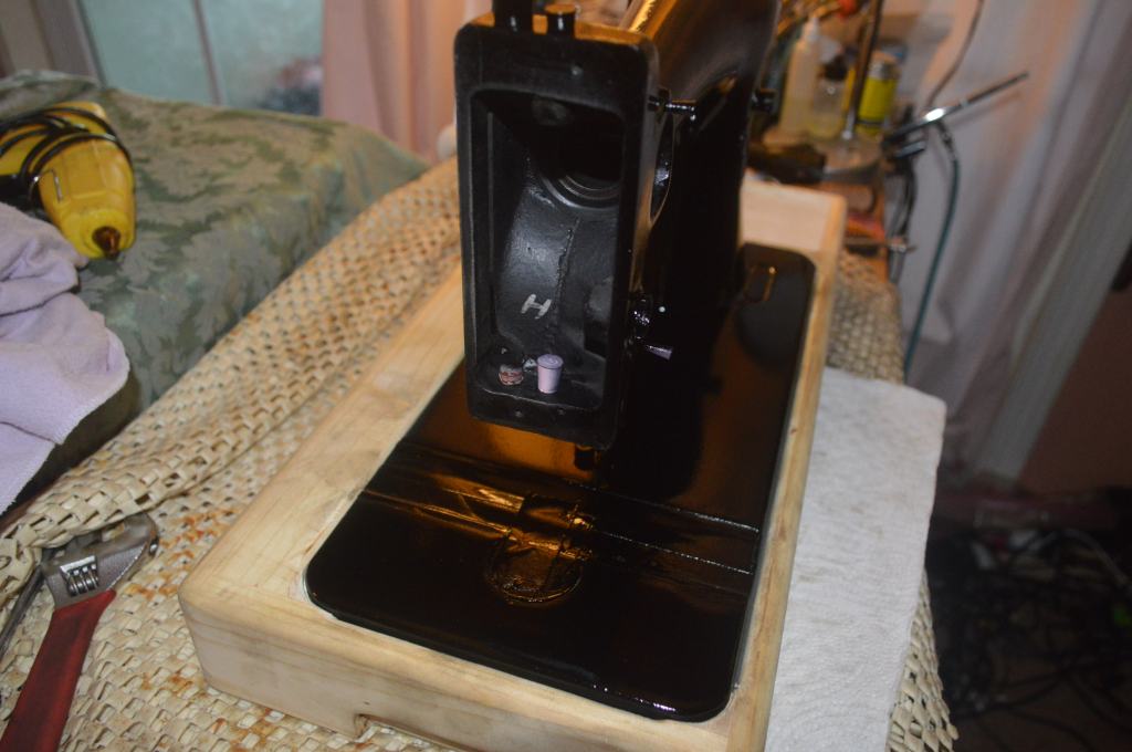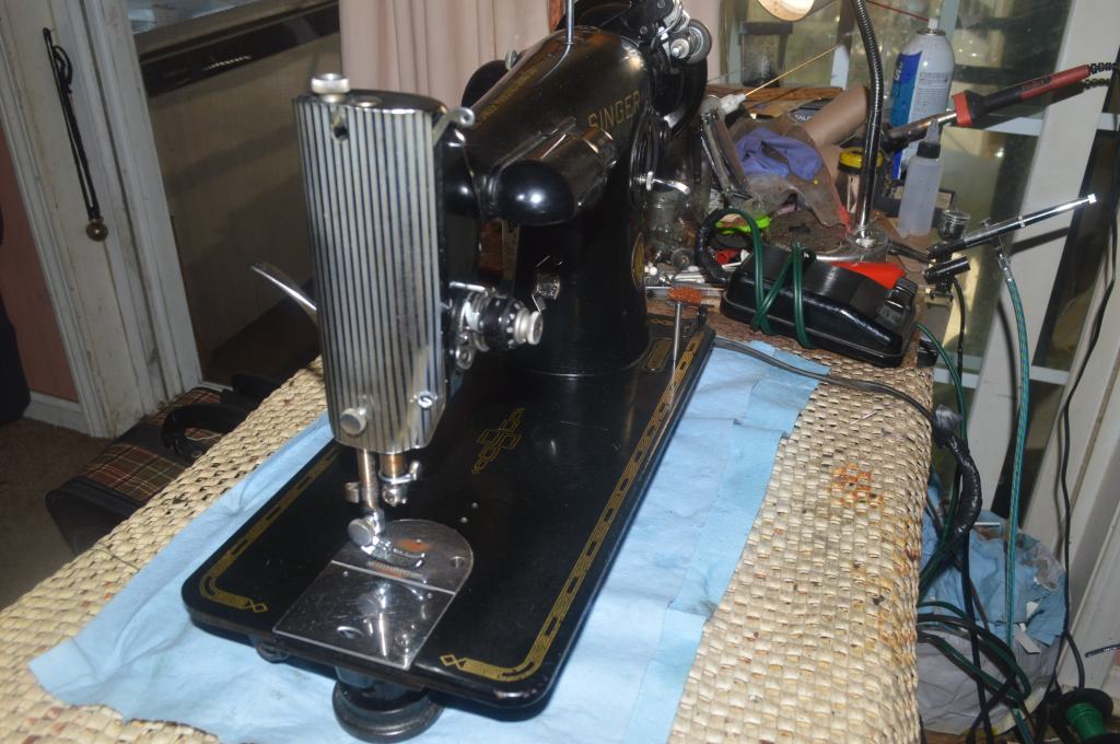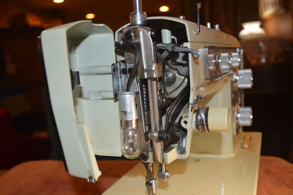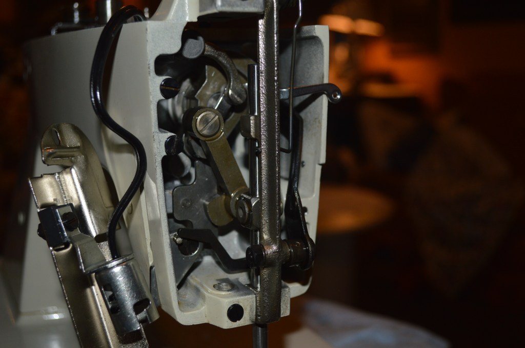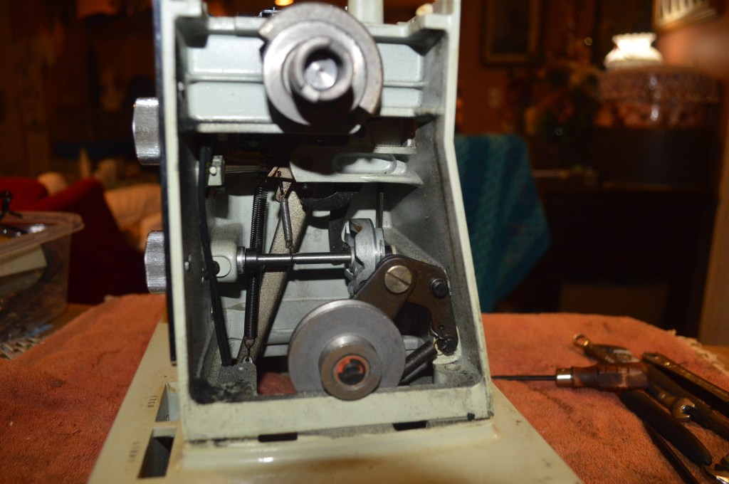 The machine’s sewing mechanisms are reassembled and rough adjustments are made. It is then hooked up to an external electric motor and run for 5 minutes at 1400 rpm. This mates all of the moving parts together and makes the machine incredibly smooth. After this exercise, fine adjustments are made and the motor, light, and all of the bits and pieces are reassembled to the machine.