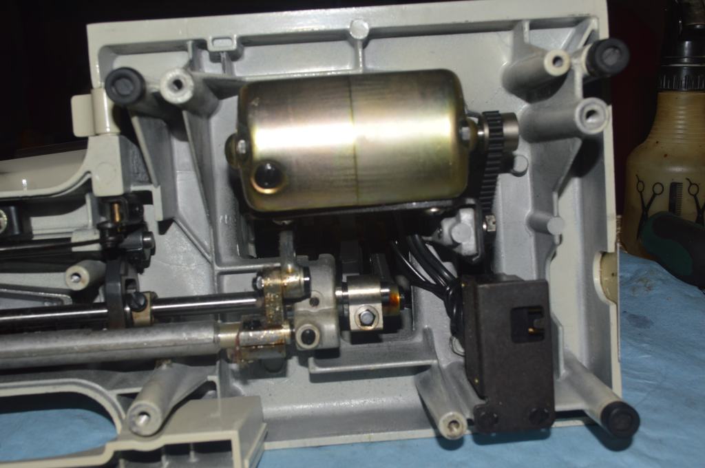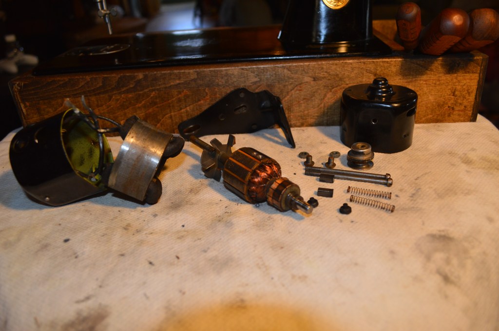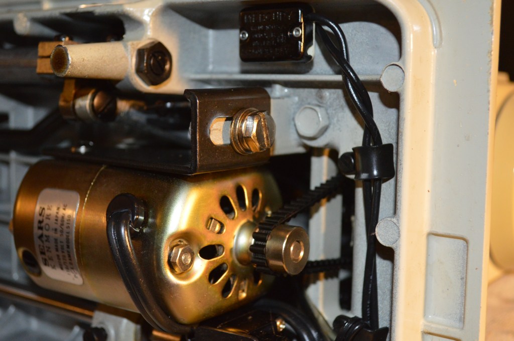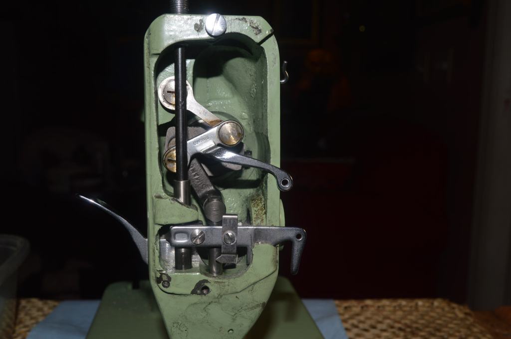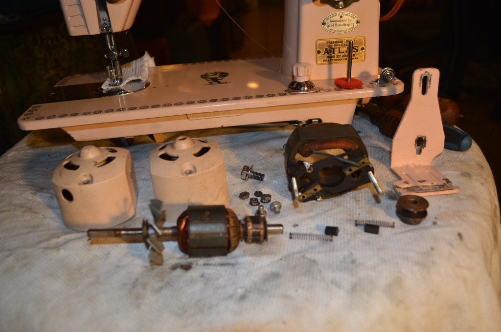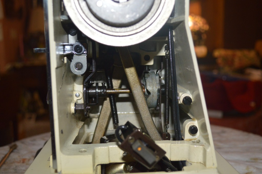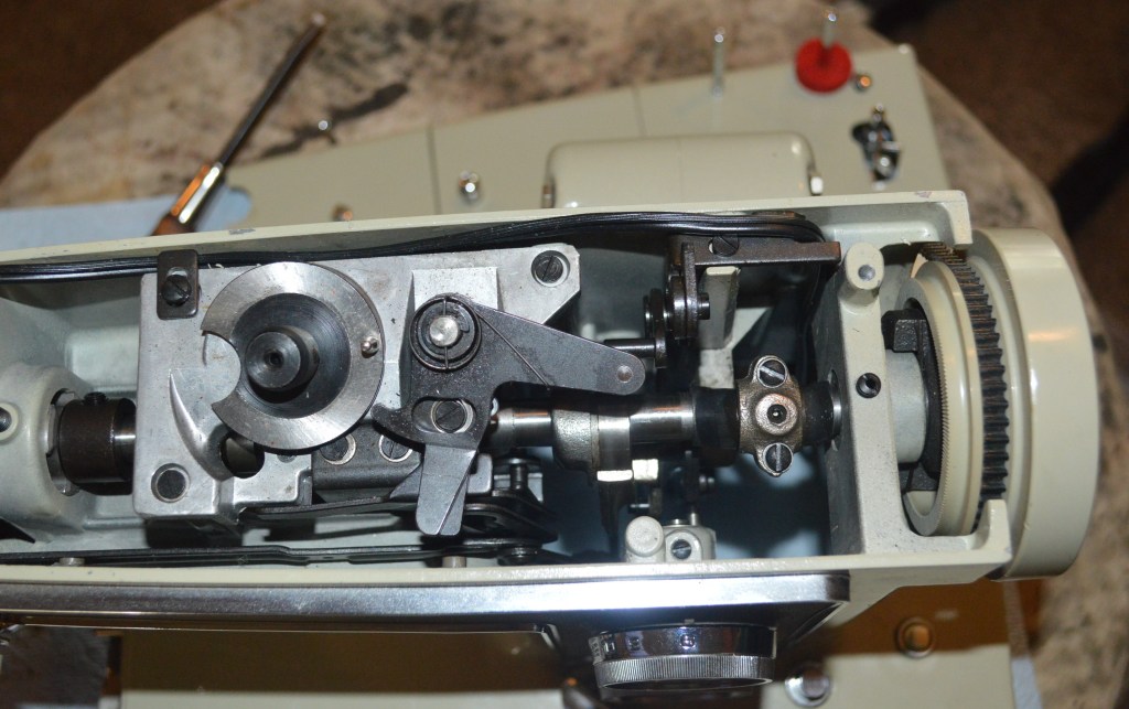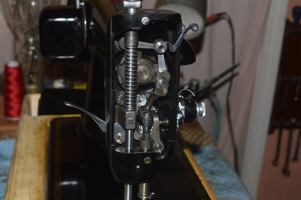 The machine’s sewing mechanisms are reassembled and rough adjustments are made. It is then hooked up to an external electric motor and run for 5 minutes at 1400 rpm. This mates all of the moving parts together and makes the machine incredibly smooth. After this exercise, fine adjustments are made and the motor, light, and all of the bits and pieces are reassembled to the machine.