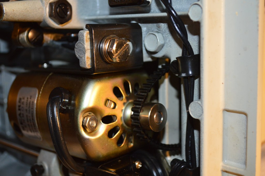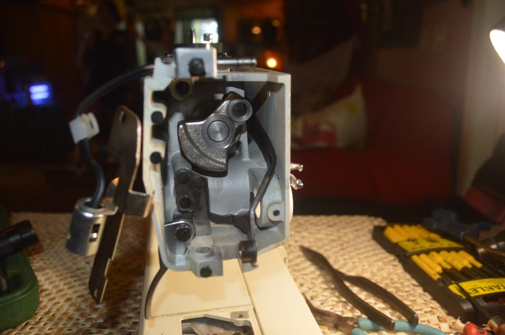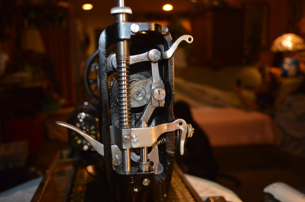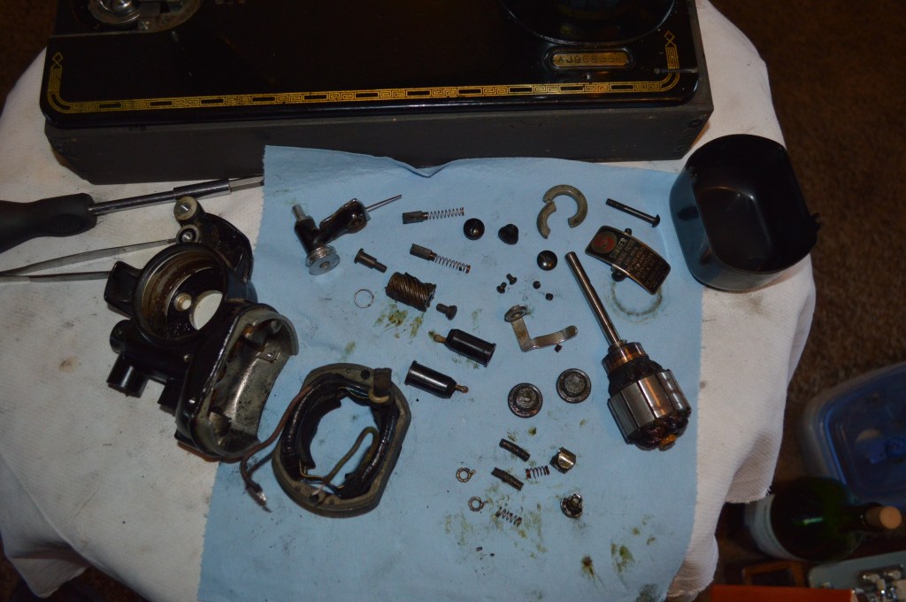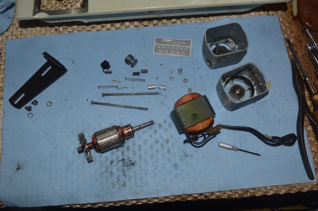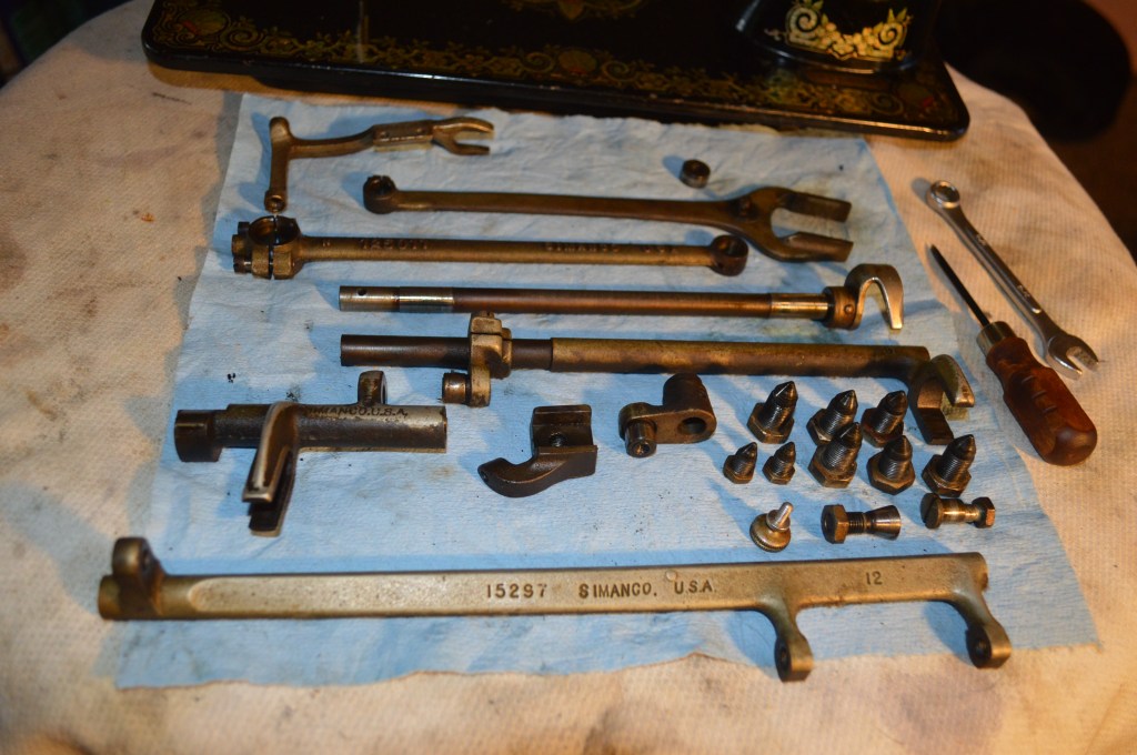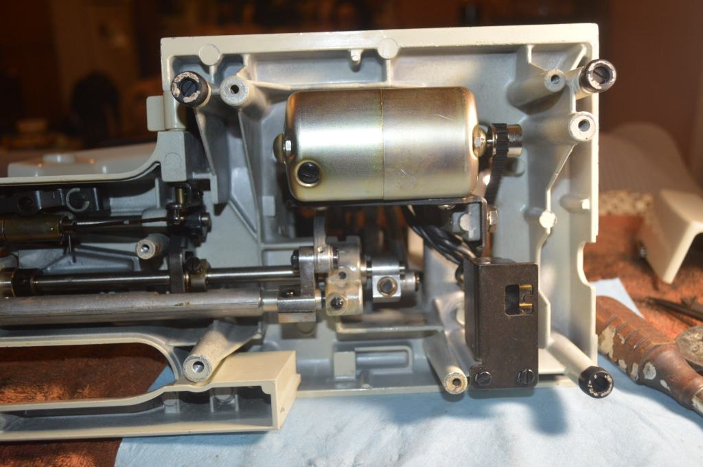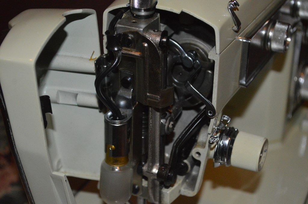 The machine’s sewing mechanisms are reassembled and rough adjustments are made. It is then hooked up to an external electric motor and run for 5 minutes at 1400 rpm. This mates all of the moving parts together and makes the machine incredibly smooth. After this exercise, fine adjustments are made and the motor, light, and all of the bits and pieces are reassembled to the machine.