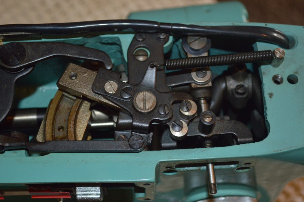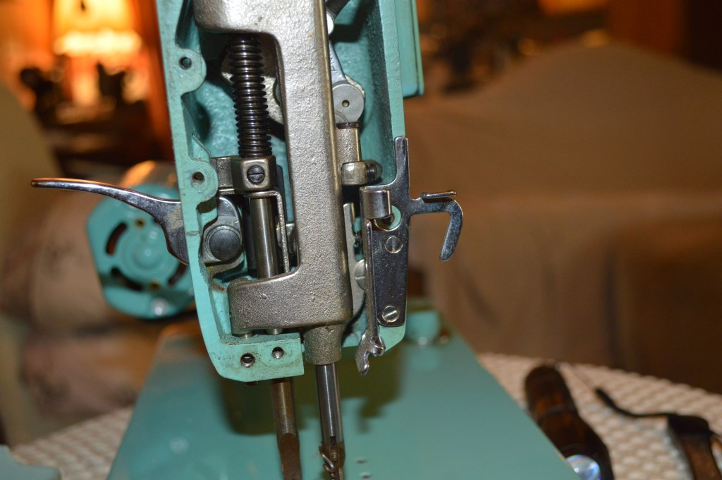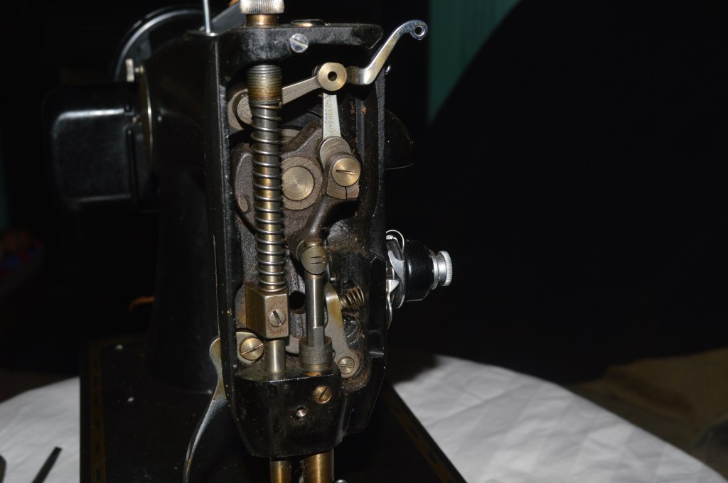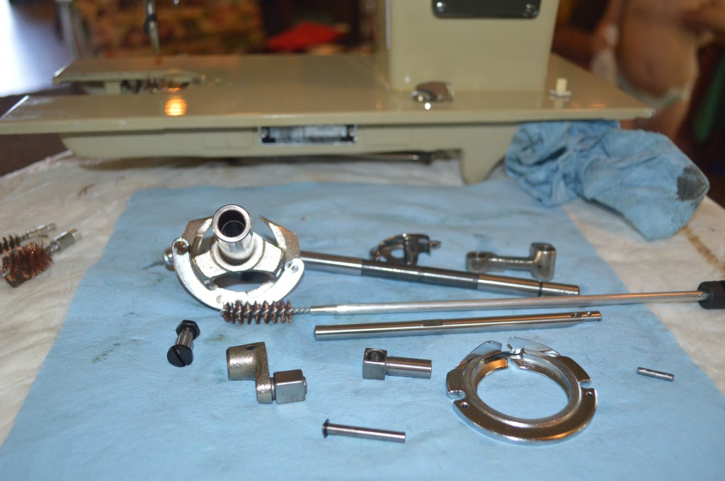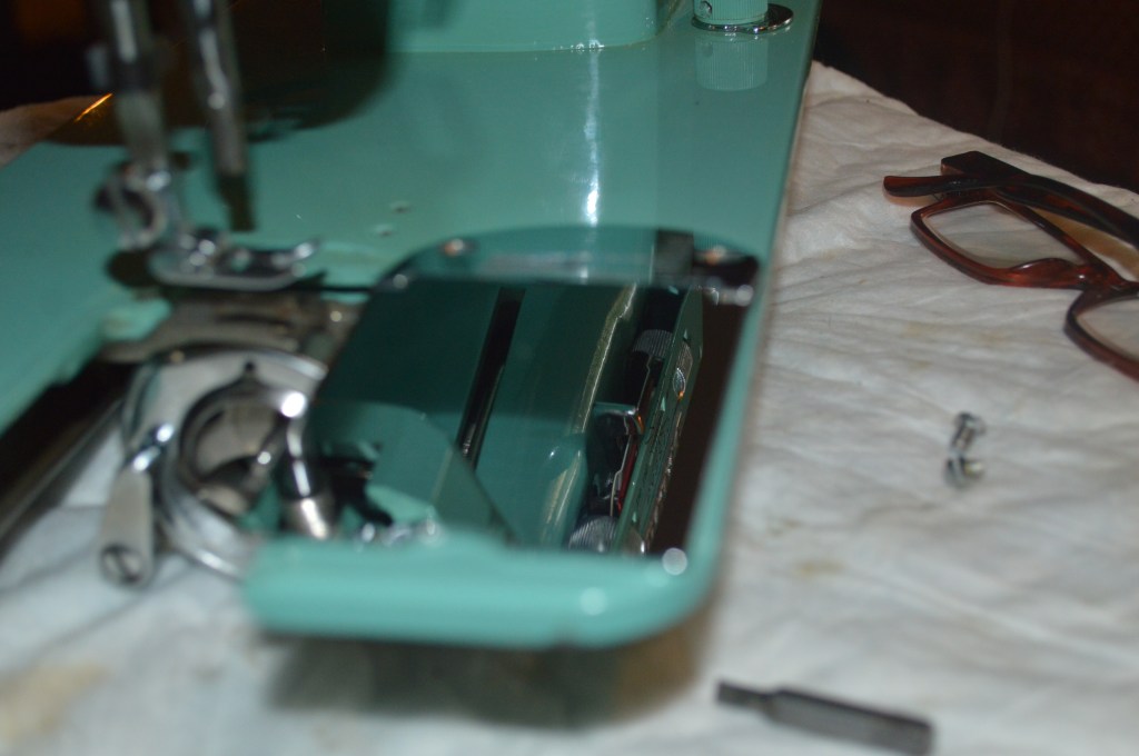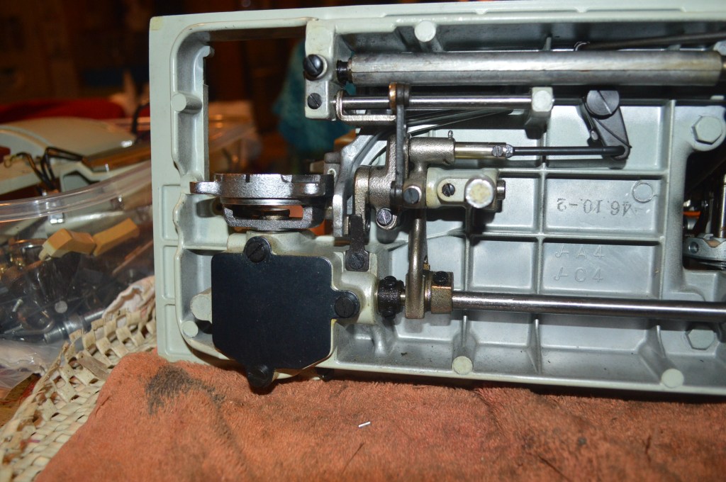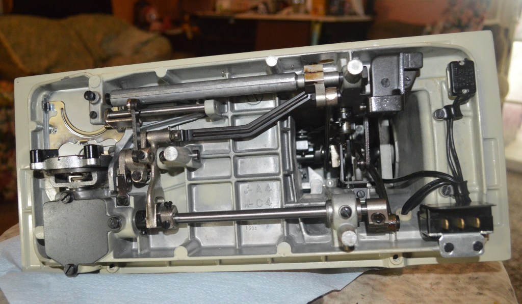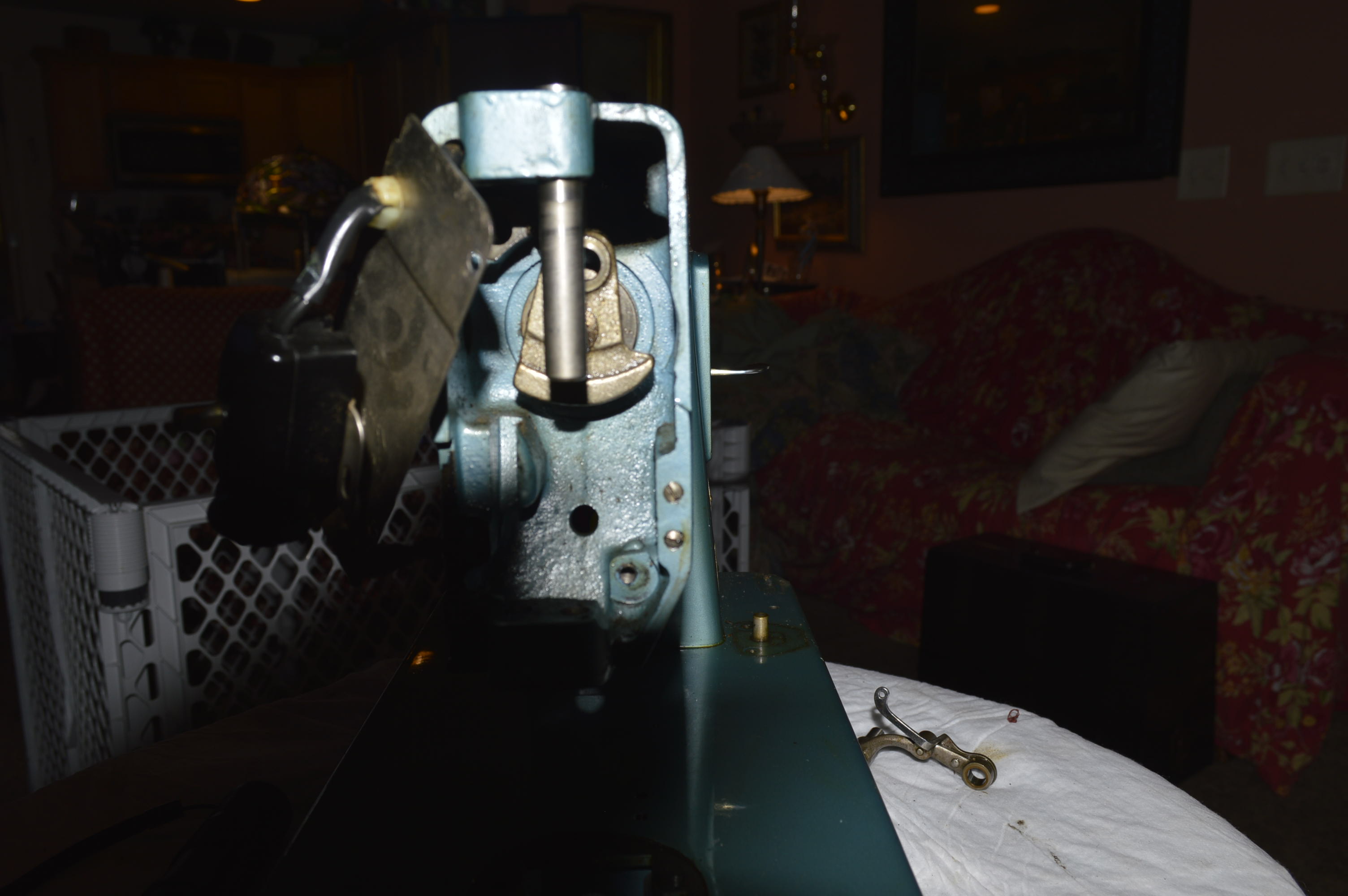 The machine’s sewing mechanisms are reassembled and rough adjustments are made. It is then hooked up to an external electric motor and run for 5 minutes at 1400 rpm. This mates all of the moving parts together and makes the machine incredibly smooth. After this exercise, fine adjustments are made and the motor, light, and all of the bits and pieces are reassembled to the machine.
