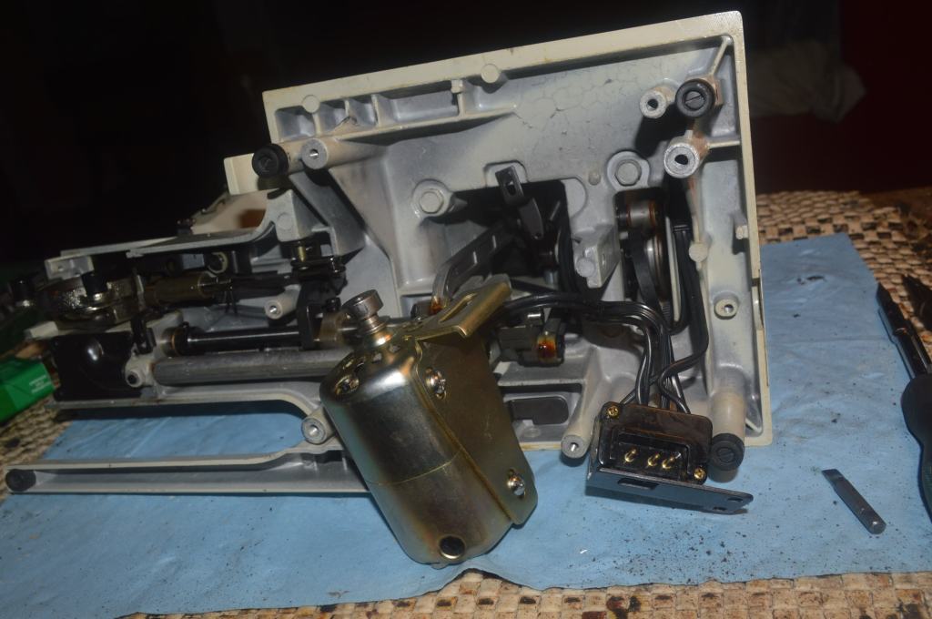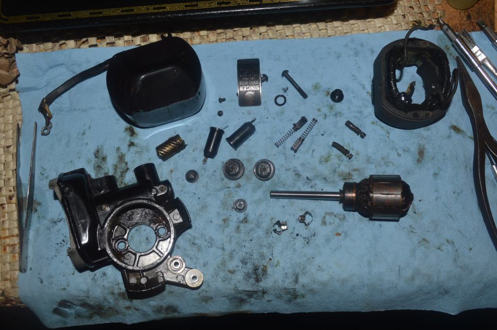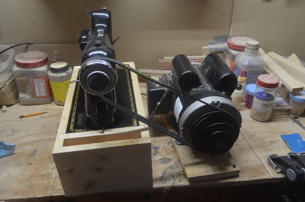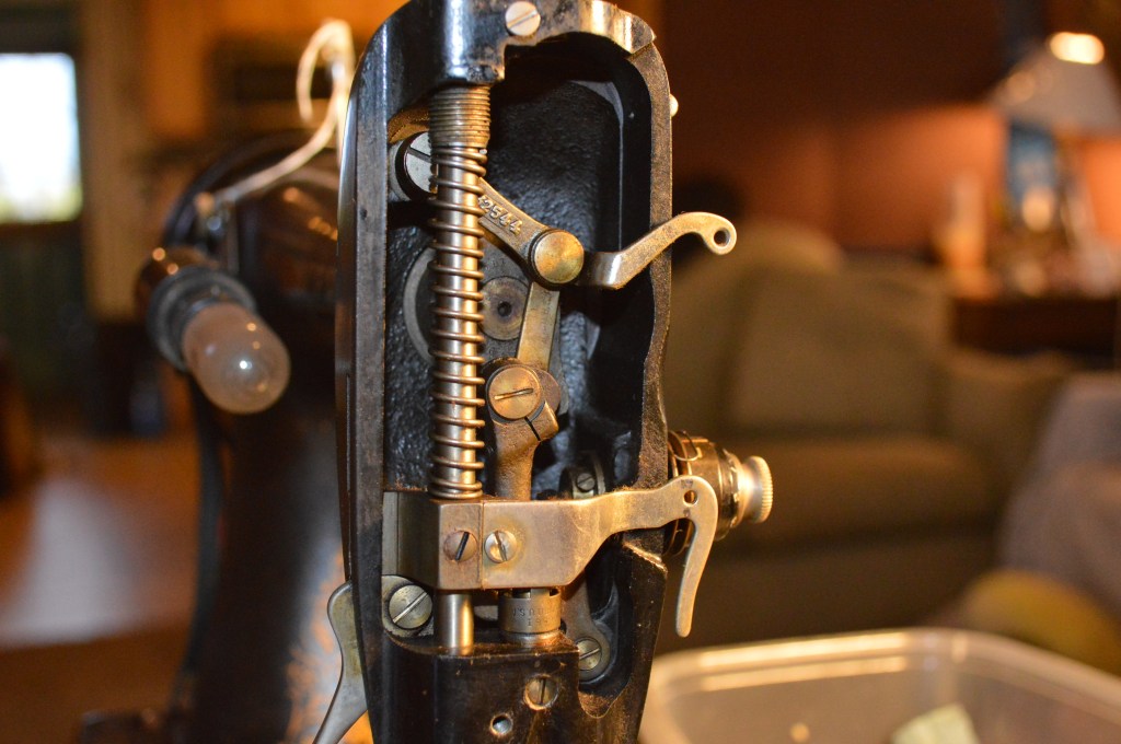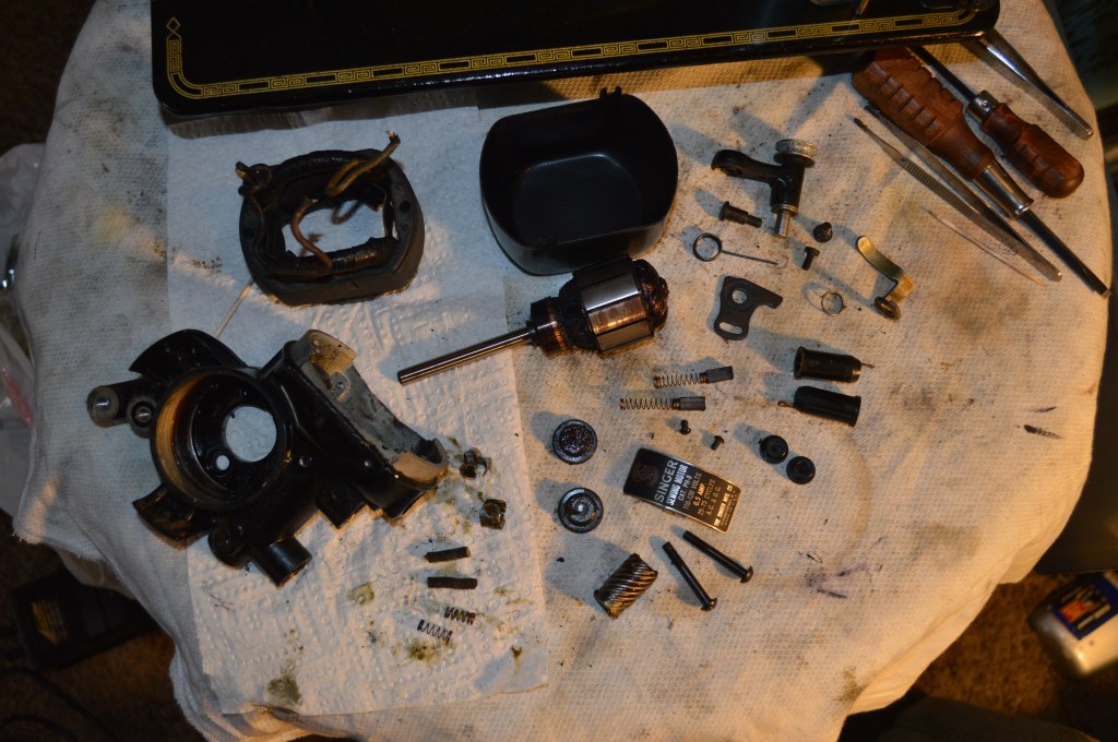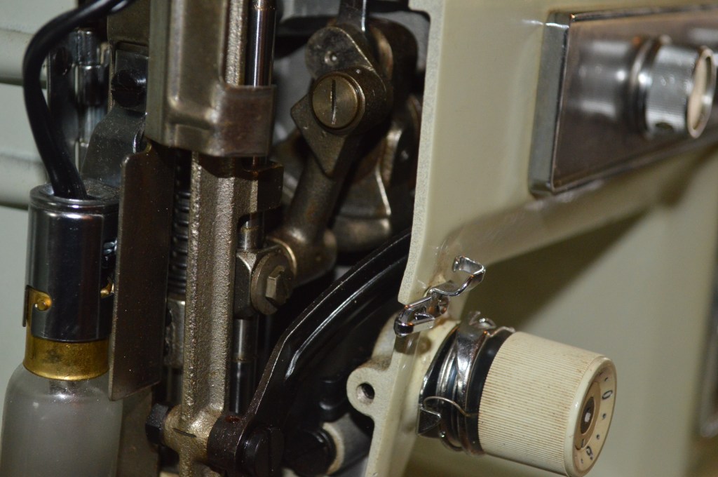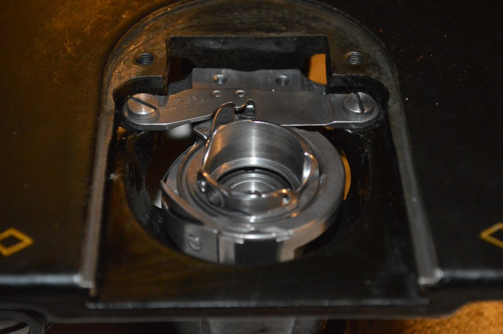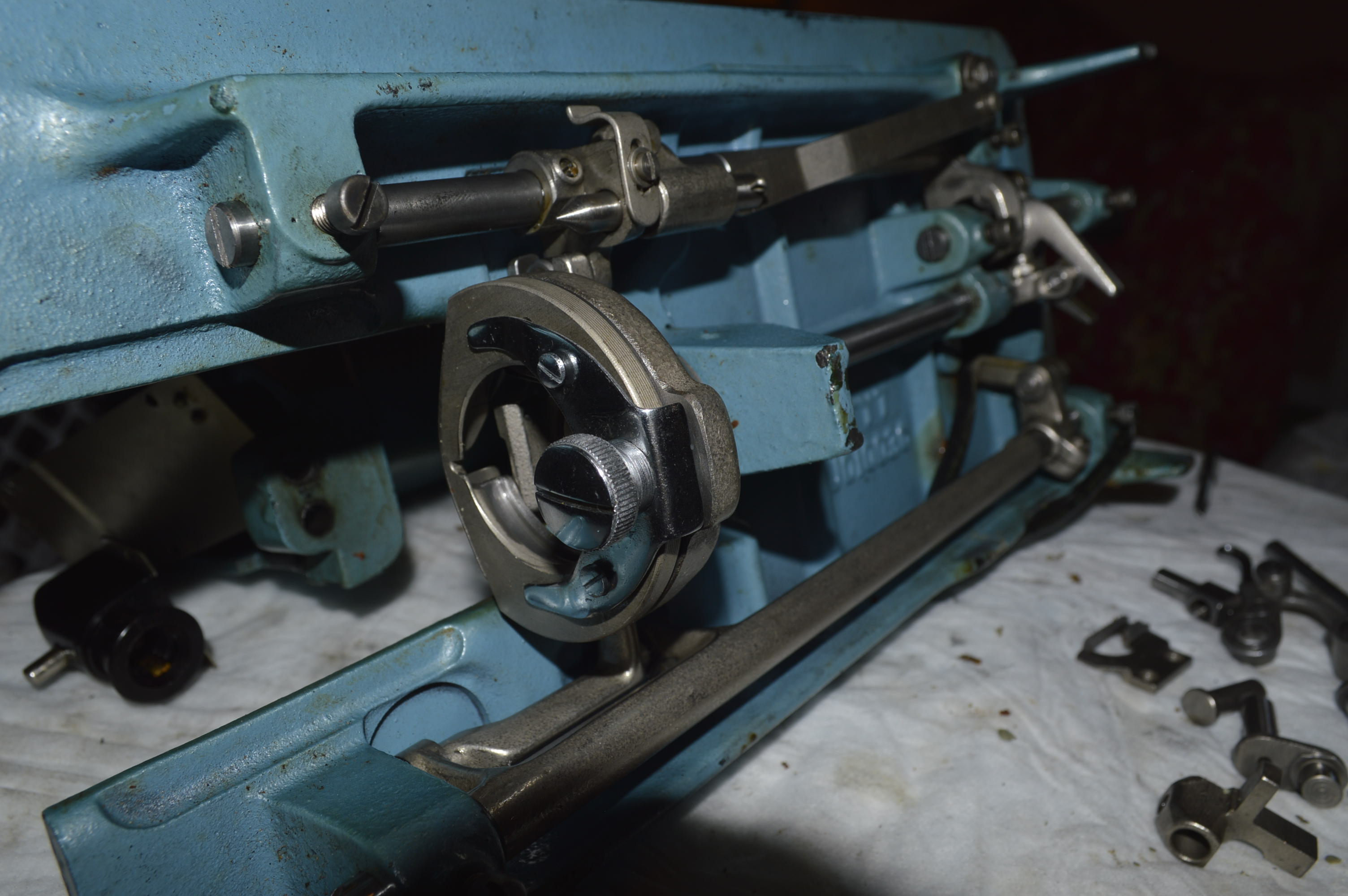 The machine’s sewing mechanisms are reassembled and rough adjustments are made. It is then hooked up to an external electric motor and run for 5 minutes at 1400 rpm. This mates all of the moving parts together and makes the machine incredibly smooth. After this exercise, fine adjustments are made and the motor, light, and all of the bits and pieces are reassembled to the machine.