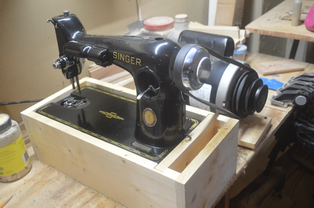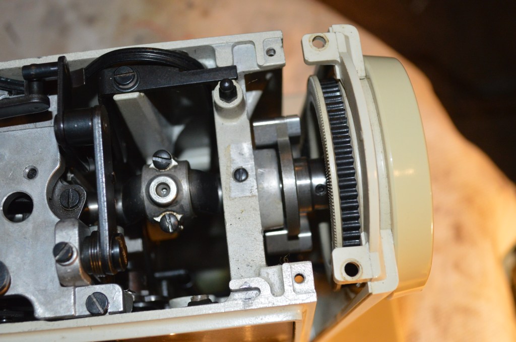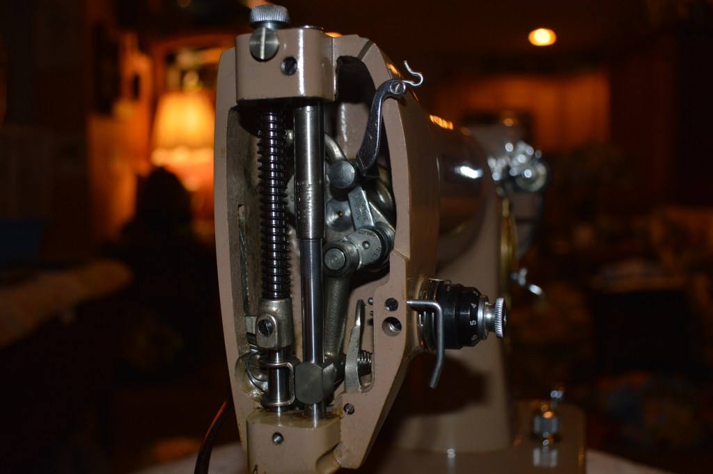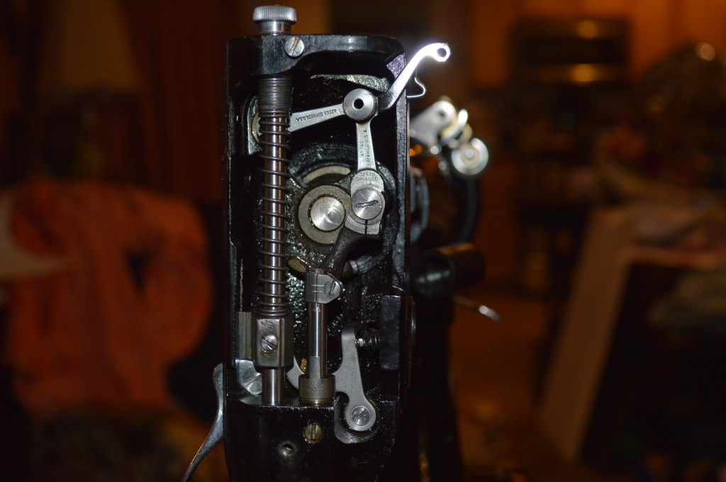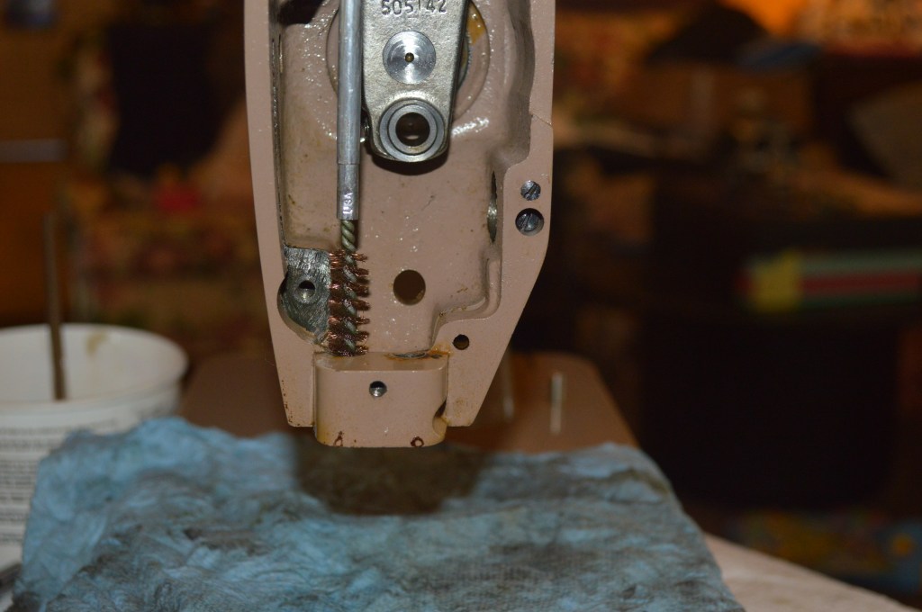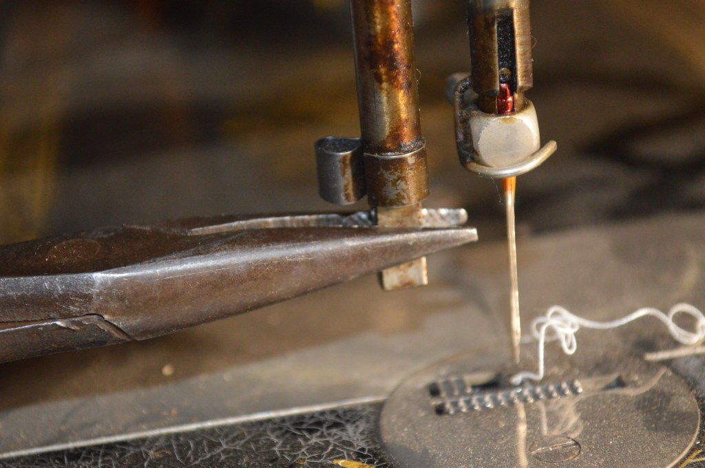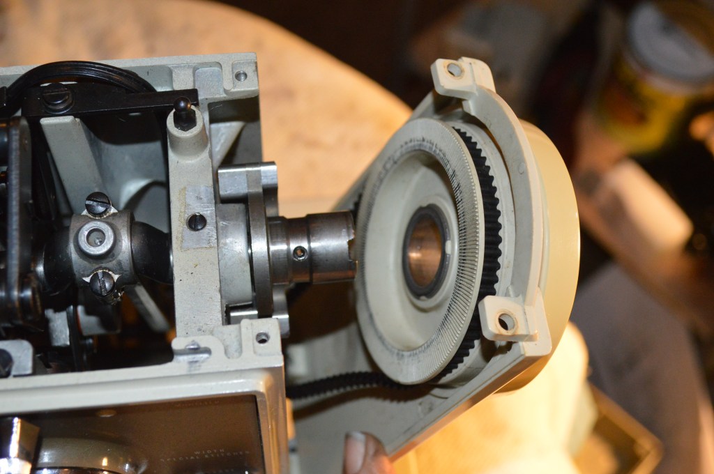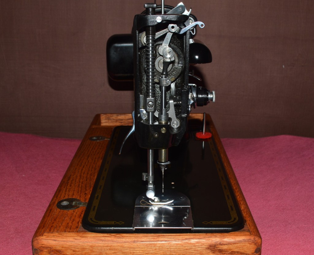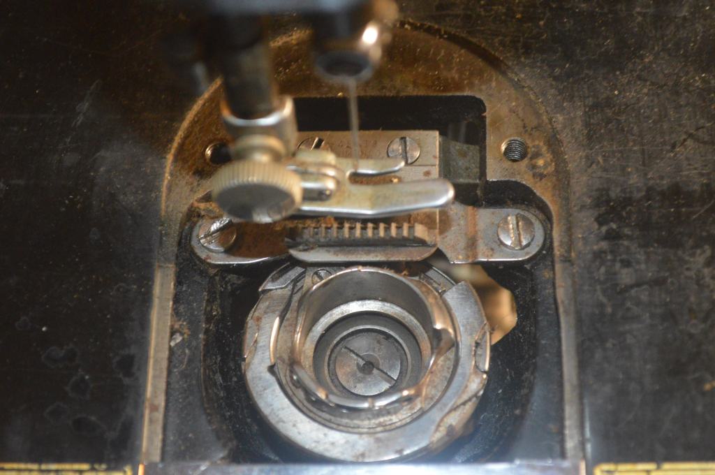 The machine’s sewing mechanisms are reassembled and rough adjustments are made. It is then hooked up to an external electric motor and run for 5 minutes at 1400 rpm. This mates all of the moving parts together and makes the machine incredibly smooth. After this exercise, fine adjustments are made and the motor, light, and all of the bits and pieces are reassembled to the machine.