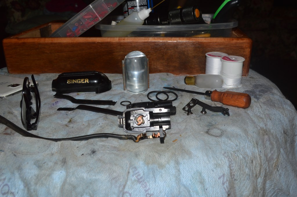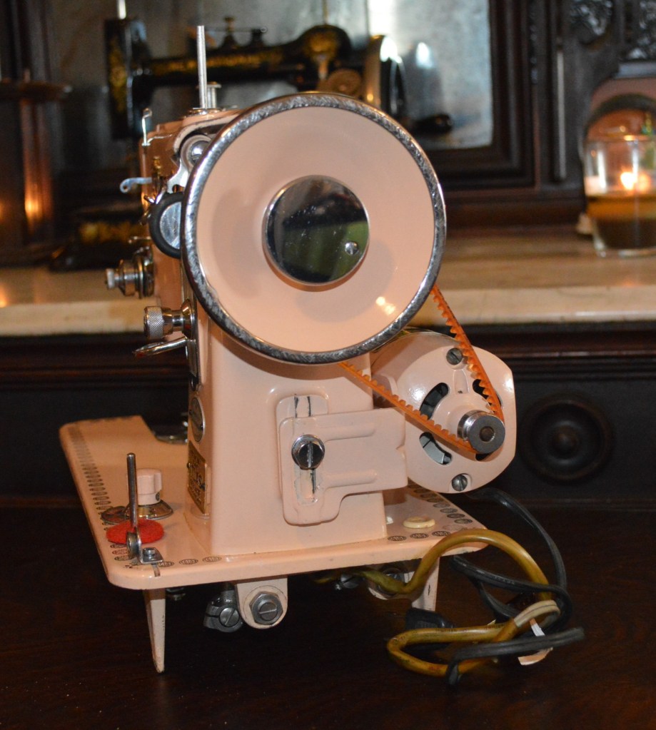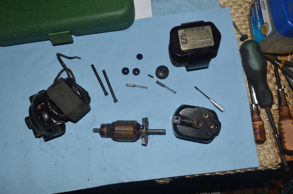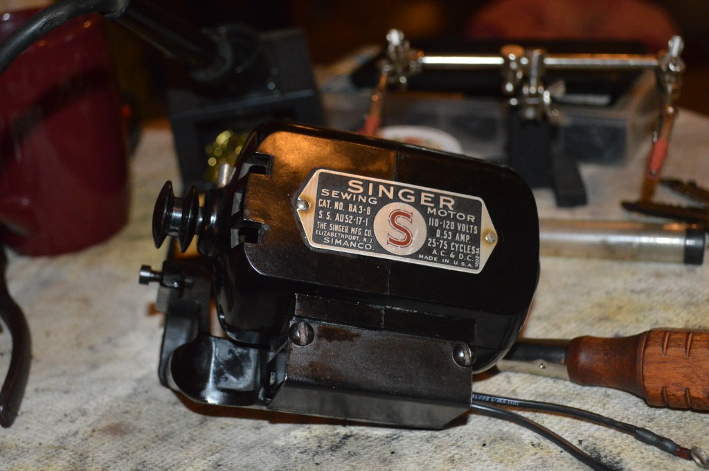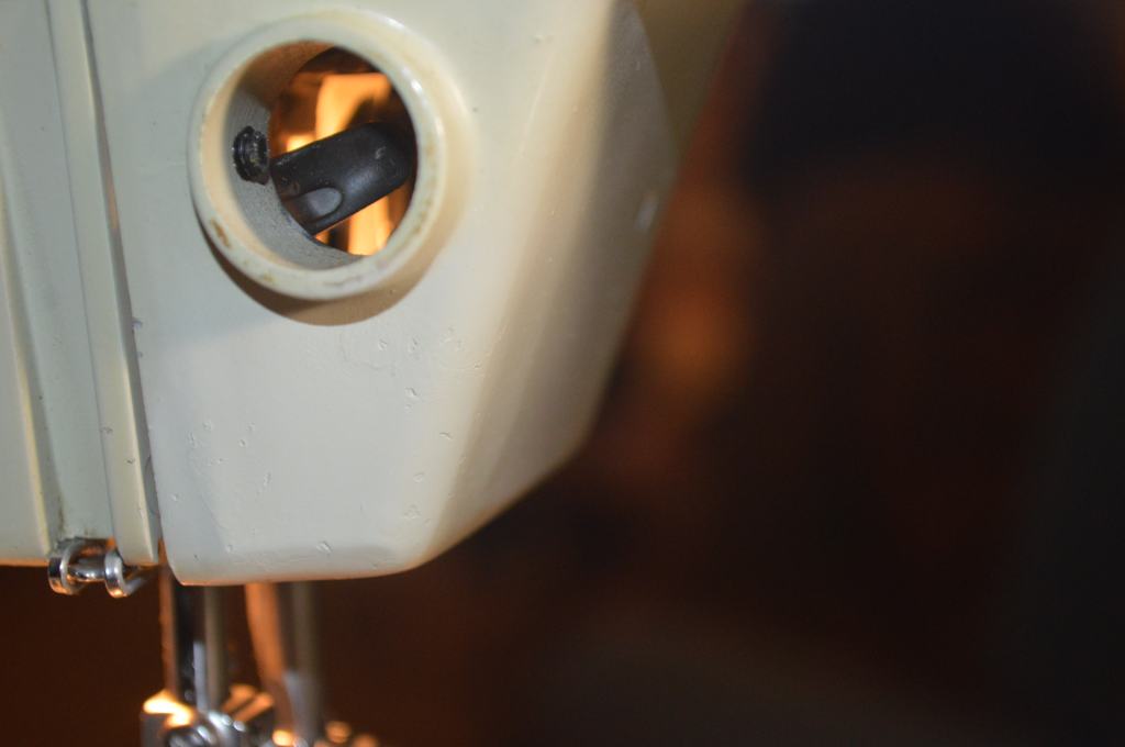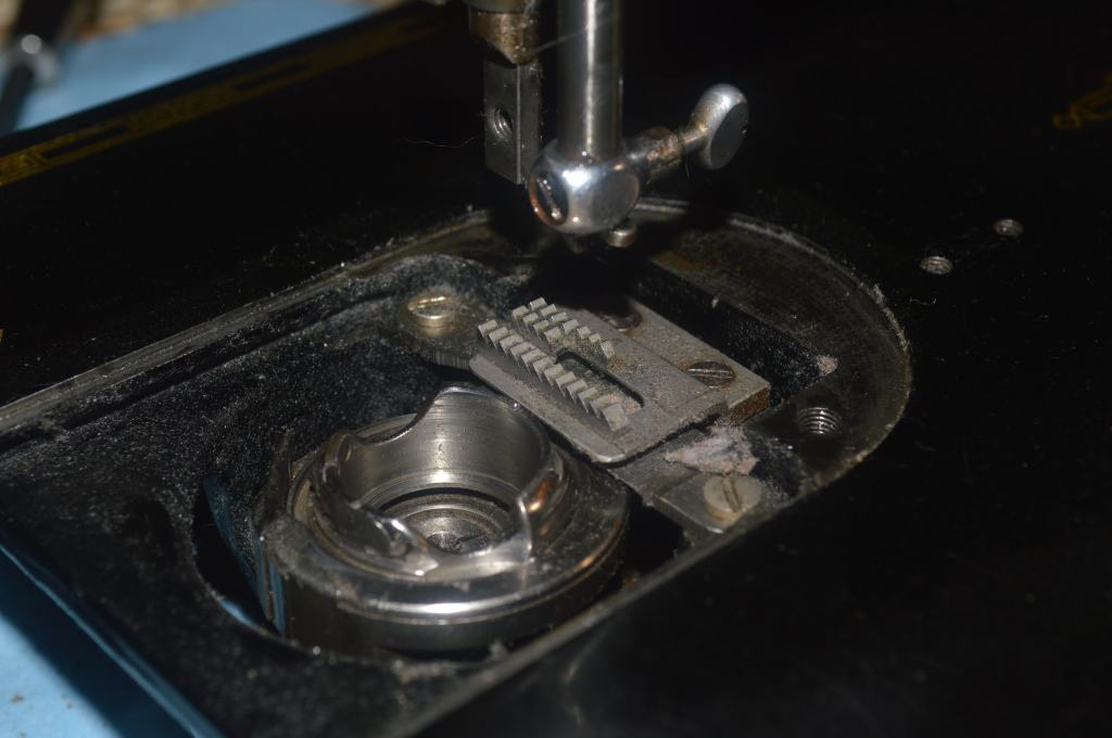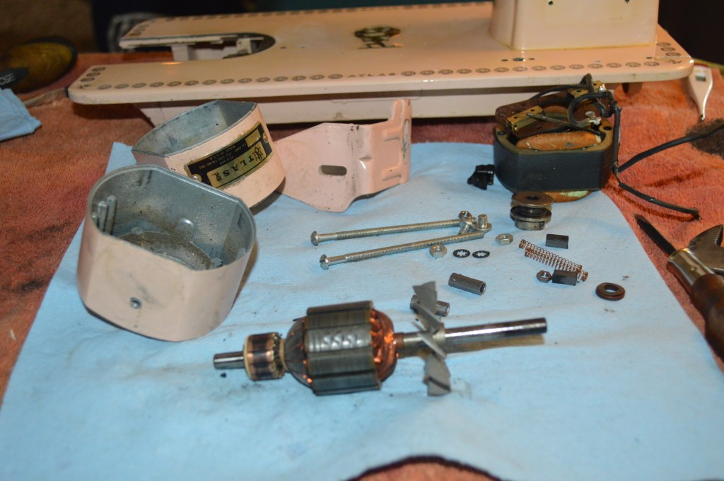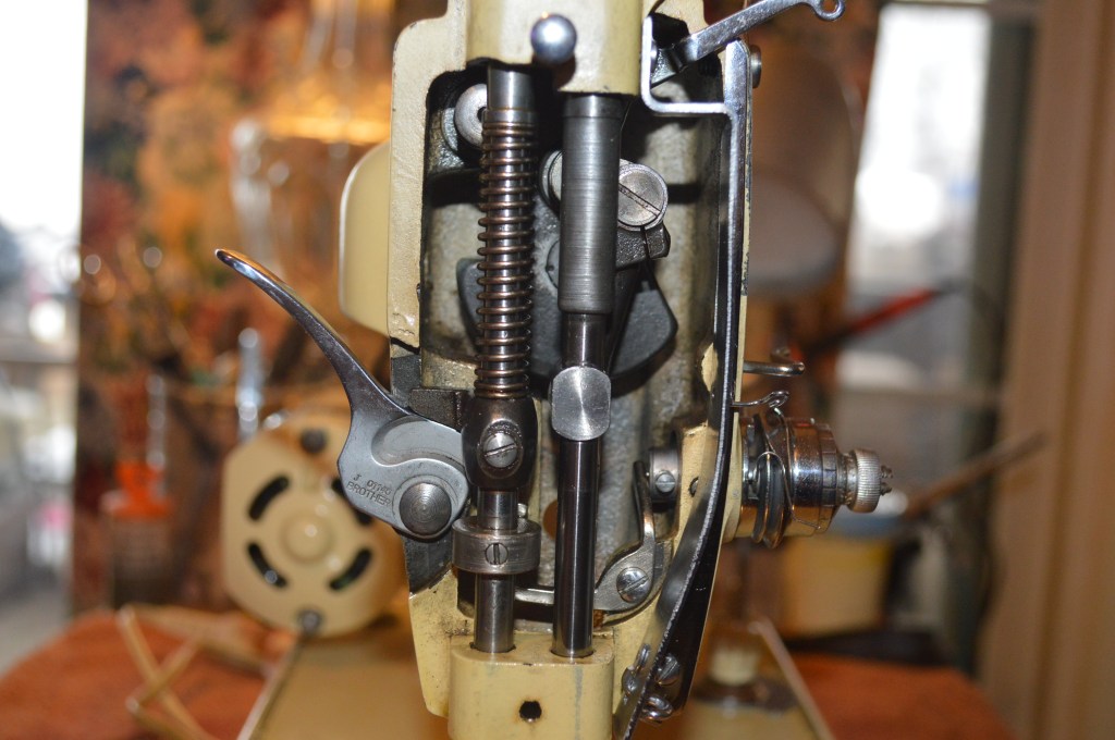 The machine’s sewing mechanisms are reassembled and rough adjustments are made. It is then hooked up to an external electric motor and run for 5 minutes at 1400 rpm. This mates all of the moving parts together and makes the machine incredibly smooth. After this exercise, fine adjustments are made and the motor, light, and all of the bits and pieces are reassembled to the machine.
