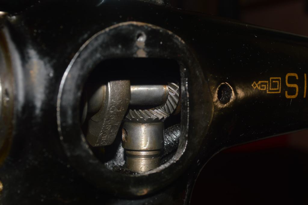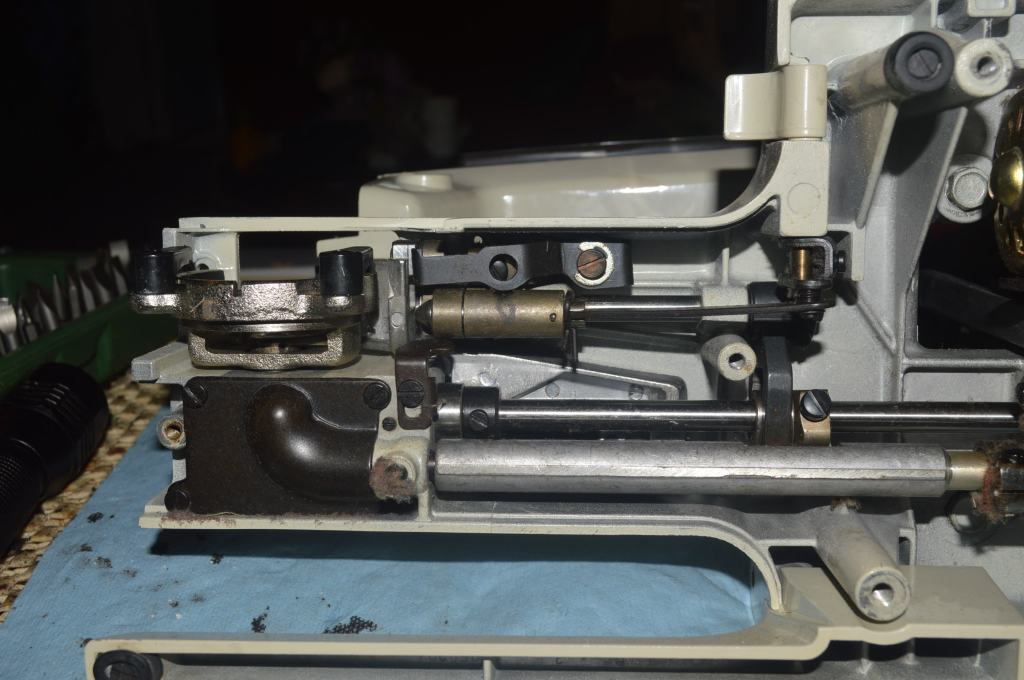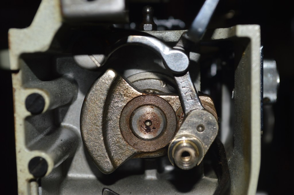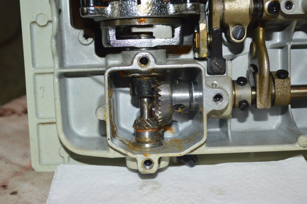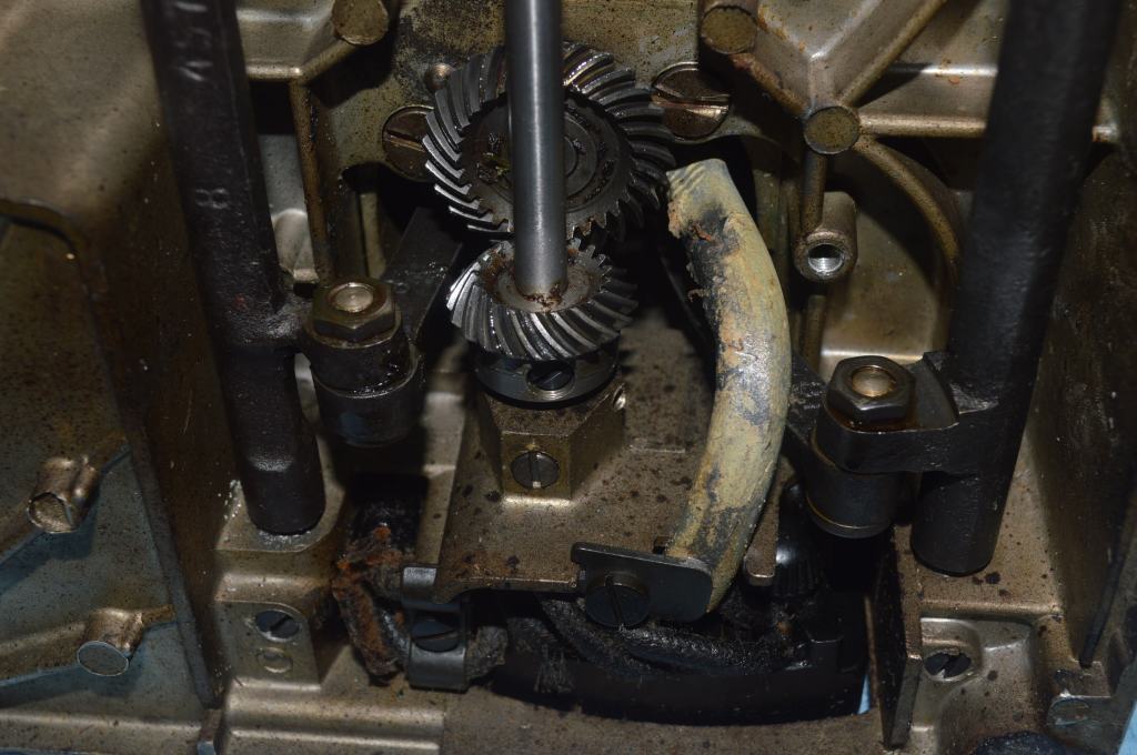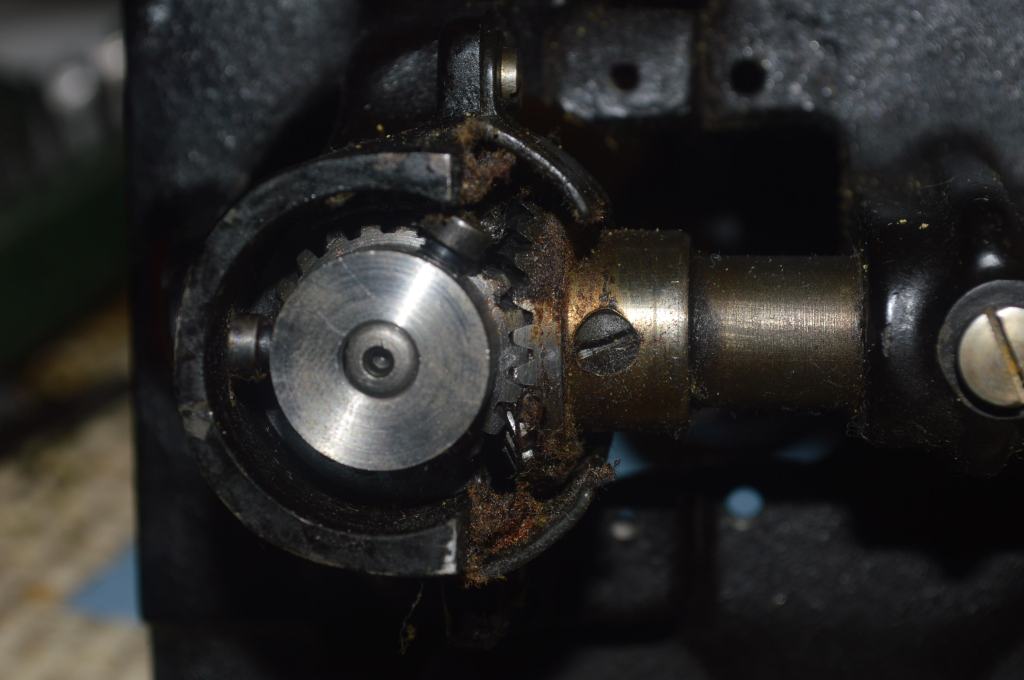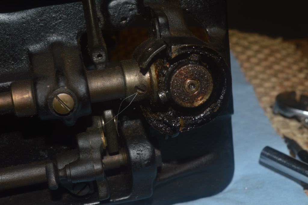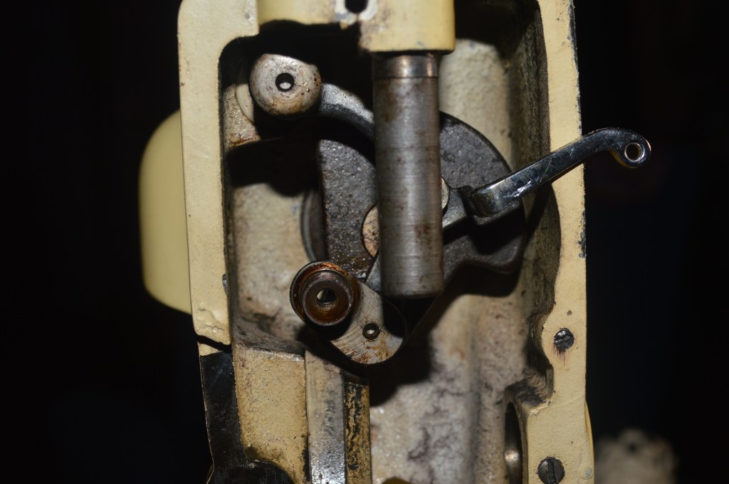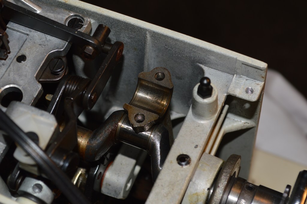 The plan included the disassembly of the top shaft and stitch length fork… The following picture convinced me not to attept this.