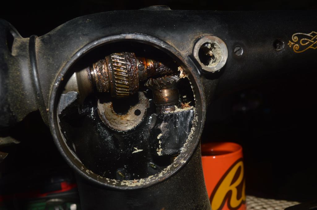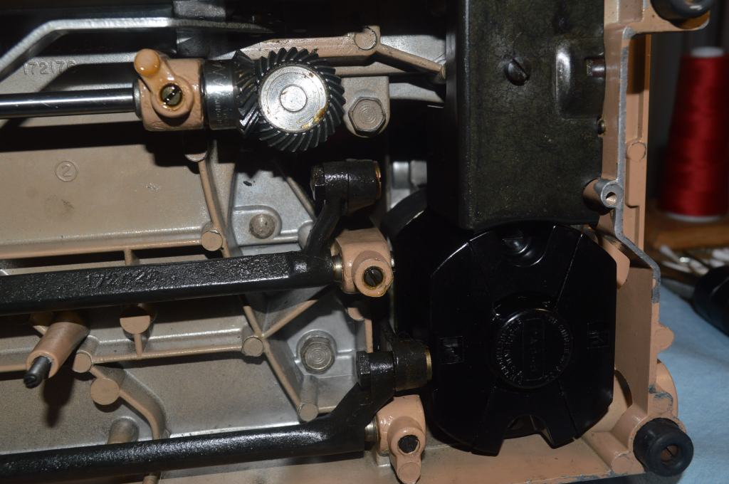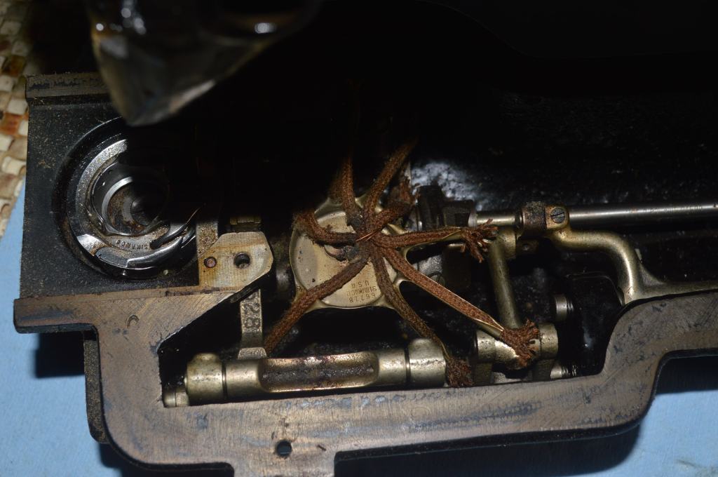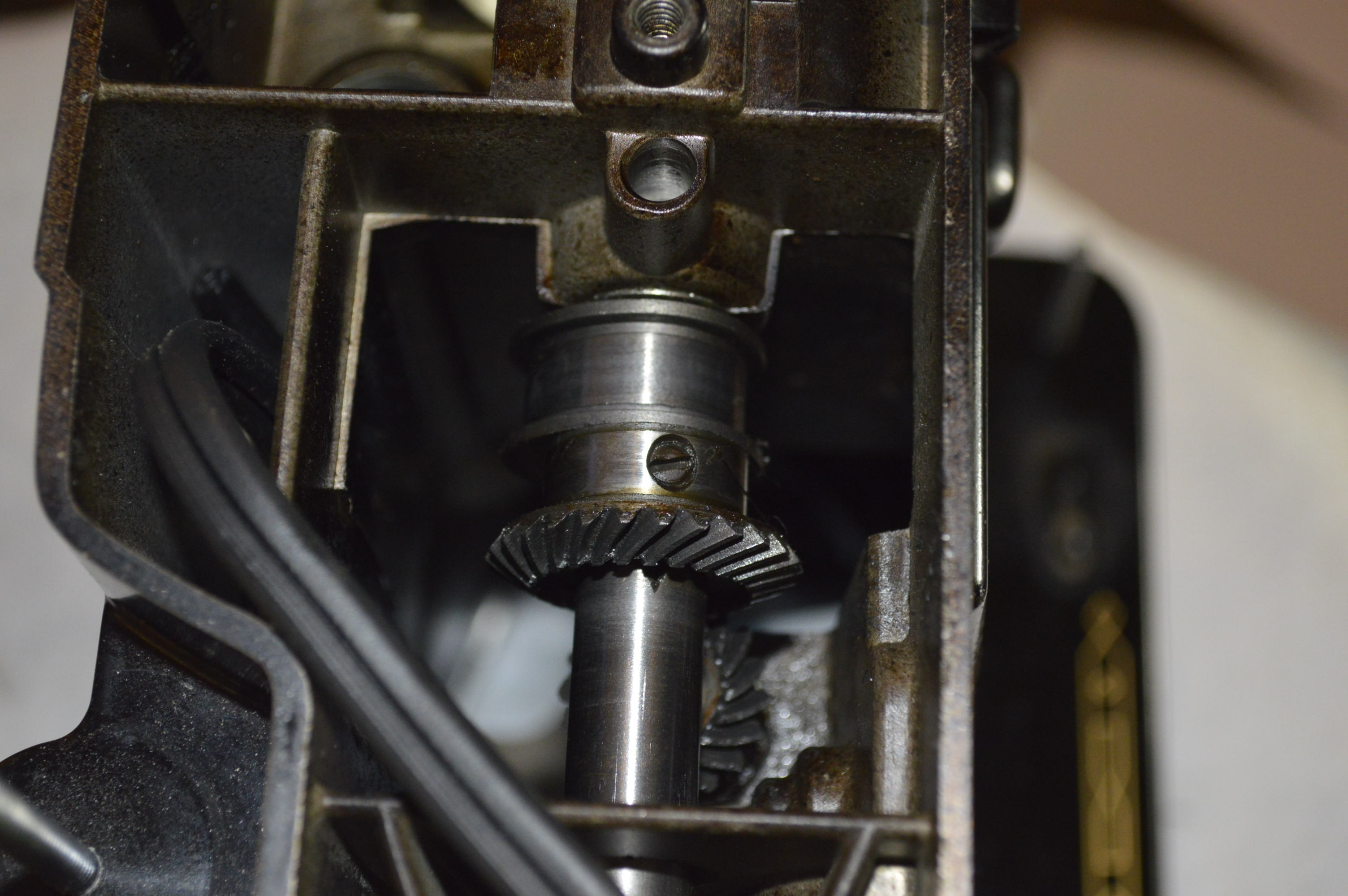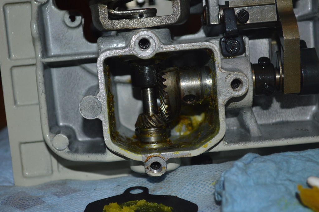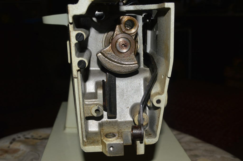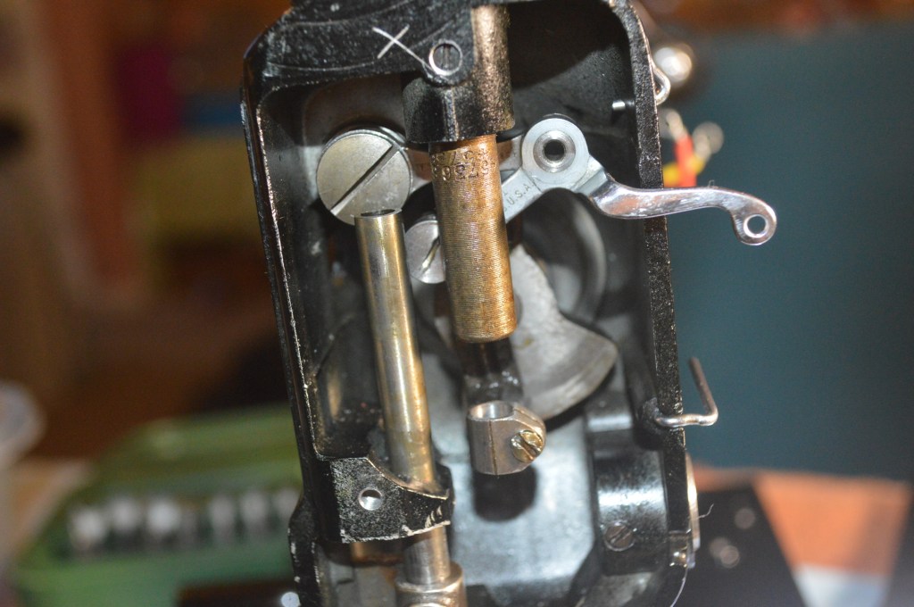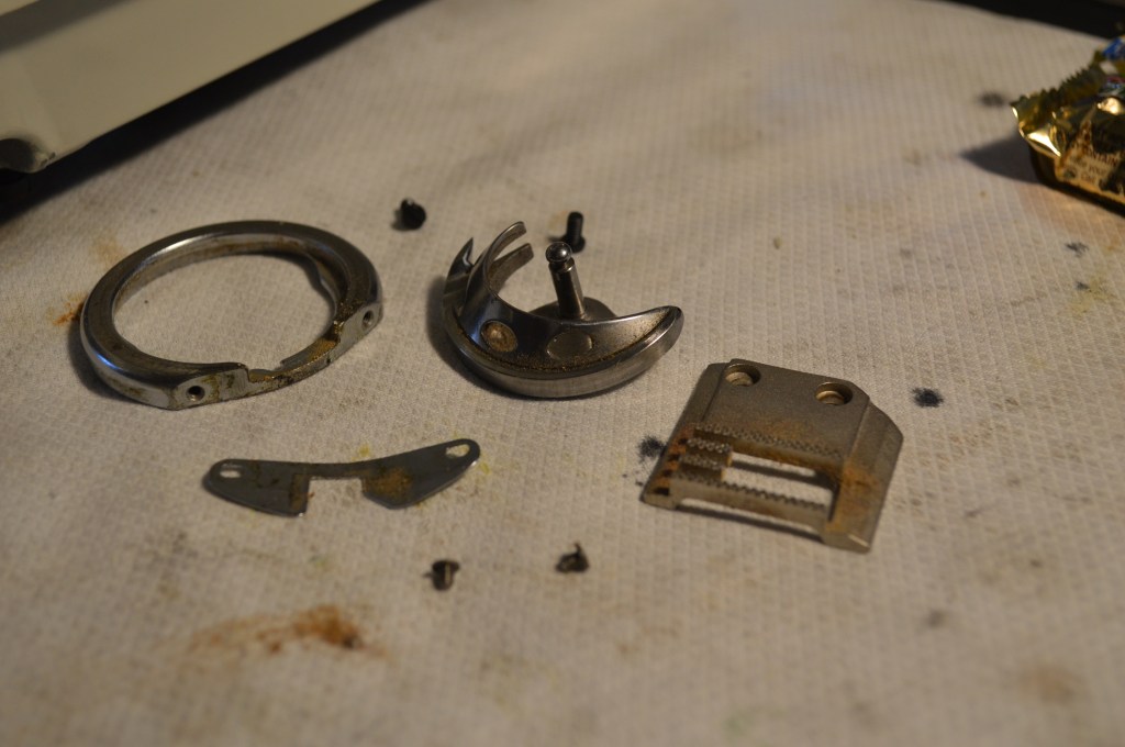 The plan included the disassembly of the top shaft and stitch length fork… The following picture convinced me not to attept this.