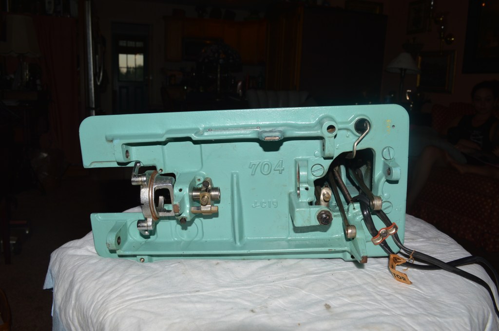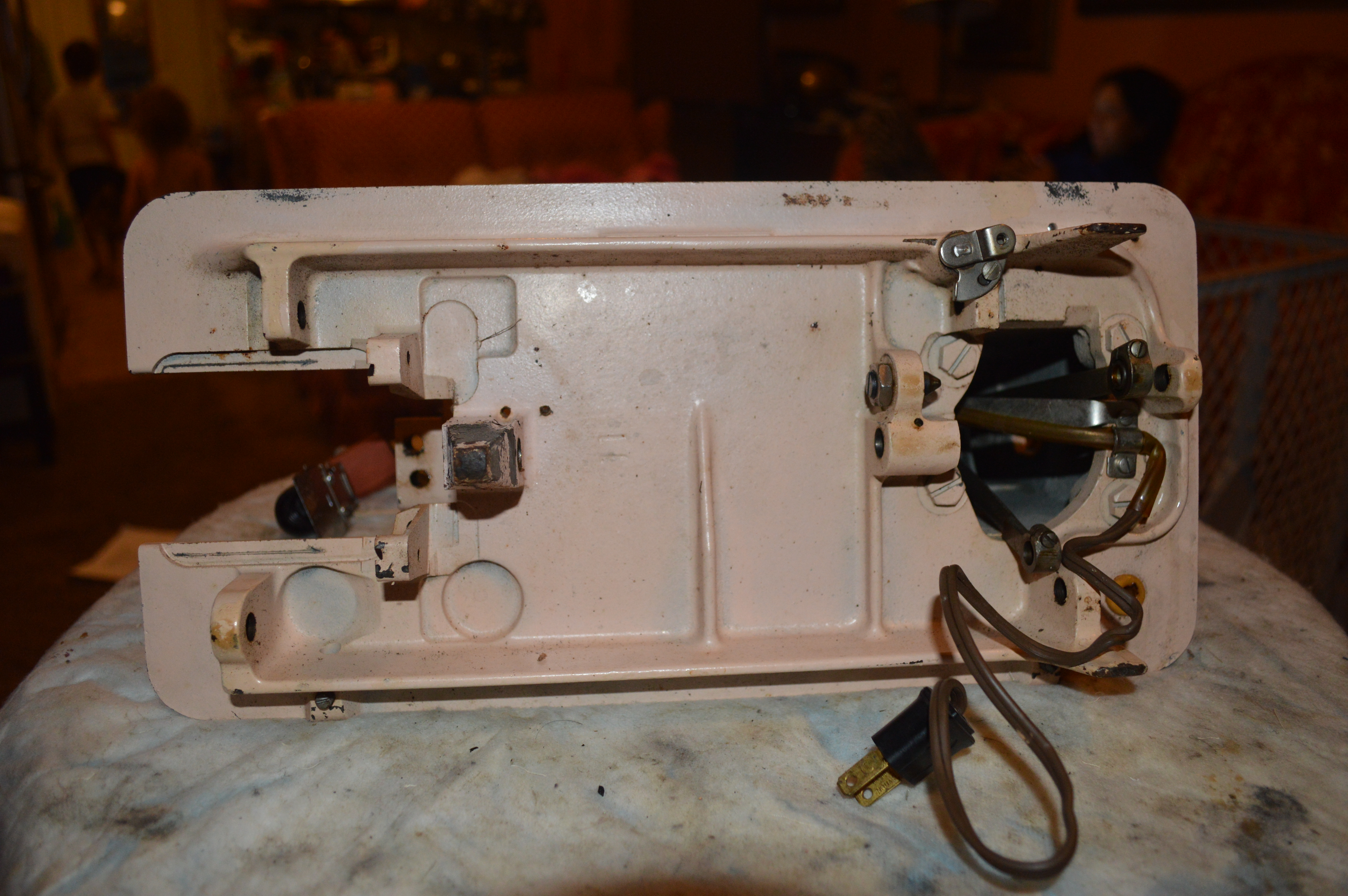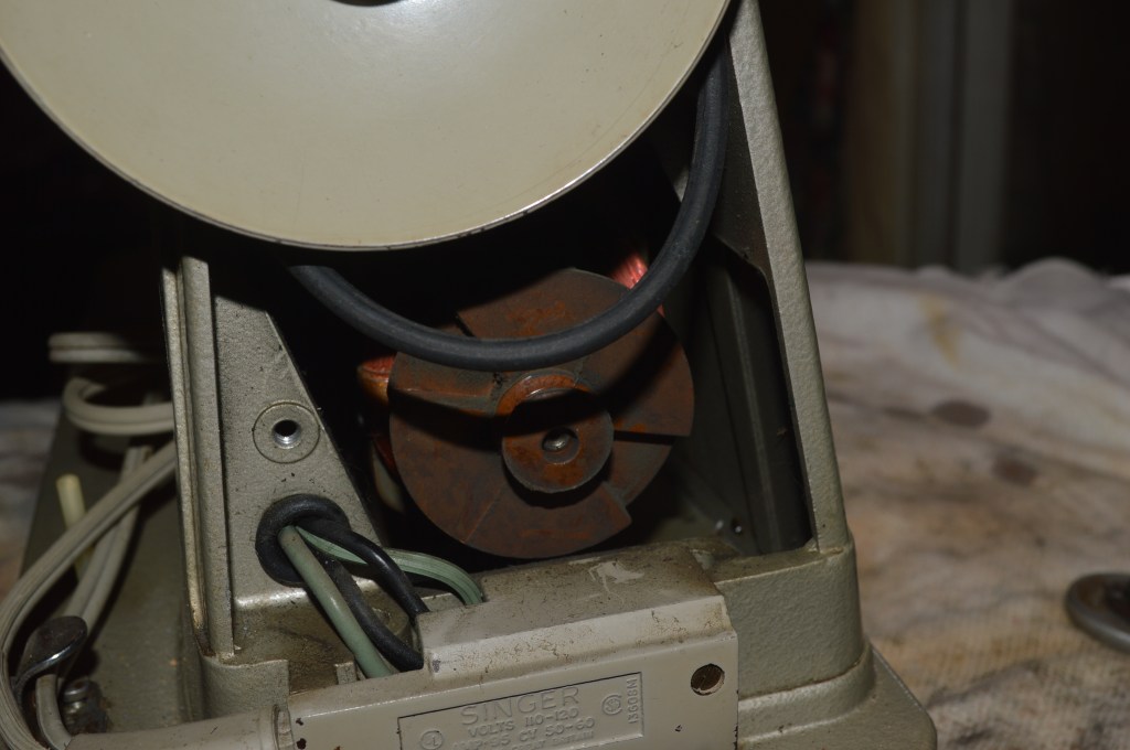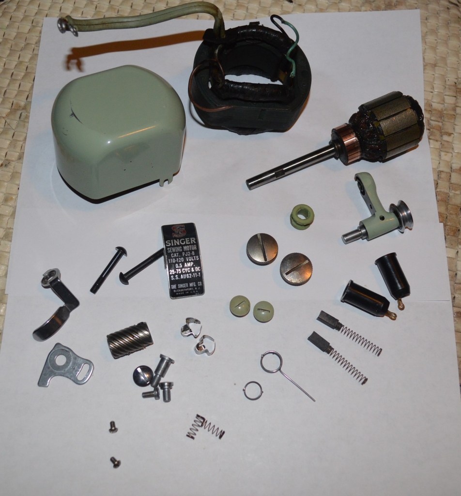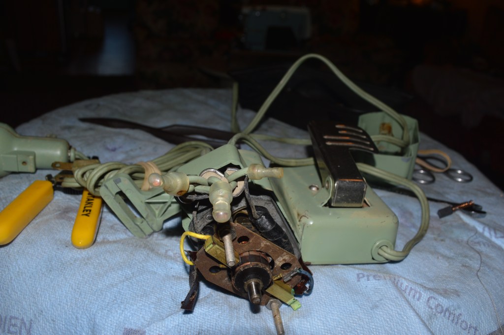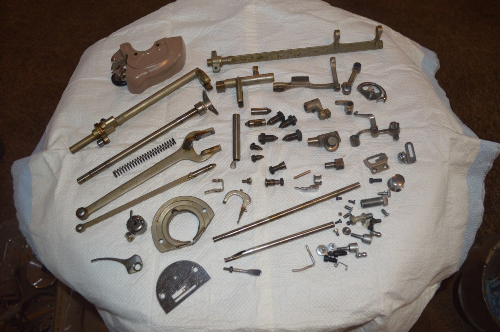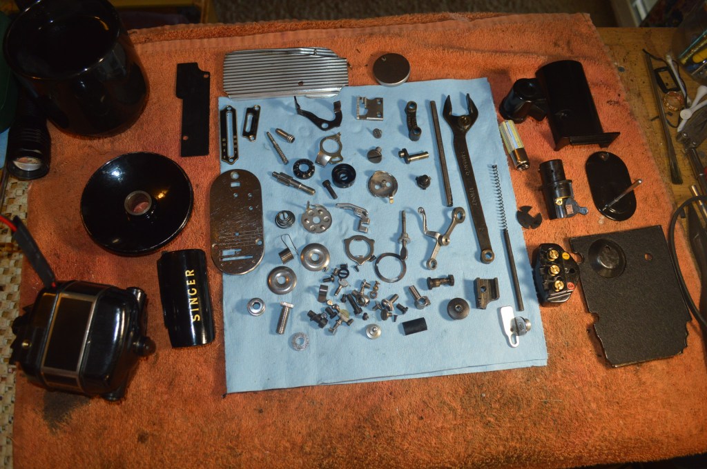 As usual, the machine will be disassembled to the greatest extent possible. Each piece will be cleaned and wire brushed to like new condition. The needle bar, presser foot bar, and the bottom bobbin hook shaft will be polished, and all of the chrome plated parts will be polished. The machine will be deep cleaned, and paint repairs will be made with custom mixed color matched paint. The motor will be disassembled, and for this machine, a replacement vintage foot controller will be provided and the main power wiring will be replaced. So, let me get started!