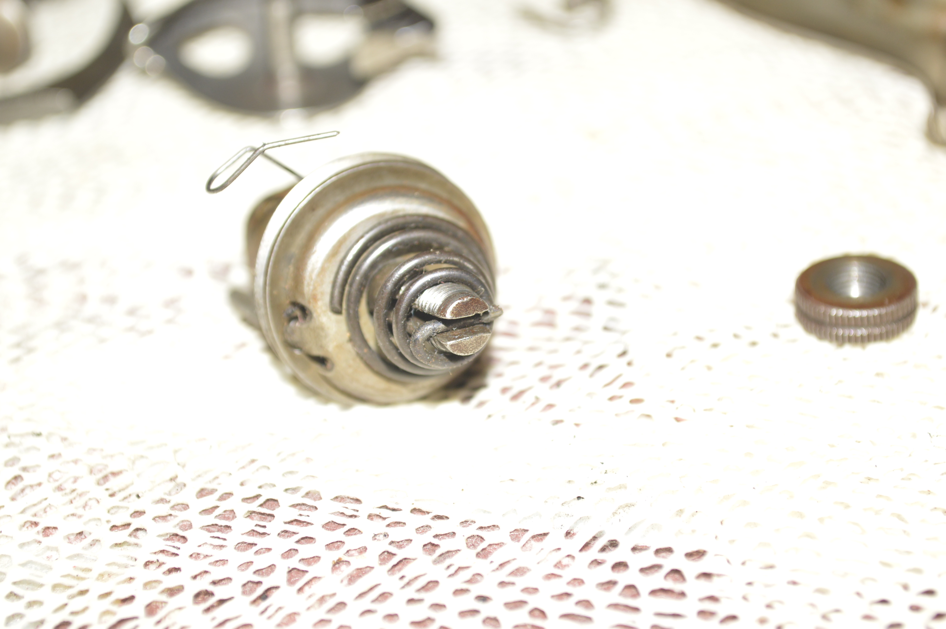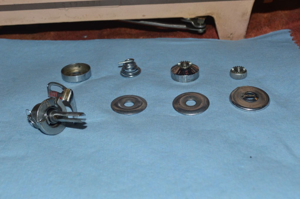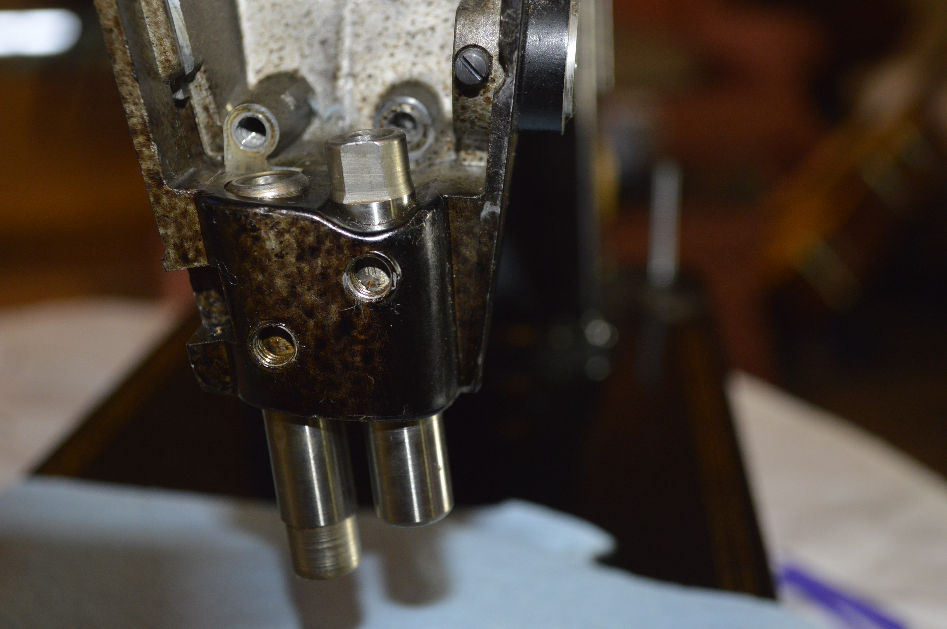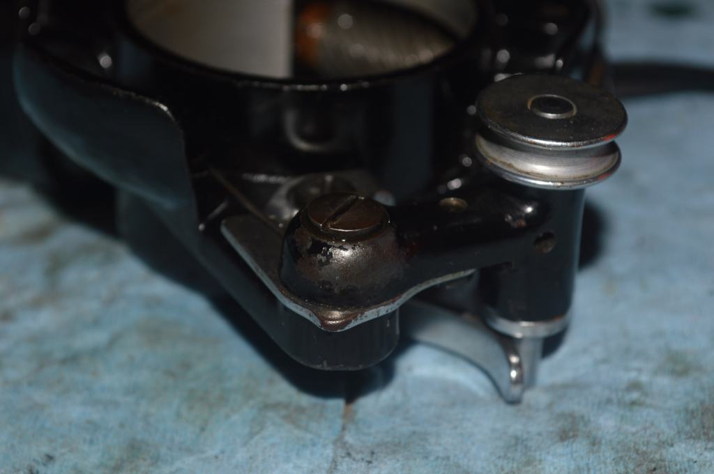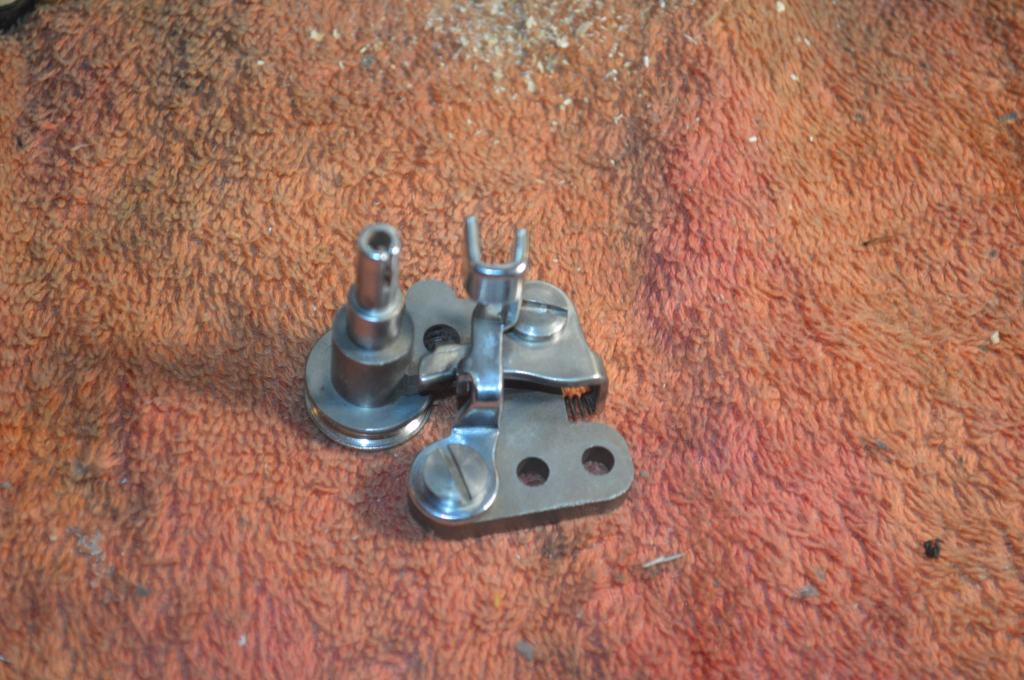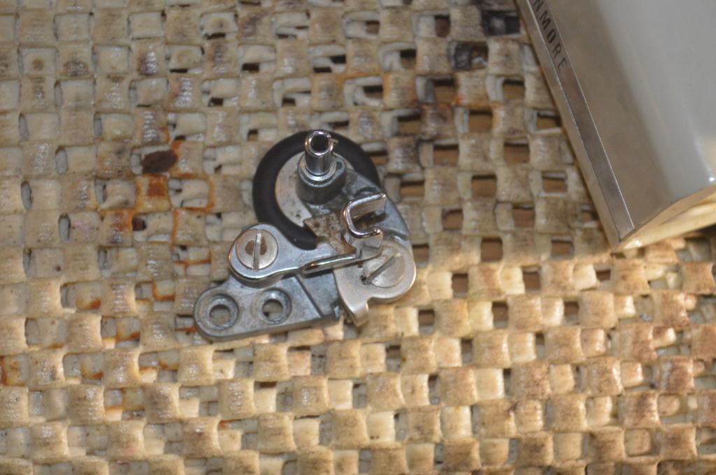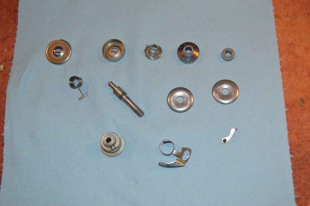 Next is the top tension control restoration. The tension discs and the tension disc shaft are polished. Everything else is cleaned. This will assure a smooth thread path and even thread tension.