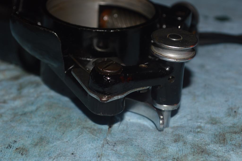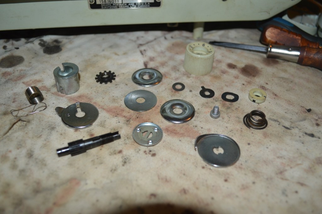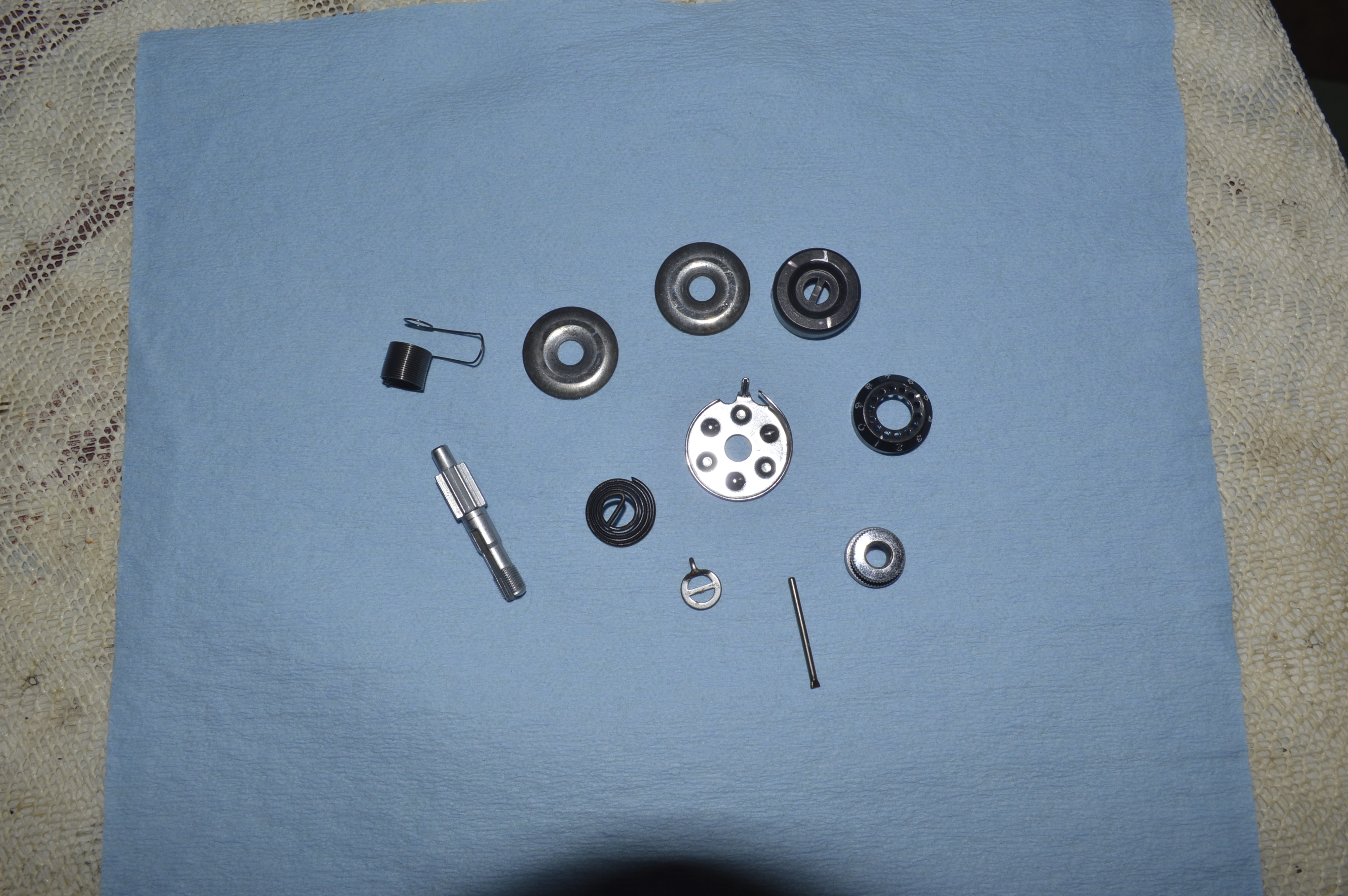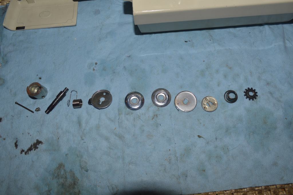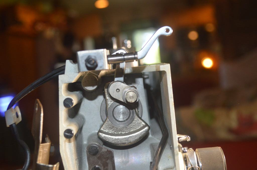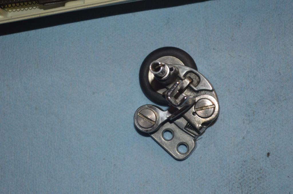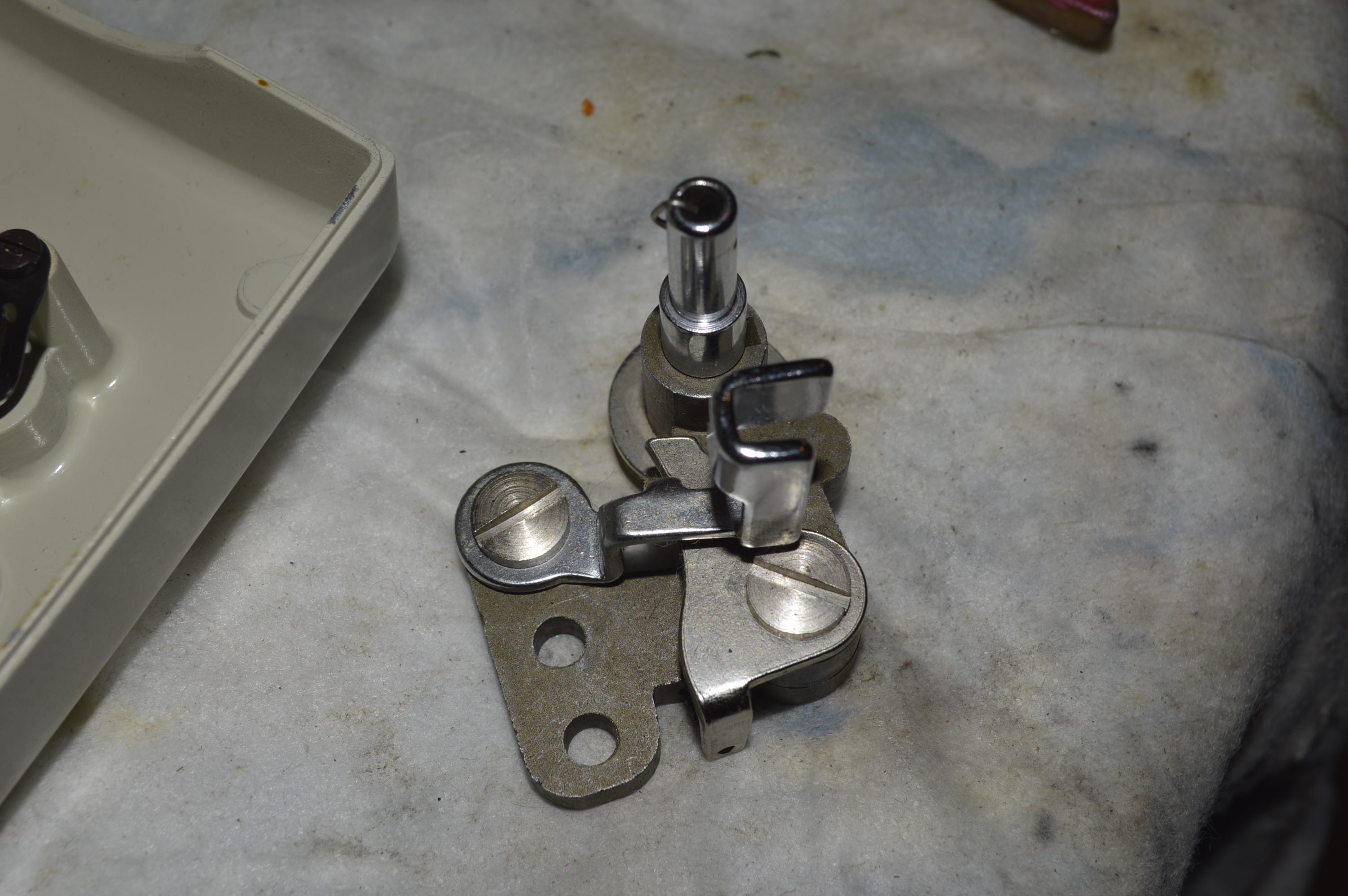 Next is the top tension control restoration. The tension discs and the tension disc shaft are polished. Everything else is cleaned. This will assure a smooth thread path and even thread tension.