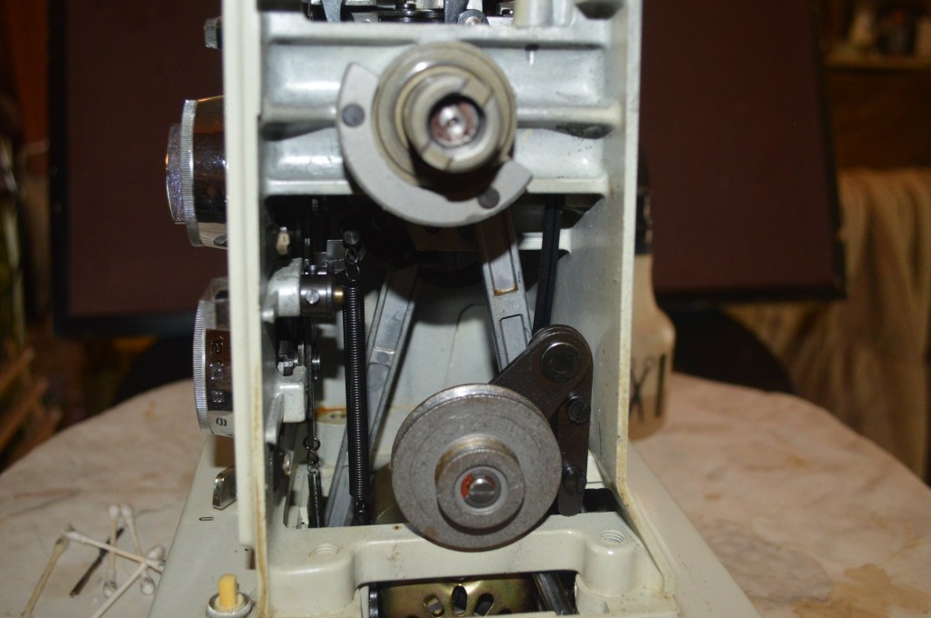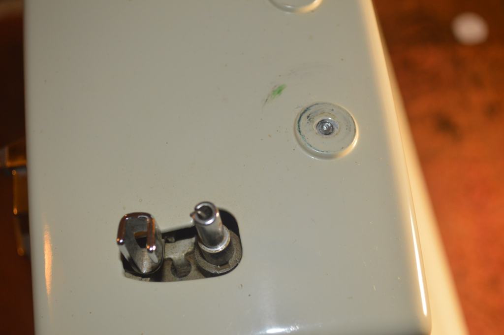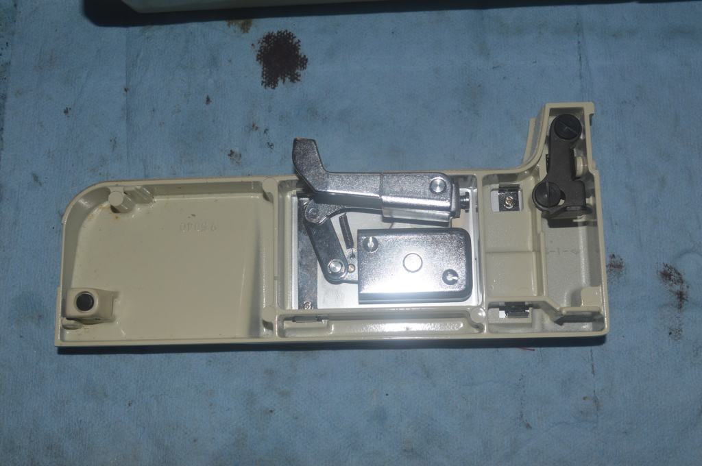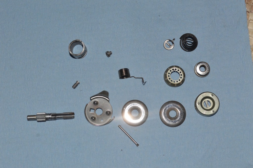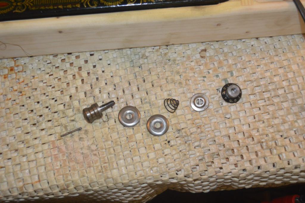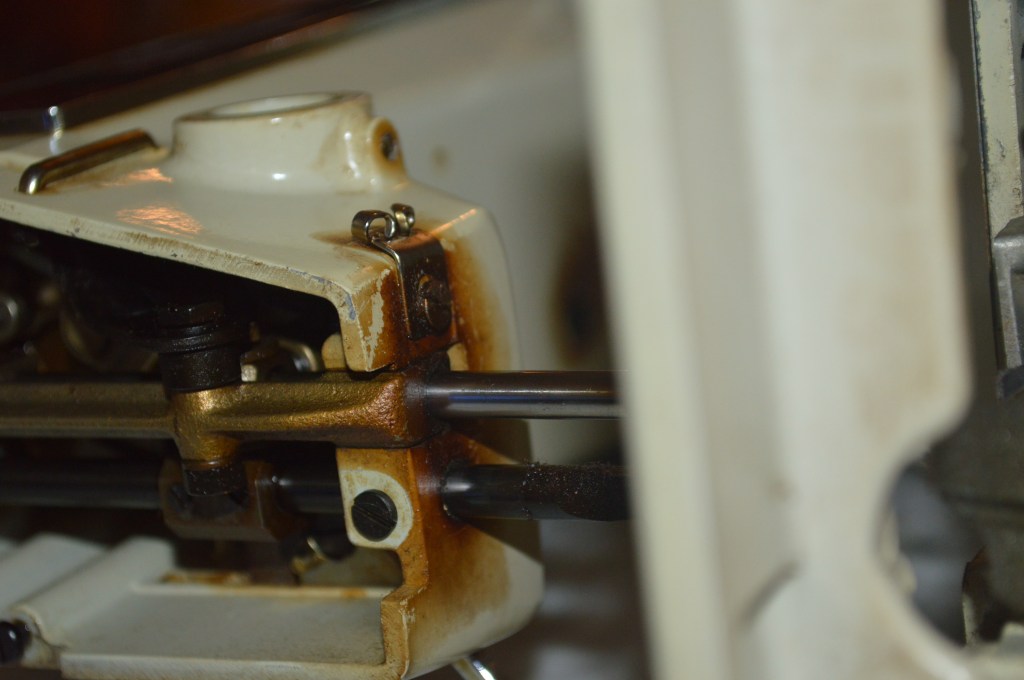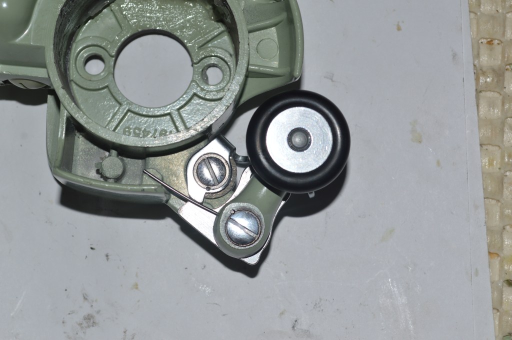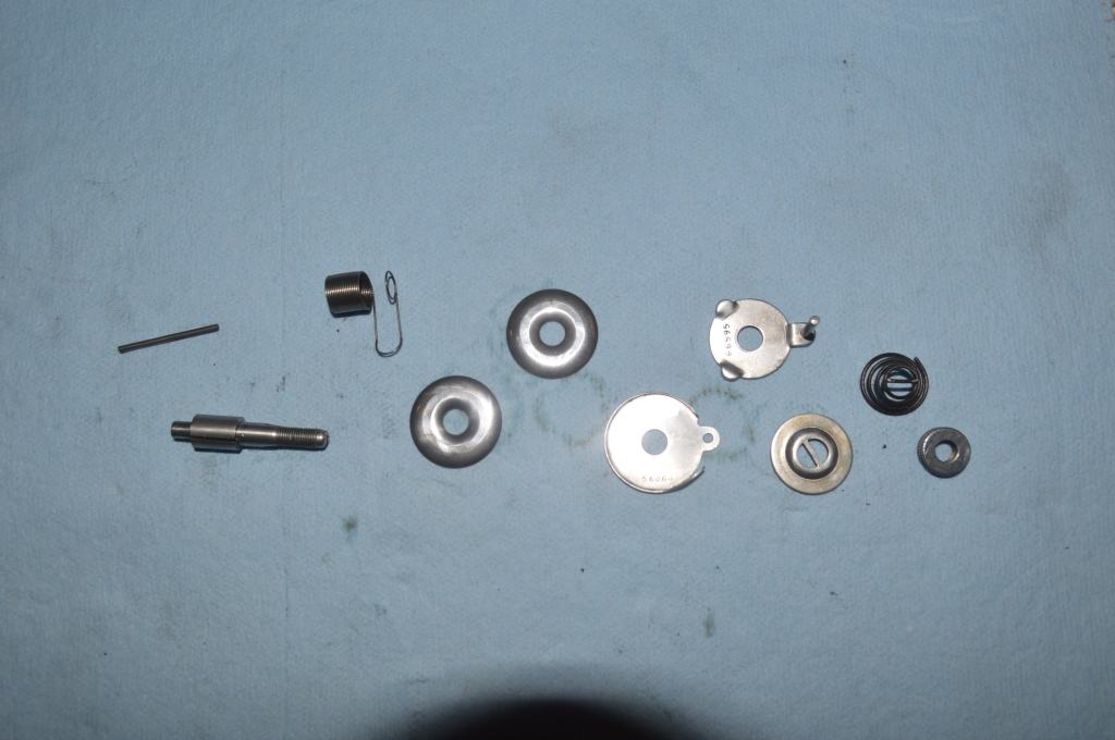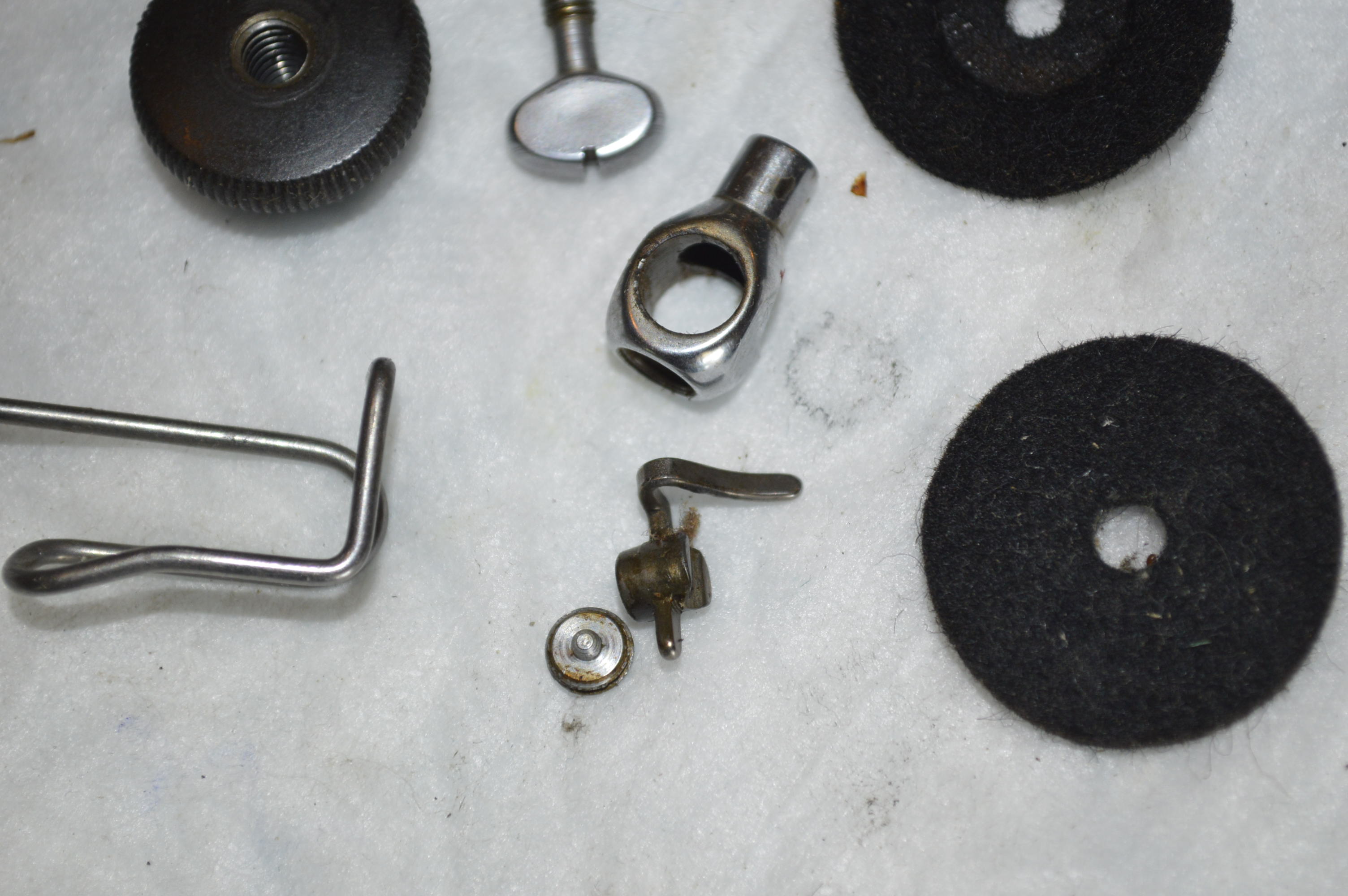 Next is the top tension control restoration. The tension discs and the tension disc shaft are polished. Everything else is cleaned. This will assure a smooth thread path and even thread tension.