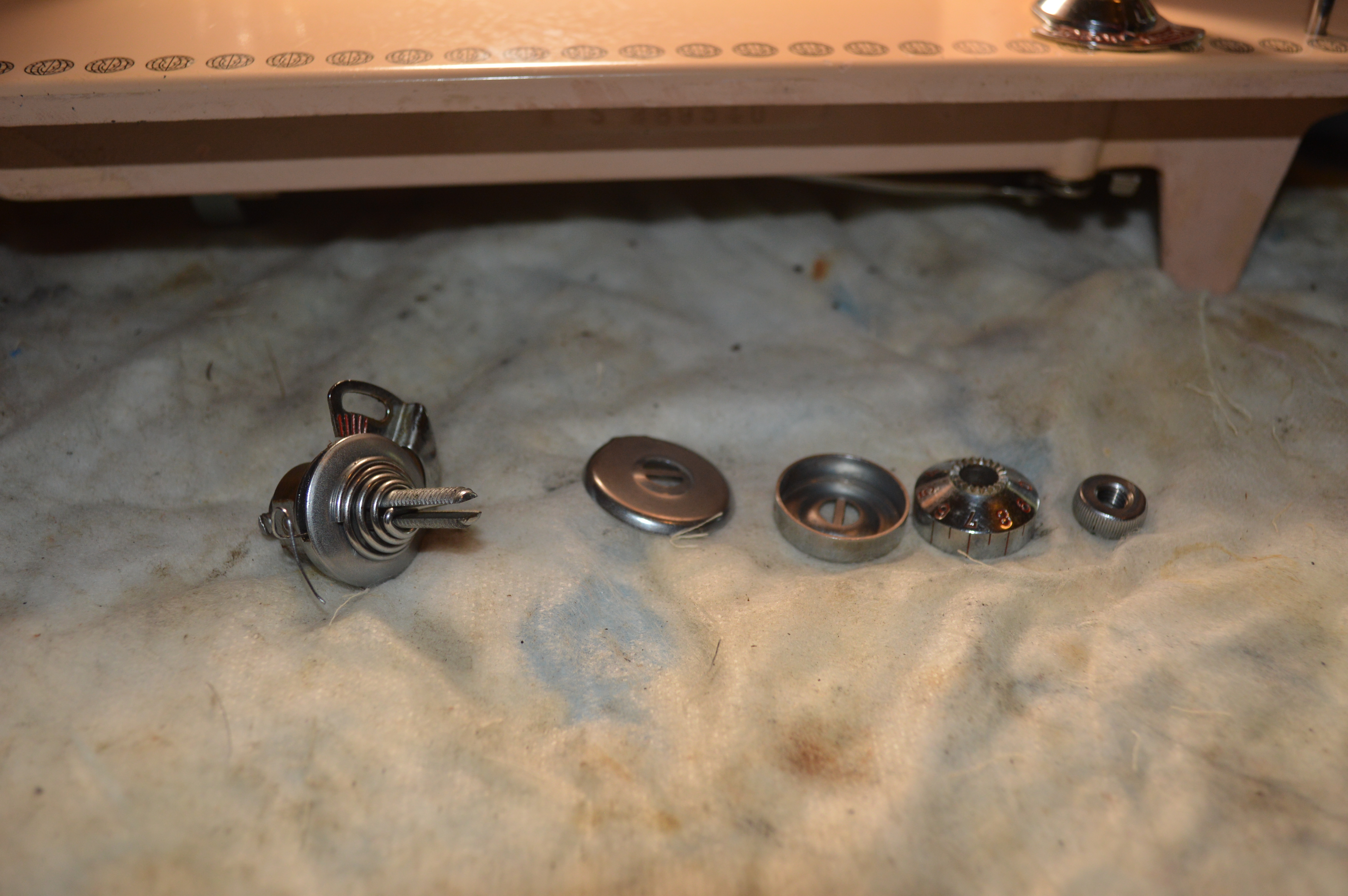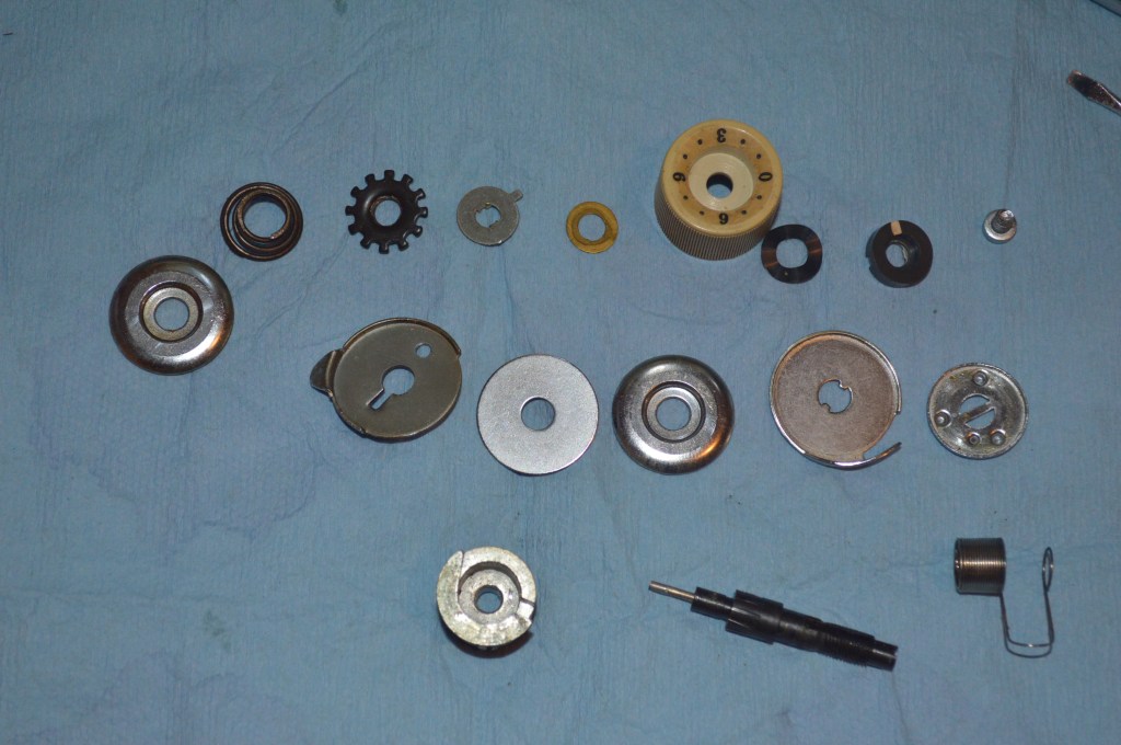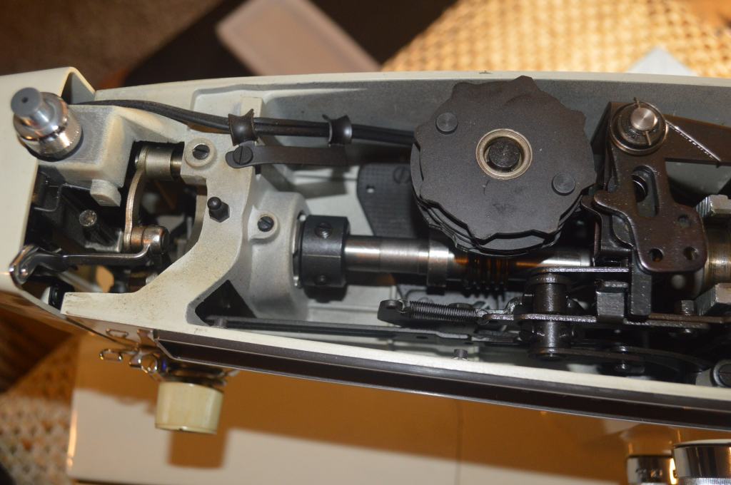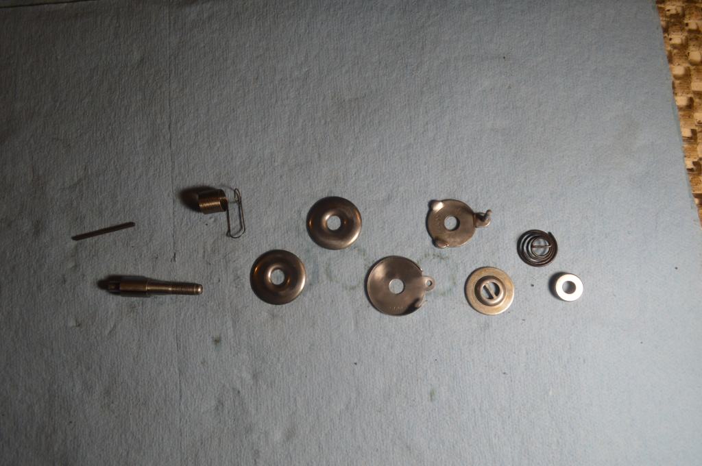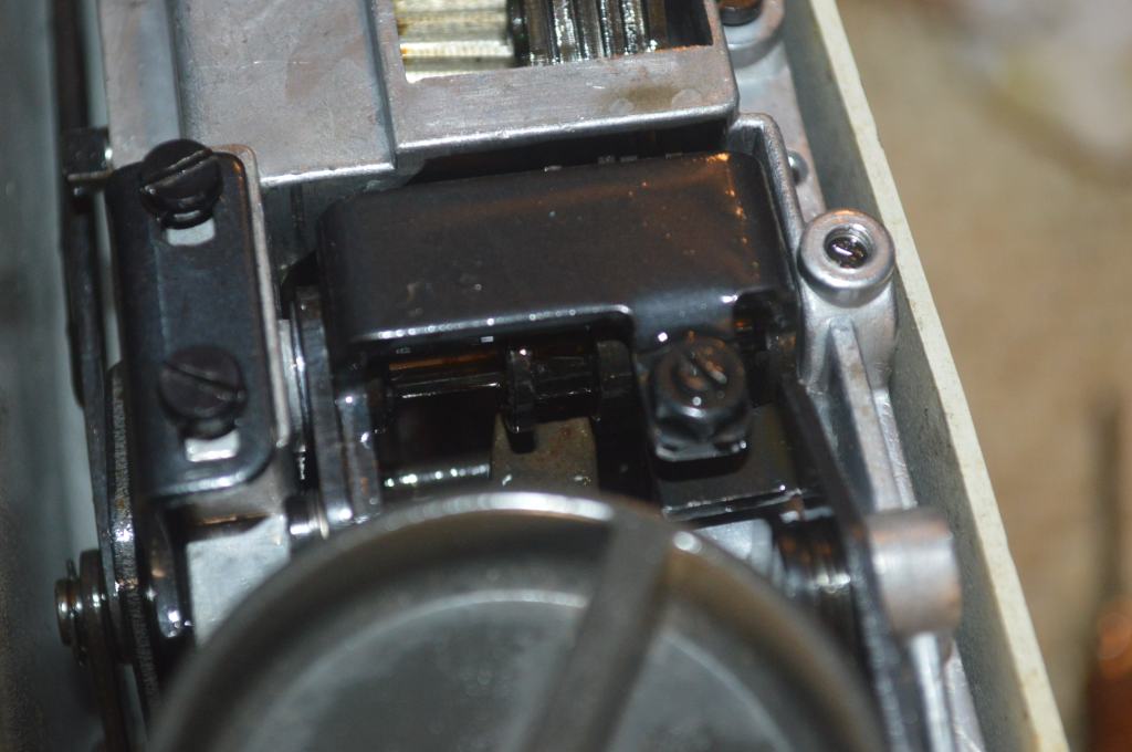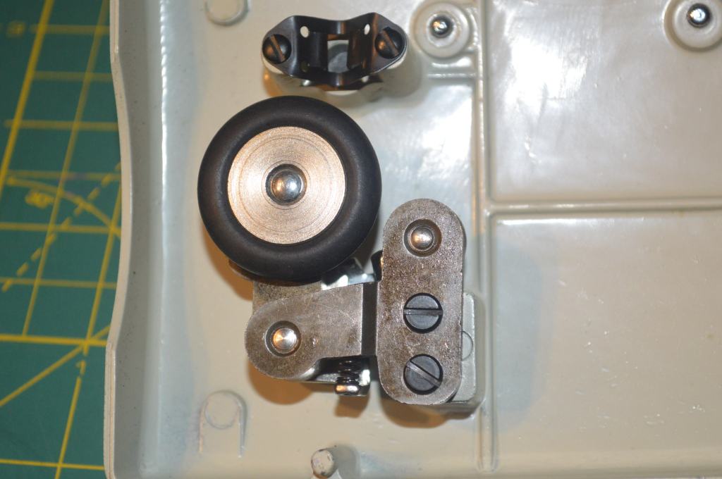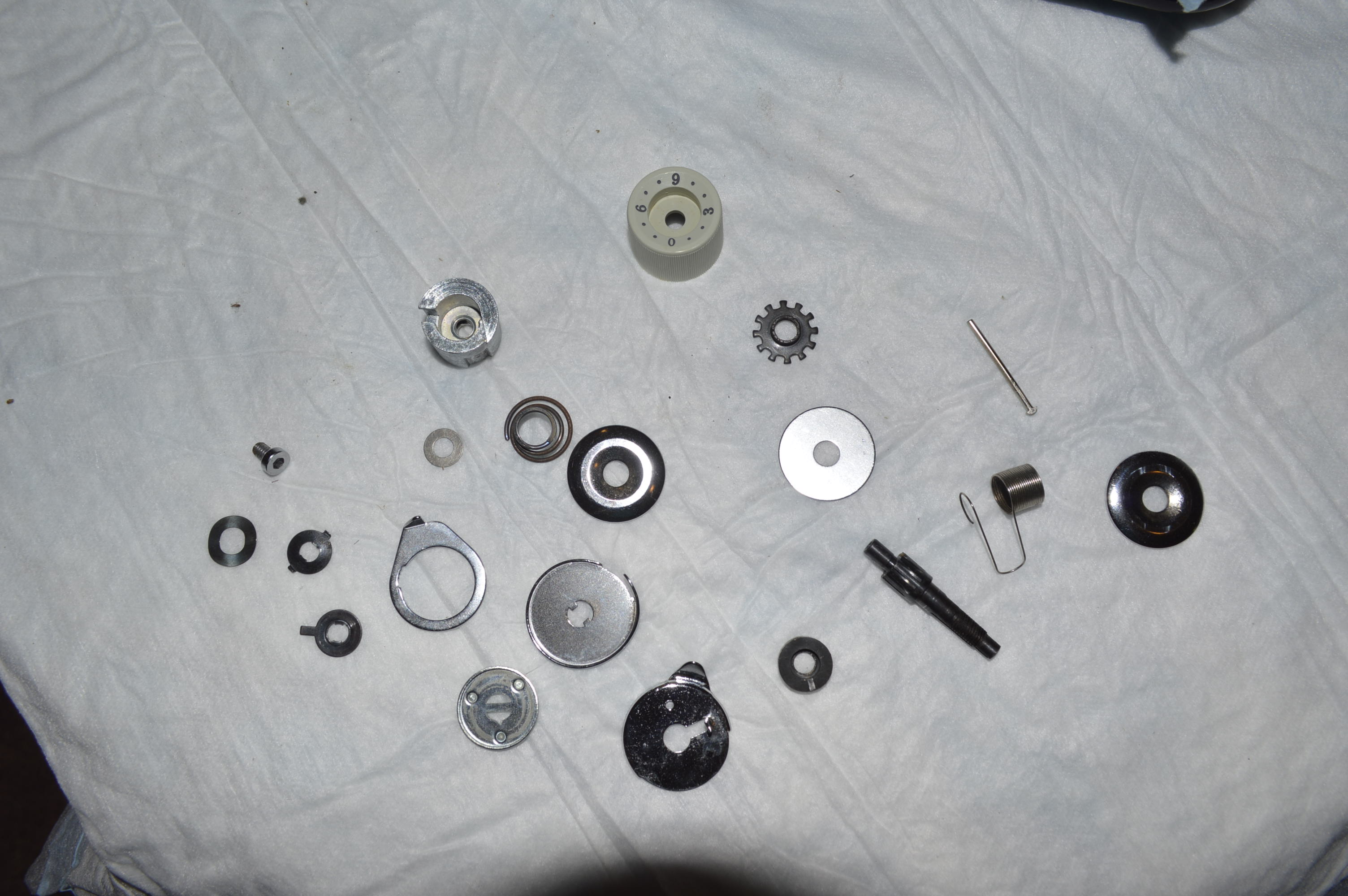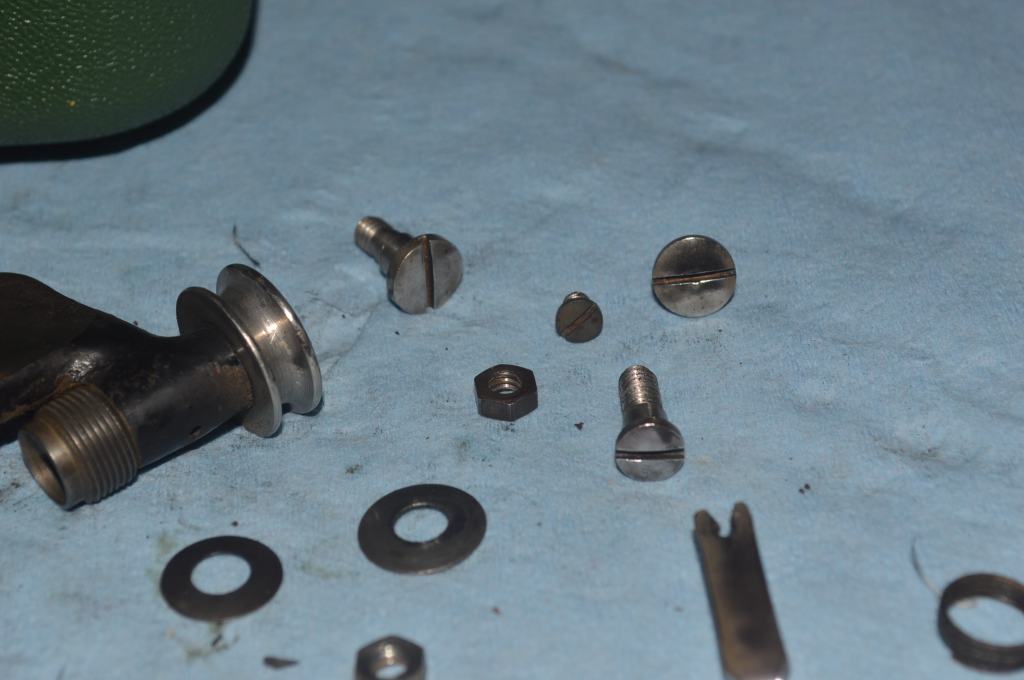 Next is the top tension control restoration. The tension discs and the tension disc shaft are polished. Everything else is cleaned. This will assure a smooth thread path and even thread tension.